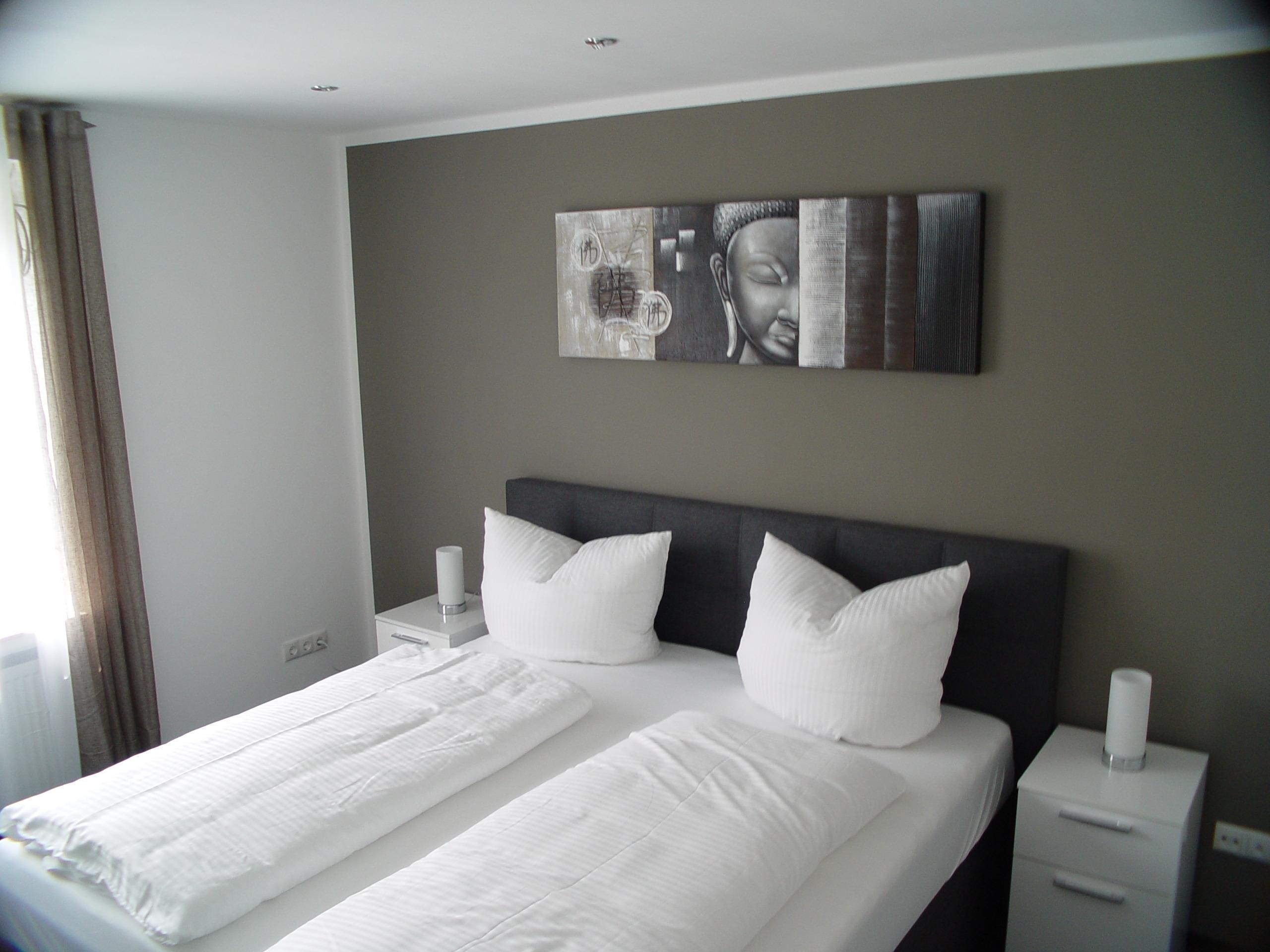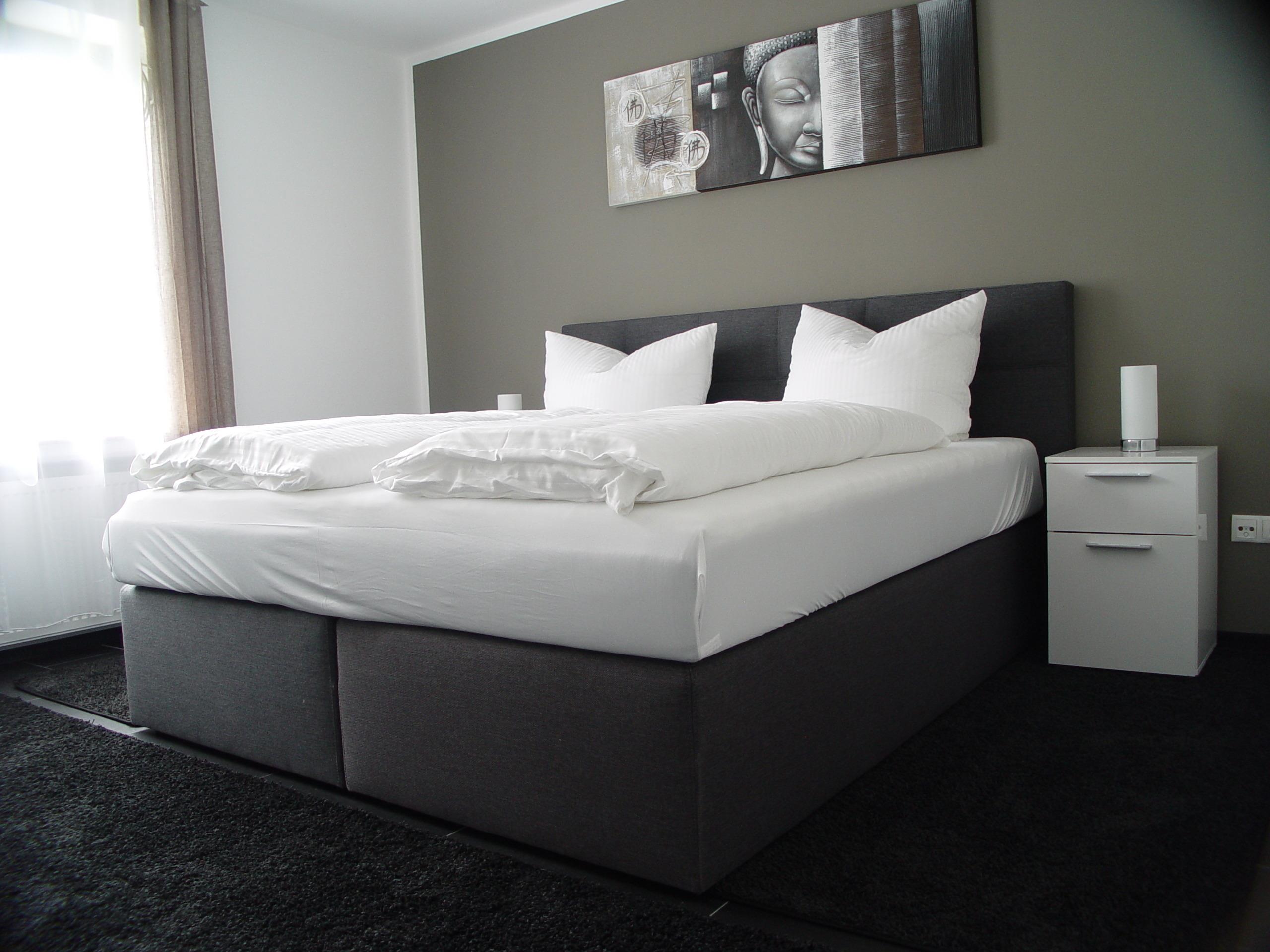 Auf knapp 18 qm erwartet Sie ein gemütliches Kingsize Boxspringbett (1.800 x 2.000 mm), das auch als Einzelbetten (2x 900 x 2.000 mm) nutzbar ist, sowie ein 2.800 mm Schwebetürenschrank, der Ihnen ausreichend Stauraum bietet.