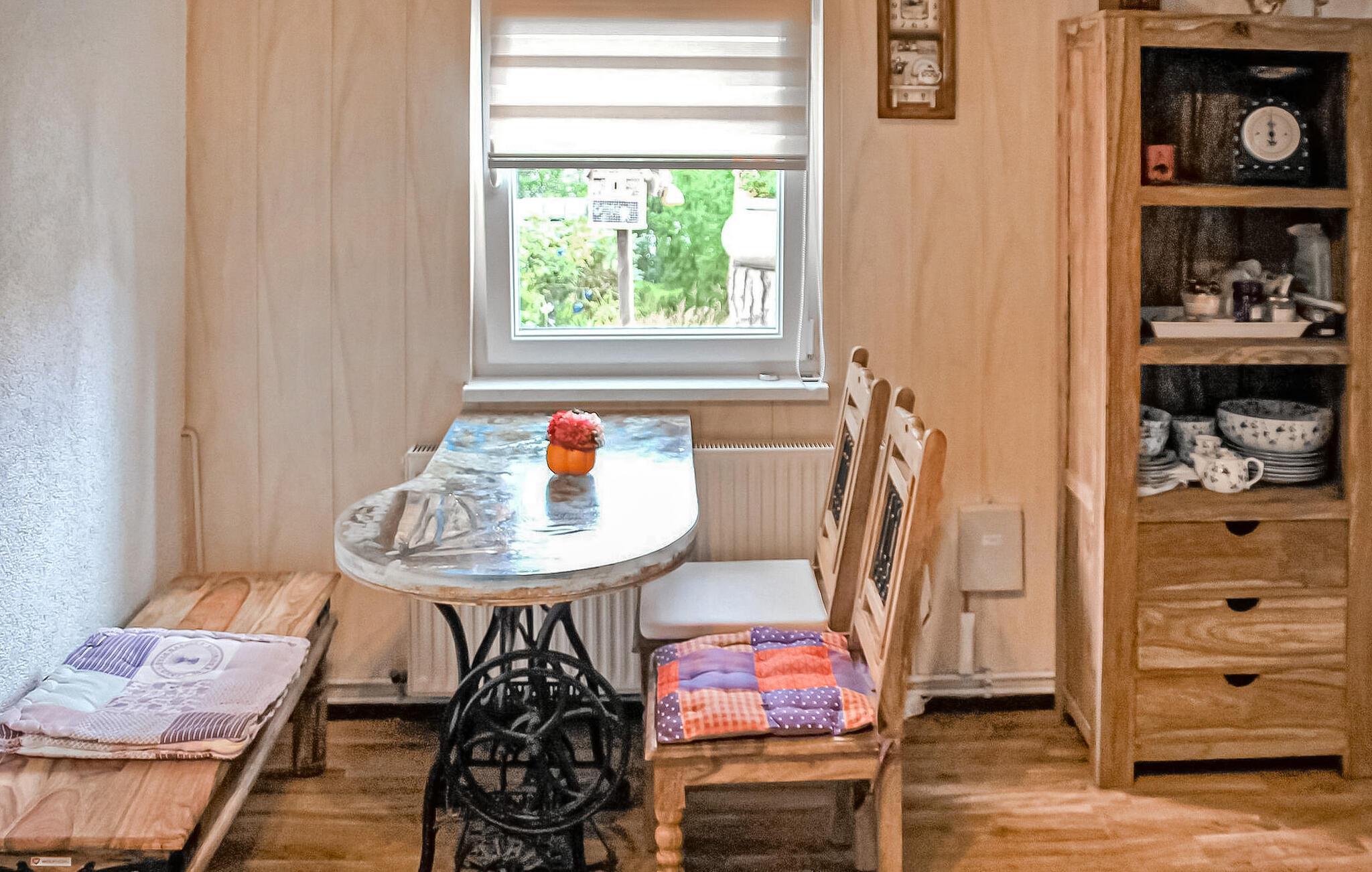 Det moderniserede feriehus ligger på en 500 kvm separat fritidsejendom i direkte skovbeliggenhed, kun ca 80 m fra strandpromenaden. Den er udstyret med en stue (polstret opholdsområde, TV, radio), soveværelse (3 polstrede liggestole), åben spisestue med pejs, tekøkken (elkomfur, køleskab og mikroovn), bruser/toilet, centralvarme. Der er terrasse med opholdsområde, grill, cykelkælder og parkeringsplads på ejendommen. Den samlede pris inkluderer slutrengøring, sengelinned samt vand- og energiforbrug Medbring gerne egne håndklæder. Betales på stedet: spaskat. I denne ejendom er to hunde tilladt op til en maksimal højde på 40 cm. Lubmin er en badeby på Greifswalder Bodden i et smukt skovlandskab. Der er cirka 20 km til hansestaden Greifswald. Byen har en mole med anløbsbro, et moderne sportscenter, en bred sandstrand (også nudist), cykel- og vandcykeludlejning samt forskellige spise- og salgsfaciliteter. Ponyridning og vognture er mulige.