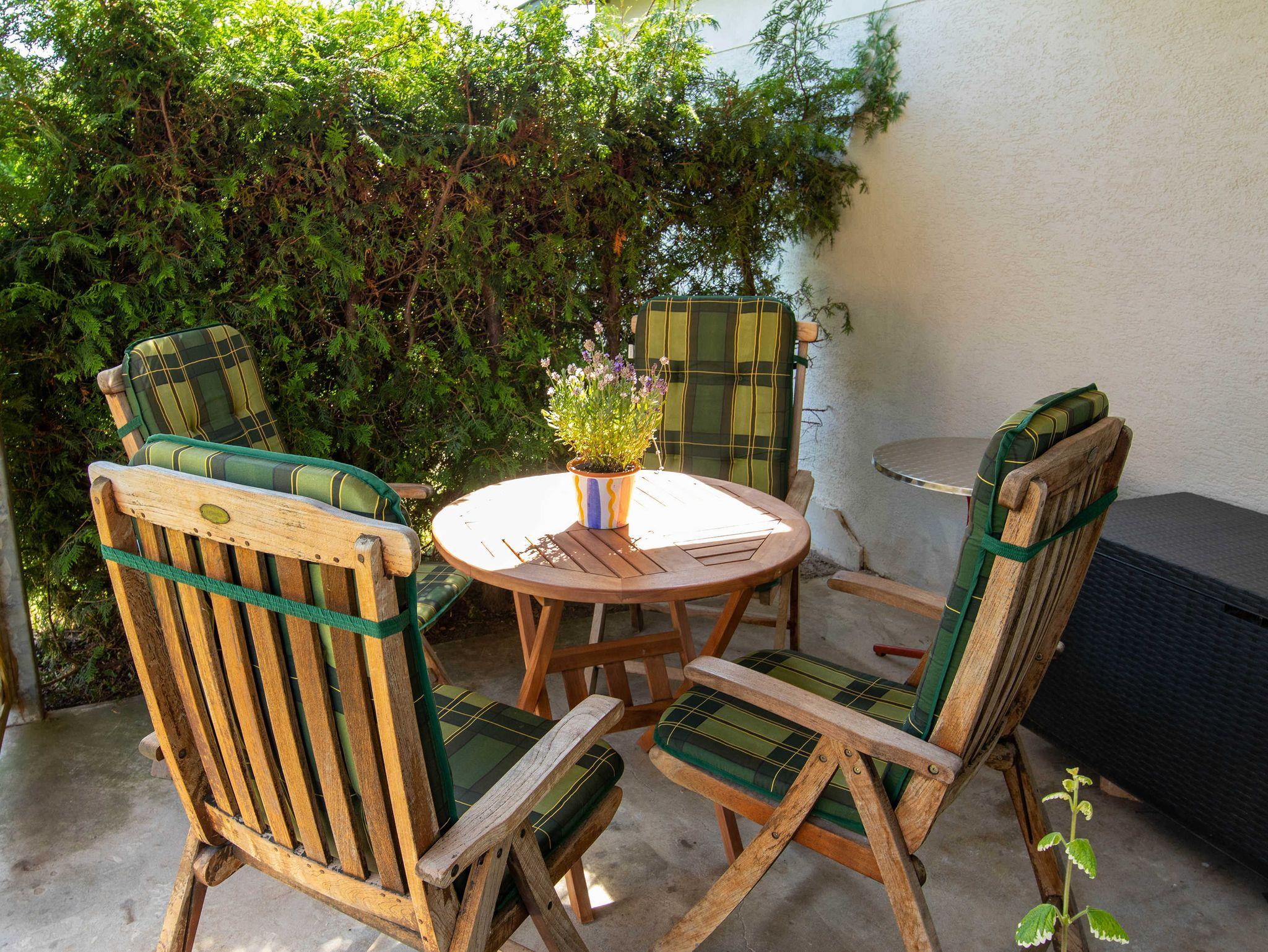 Die Wohnung ist über einen ebenerdigen Eingang zu erreichen und verfügt über drei Zimmer. Die beiden Schlafzimmer sind mit je zwei Einzelbetten (90x200cm) ausgestattet, in einem Schlafzimmer sind diese zu einem Doppelbett zusammengestellt. Der dritte Raum ist eine Wohnküche mit Kaffeemaschine, Mikrowelle, Wasserkocher, Kühlschrank, Herd mit Backofen. Ein Esstisch bietet Platz für vier Personen und in den angrenzenden Sitzgruppe mit TV kann man die Abende ausklingen lassen.