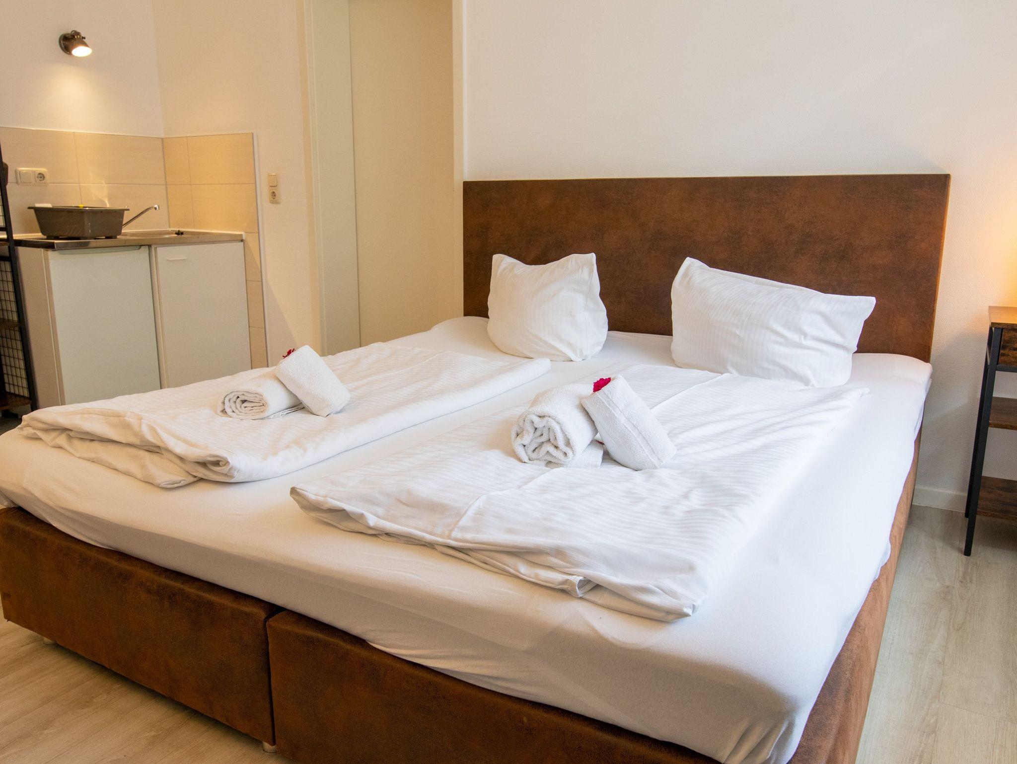 Das ca. 20 m² große Doppelzimmer befindet sich im Haupthaus der Ferienanlage. Es verfügt über einen kombinierten Wohn- und Schlafraum mit Doppelbett, eine integrierten Pantryküche sowie ein Bad mit Dusche und WC. Auch eine möblierte Terrasse kann genutzt werden. Das Zimmer eignet sich für bis zu 2 Personen. Zusätzlich kann ein Kinderbett für ein Kleinkind (bis 3 Jahre) aufgestellt werden. Kinderbett, Hochstuhl, Wäschepaket sowie ein Parkplatz sind inklusive.