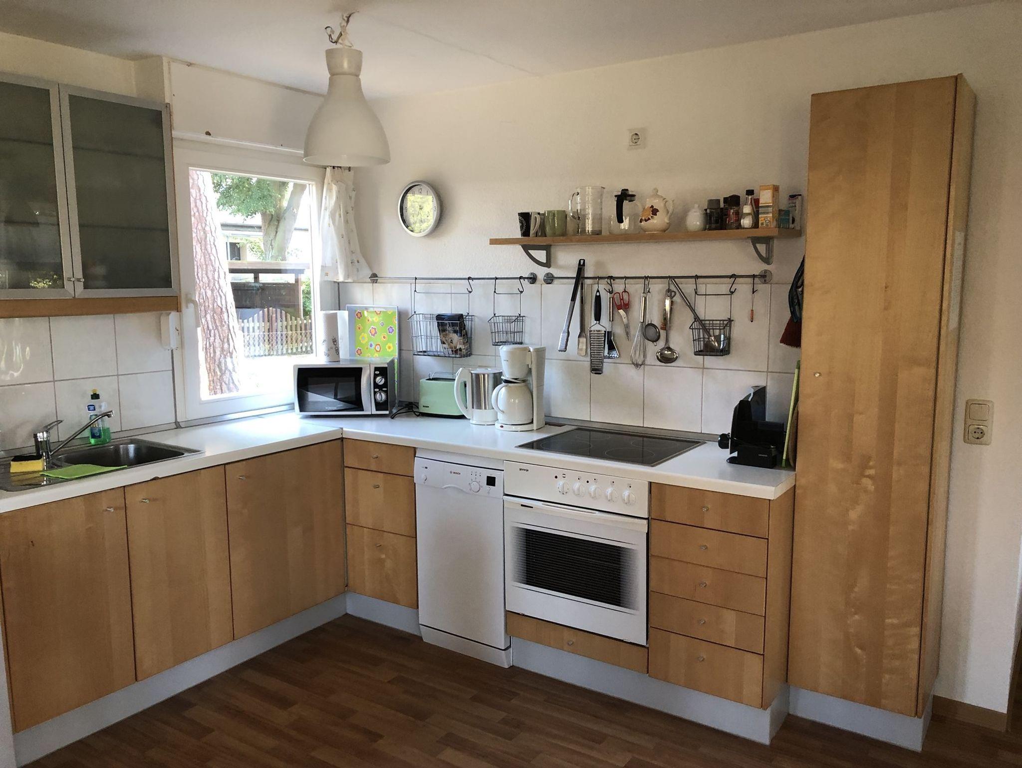 Einbauküche mit Kühlschrank/Gefrierfach, Backofen, Umlufthaube, Geschirrspüler, Kaffeemaschine, Wasserkocher, Toaster, Sitzecke für 4 Personen