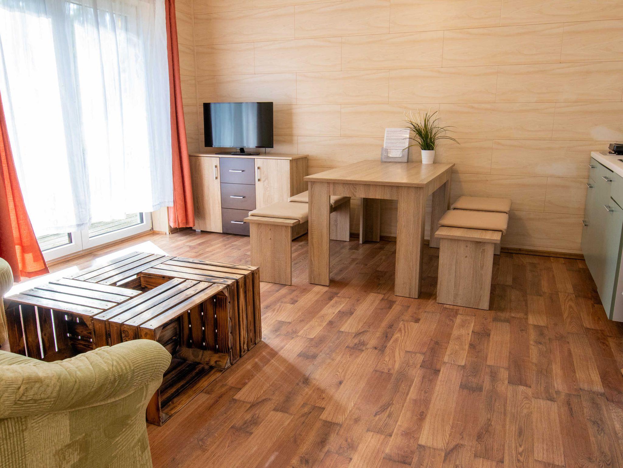 Die ca. 50 m² große Ferienwohnung befindet sich in einem einzeln stehenden Doppelhaus mit Terrasse und Blick zum Wald. Sie verfügt über ein Wohnzimmer mit Miniküche, zwei separaten Schlafzimmern, Flur und Bad.