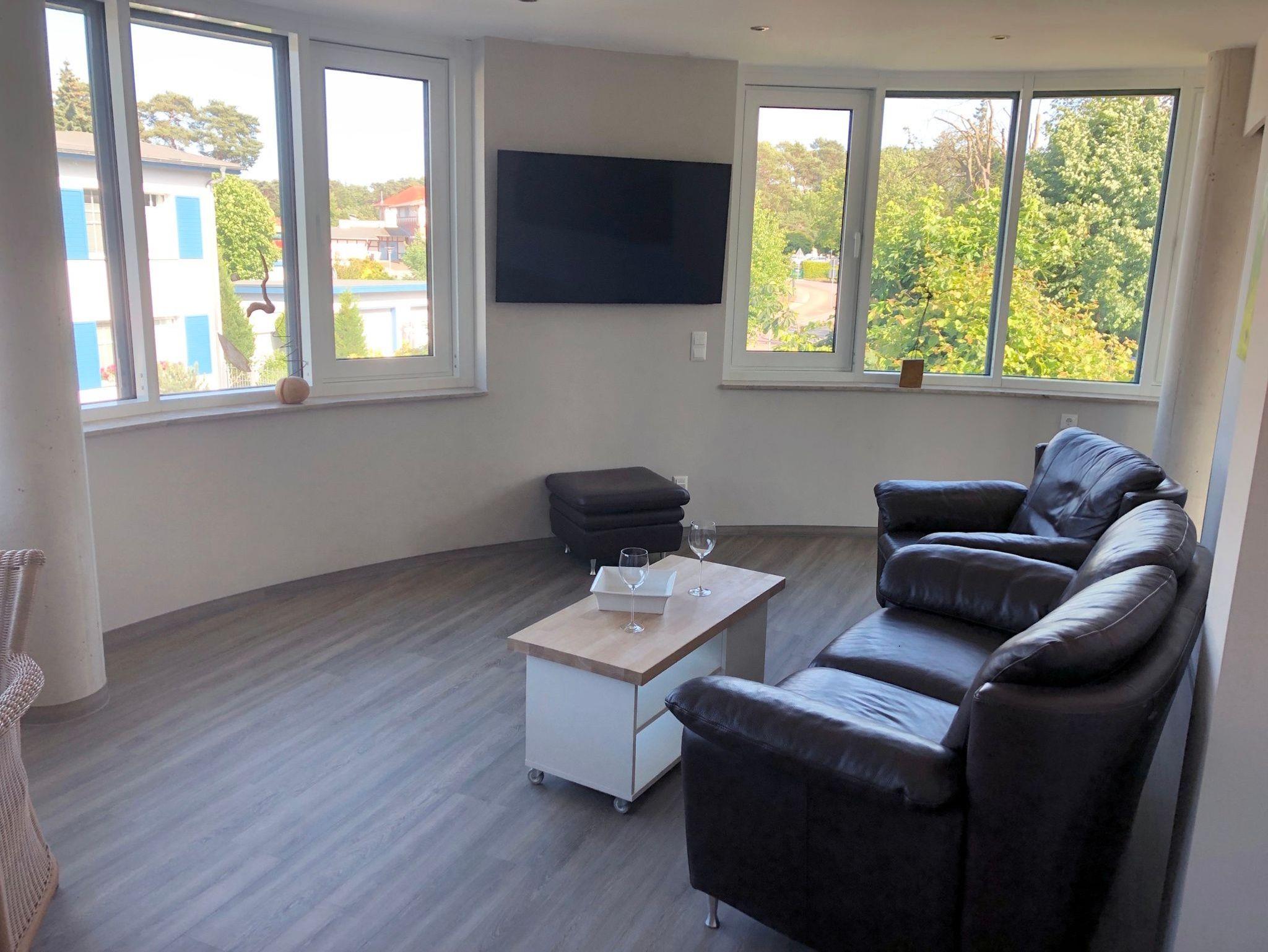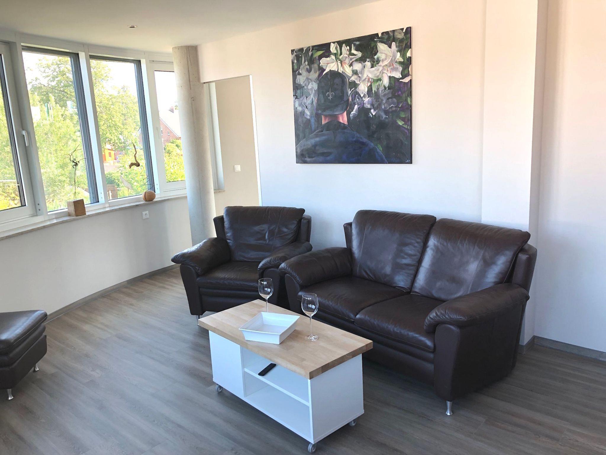 Die Ferienwohnung ist komfortabel und modern eingerichtet. Durch die 3 Seiten- Ausrichtung mit Panoramafront ist die Wohnung sehr hell, wirkt einladend und freundlich. Es gibt einen Balkon zur Ostseite, wo man wunderbar sein Frühstück genießen kann und einen 2. etwas größeren Balkon zur Westseite. Dort kann man von früh bis spät die Sonne genießen. Ein zugehöriger kostenloser PKW- Stellplatz befindet sich direkt neben dem Gebäude.