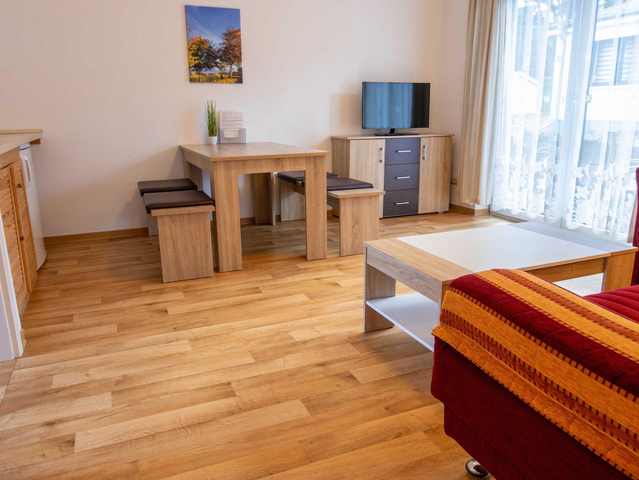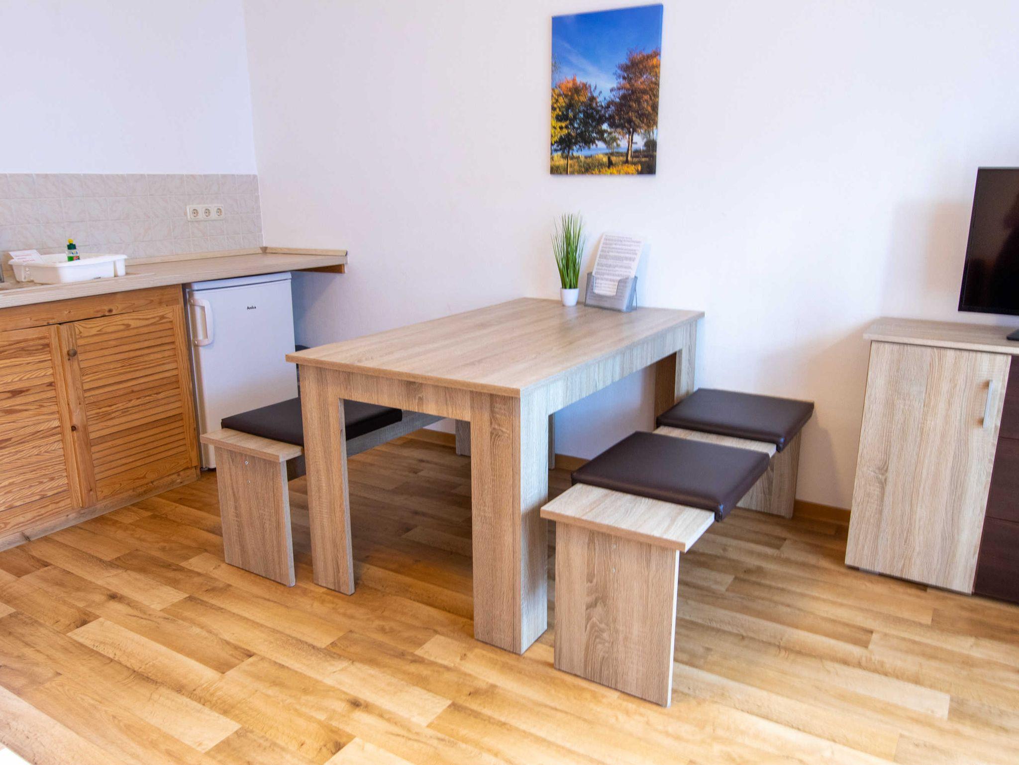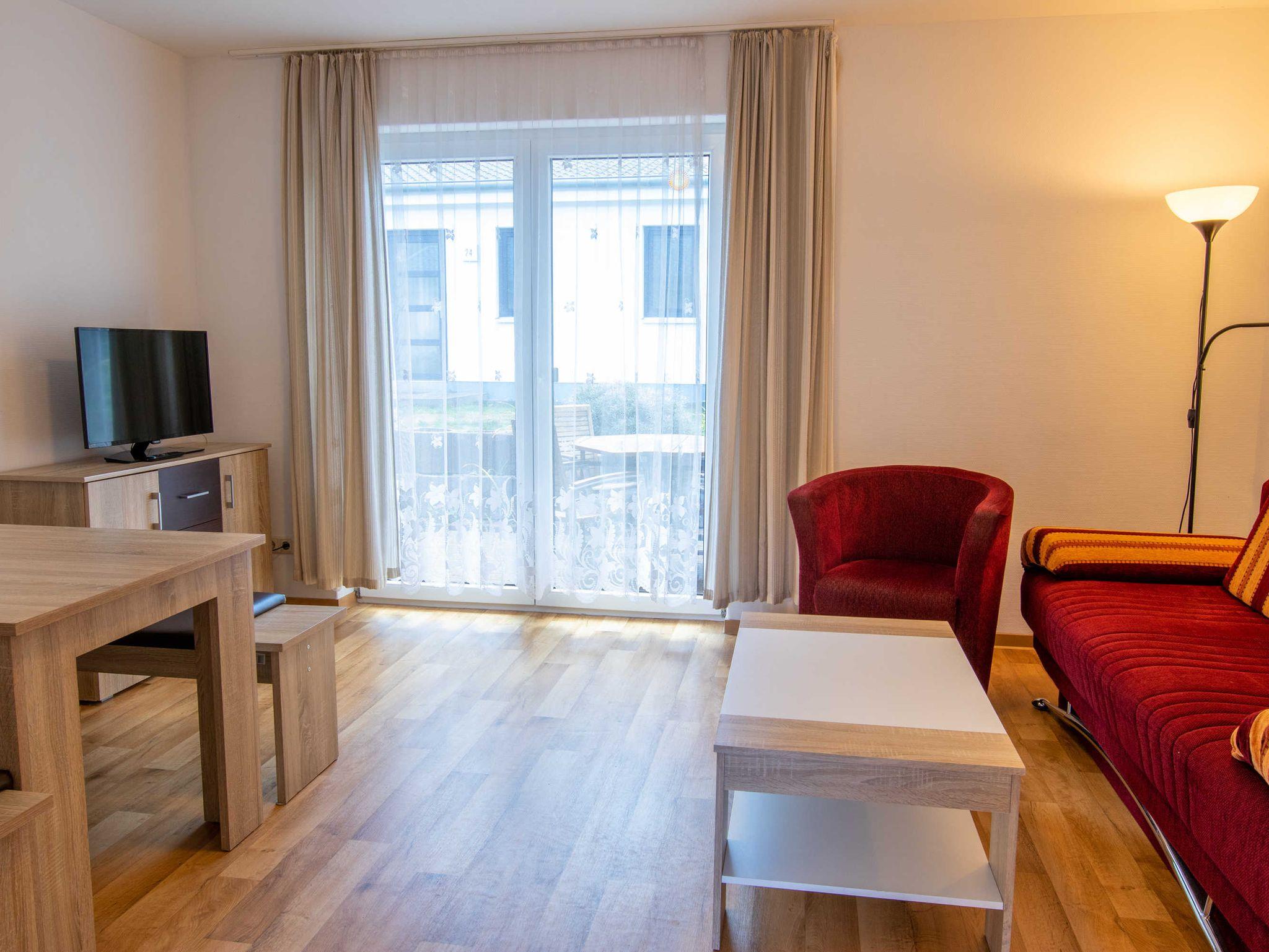 Die ca. 50 m² große Ferienwohnung befindet sich in einem einzeln stehenden Doppelhaus mit Terrasse und Blick zum Wald. Sie verfügt über ein Wohnzimmer mit Miniküche, zwei separaten Schlafzimmern, Flur und Bad.