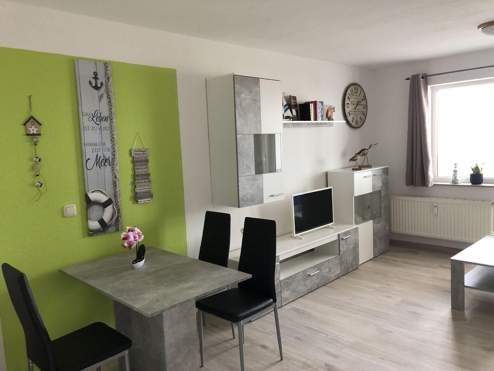 Schlafcouch ( 1,20 x 2,00 m ), Couchtisch, Flachbild- TV, Schrank, Eßbereich mit 4 Stühlen