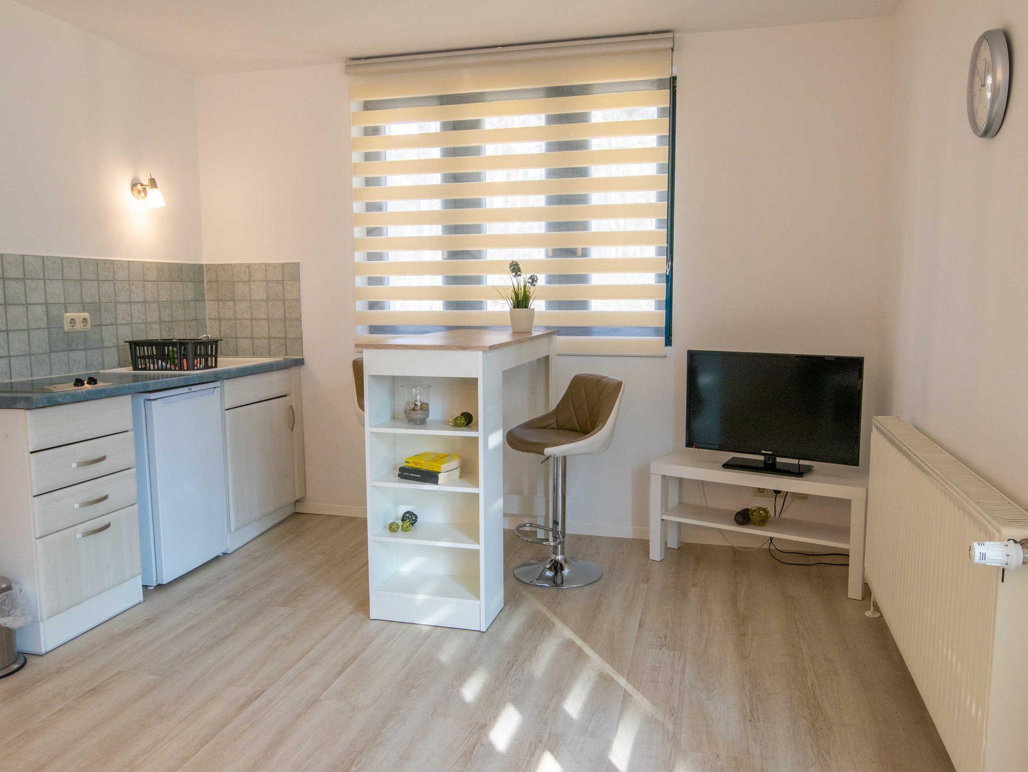 Die ca. 35 m² große Ferienwohnung mit Blick zum Wald befindet sich in einem Gästehaus mit 5 Wohneinheiten. Sie verfügt über ein Wohnzimmer mit Küchenzeile, ein separates Schlafzimmer, Bad und einer Gemeinschaftsterrasse mit Möbeln.