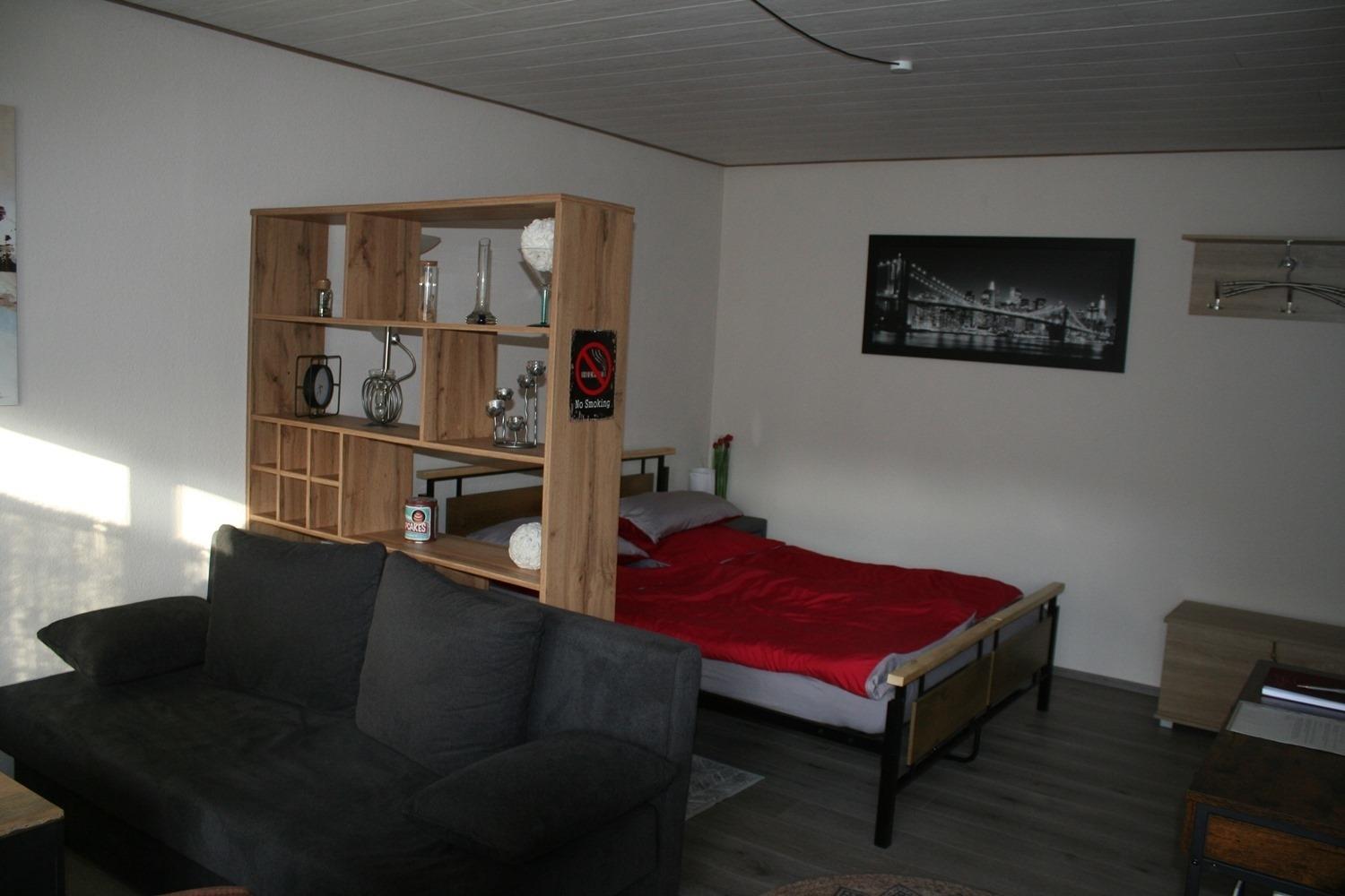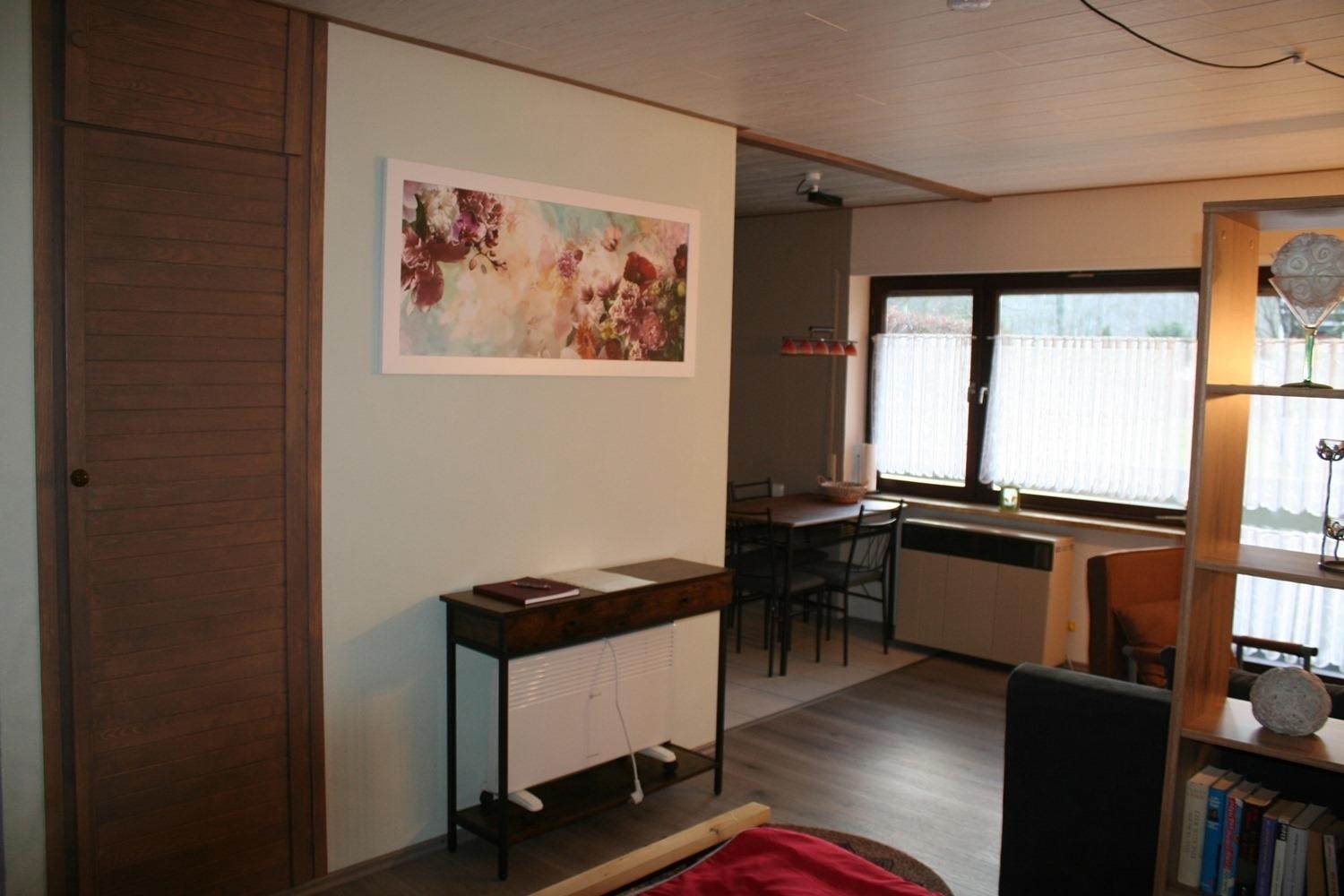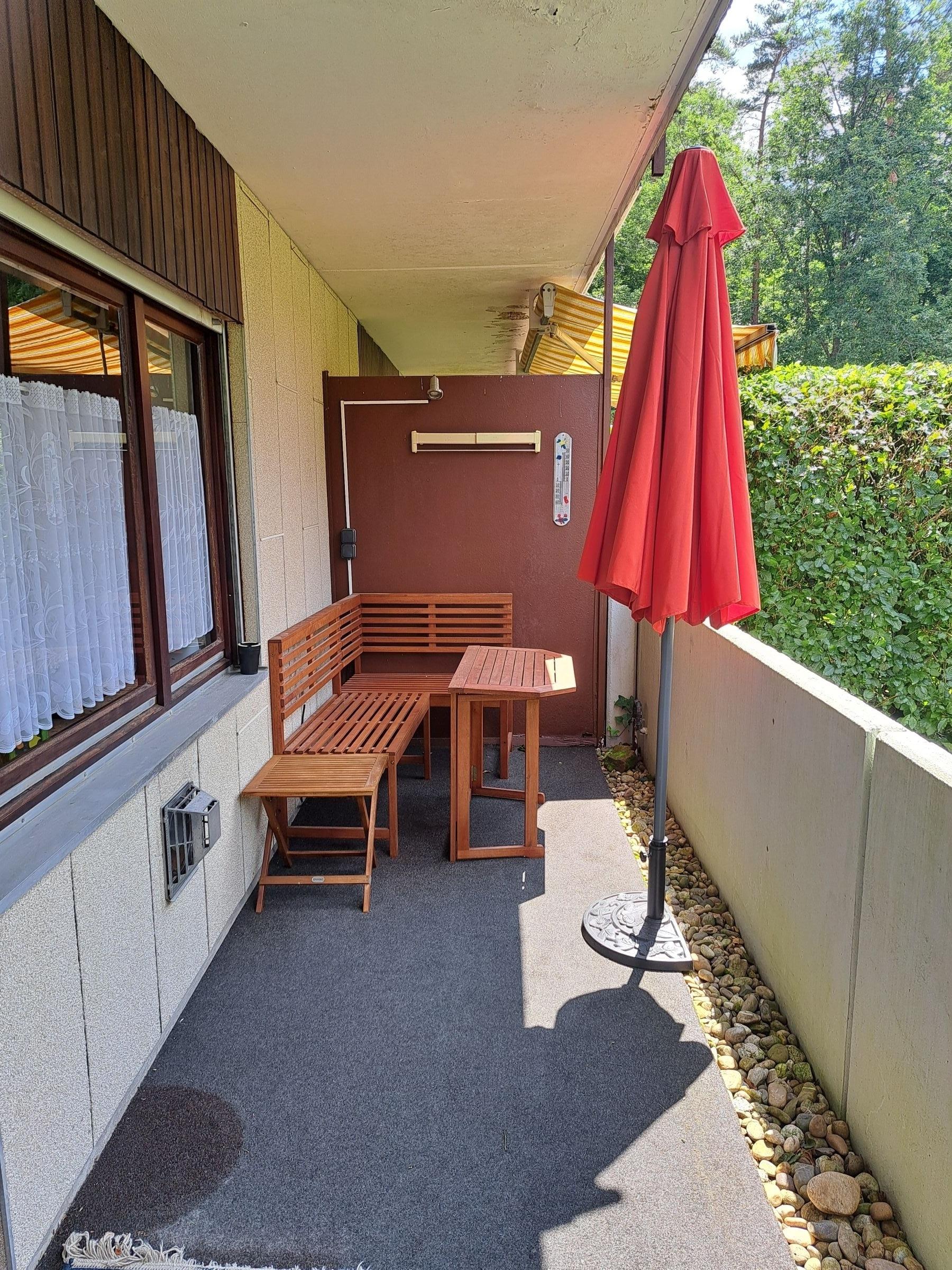 Neu renovierte und geschmackvoll zum Wohlfühlen eingerichtete Ein-Zimmer-Ferienwohnung mit Küchenzeile, Essbereich im Erdgeschoss mit großer Terrasse , sehr ruhig gelegen im Orteilsteil Schöntal direkt am Wald und 150 Meter vom Badeweiher Schöntal entfernt. Schöntal hat keinen Durchgangsverkehr, generell nur 30 kmStd. Erlaubt.