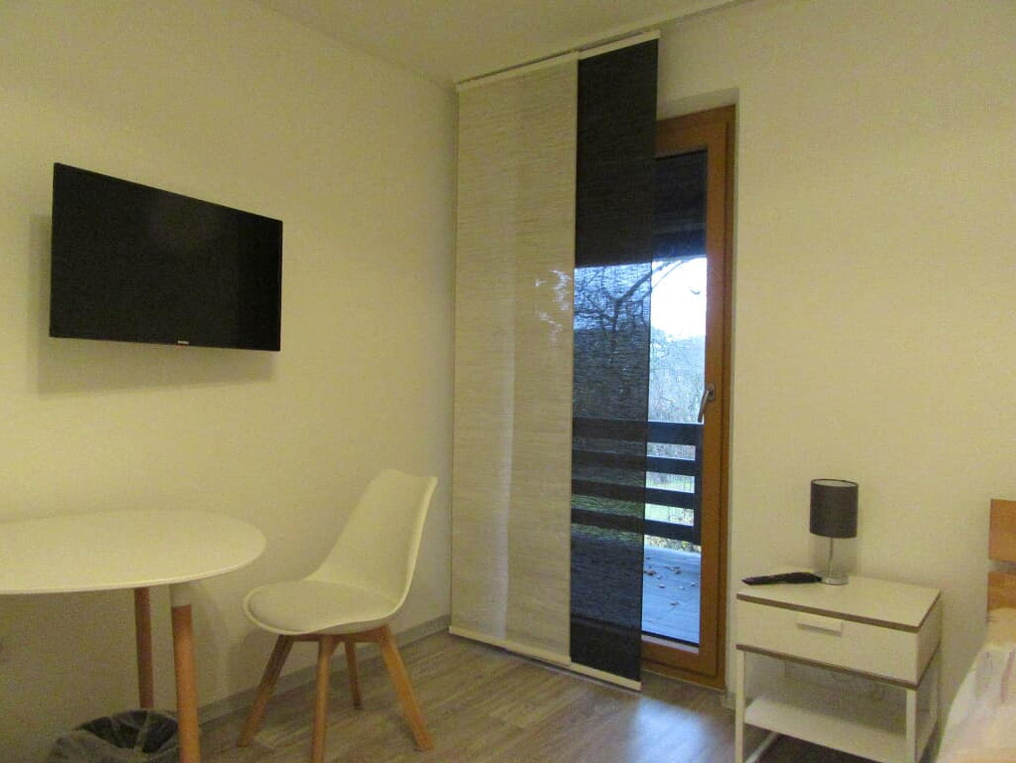 Das Zimmer ist mit einem Schrank, Fernseher und Kühlschrank ausgestattet.