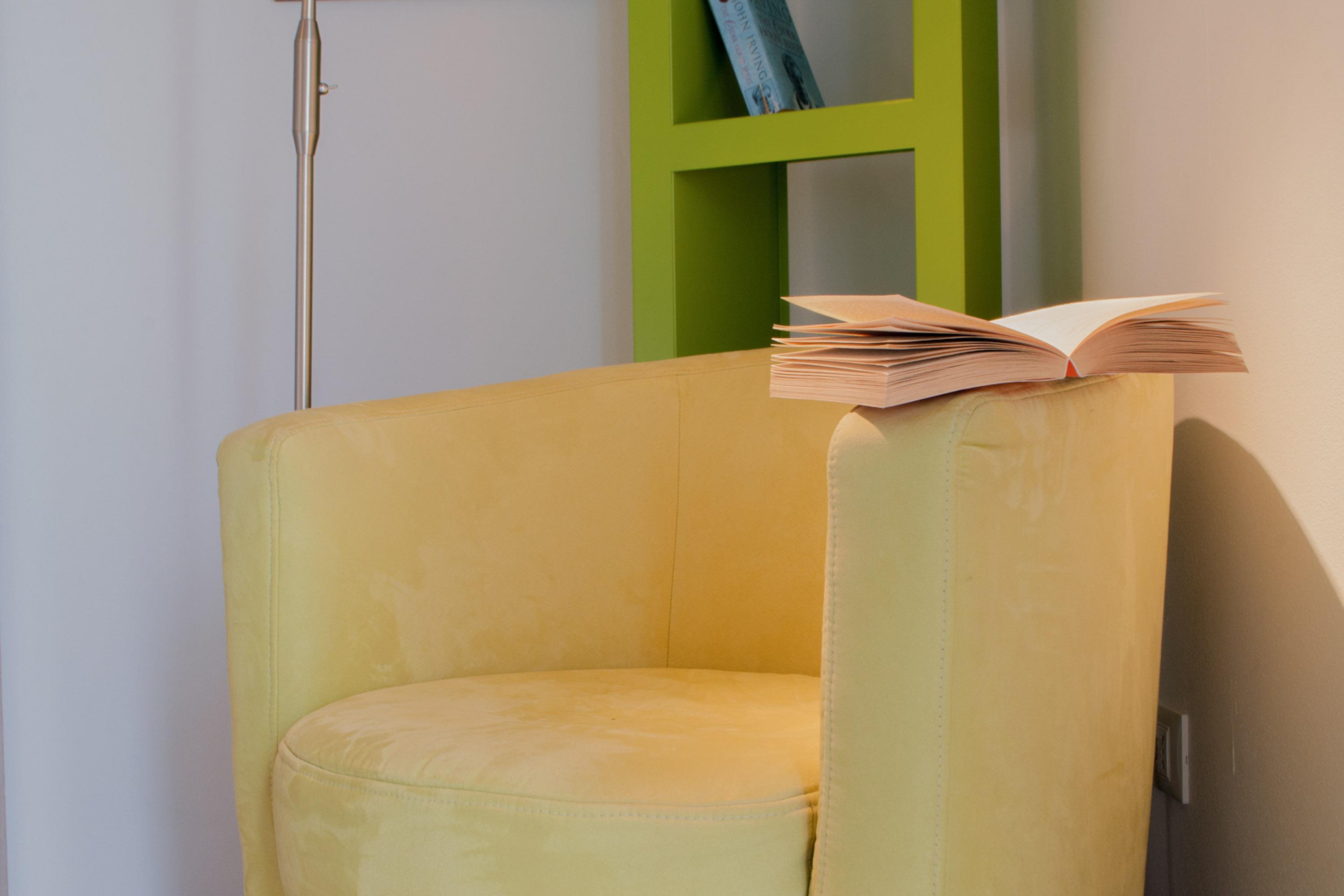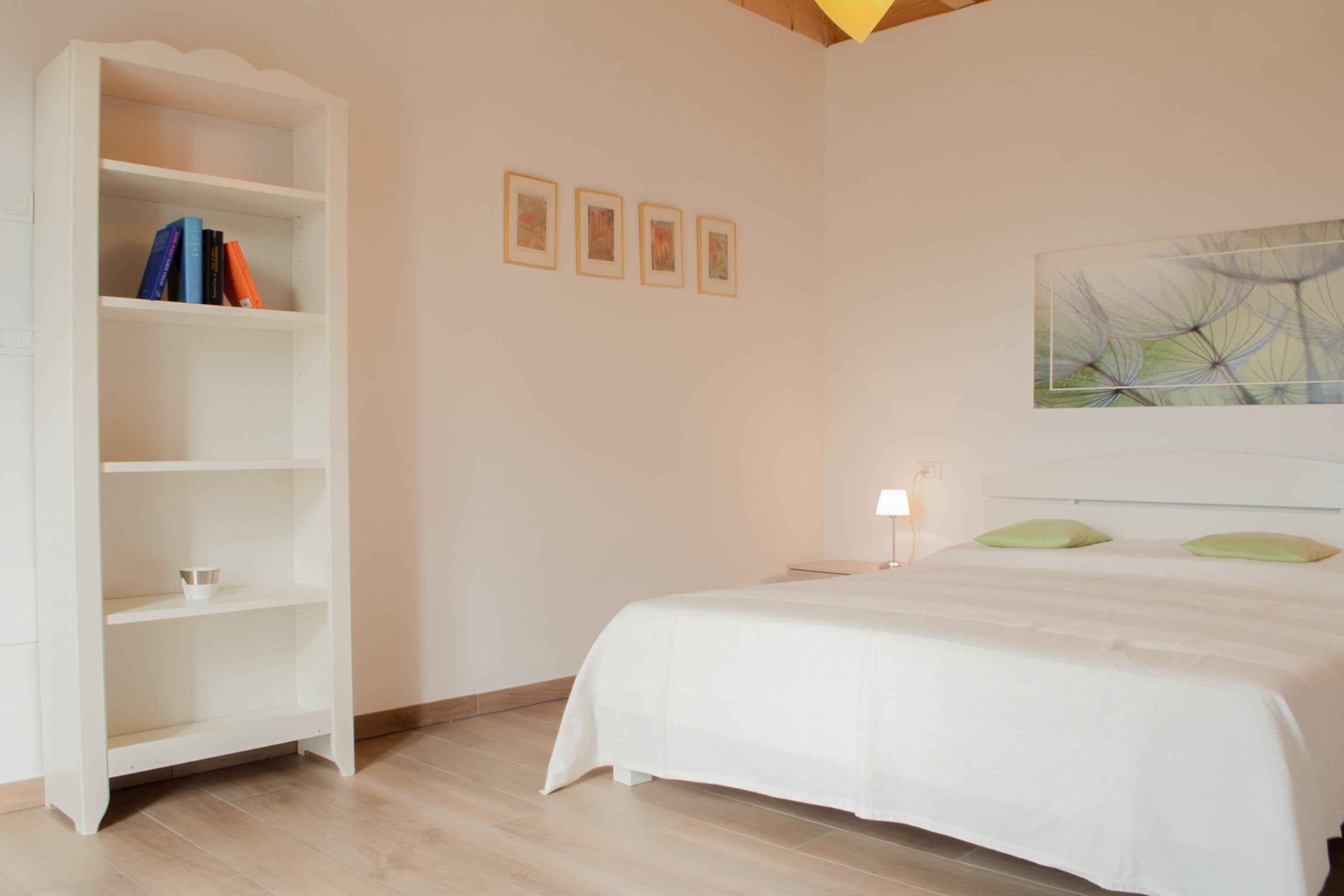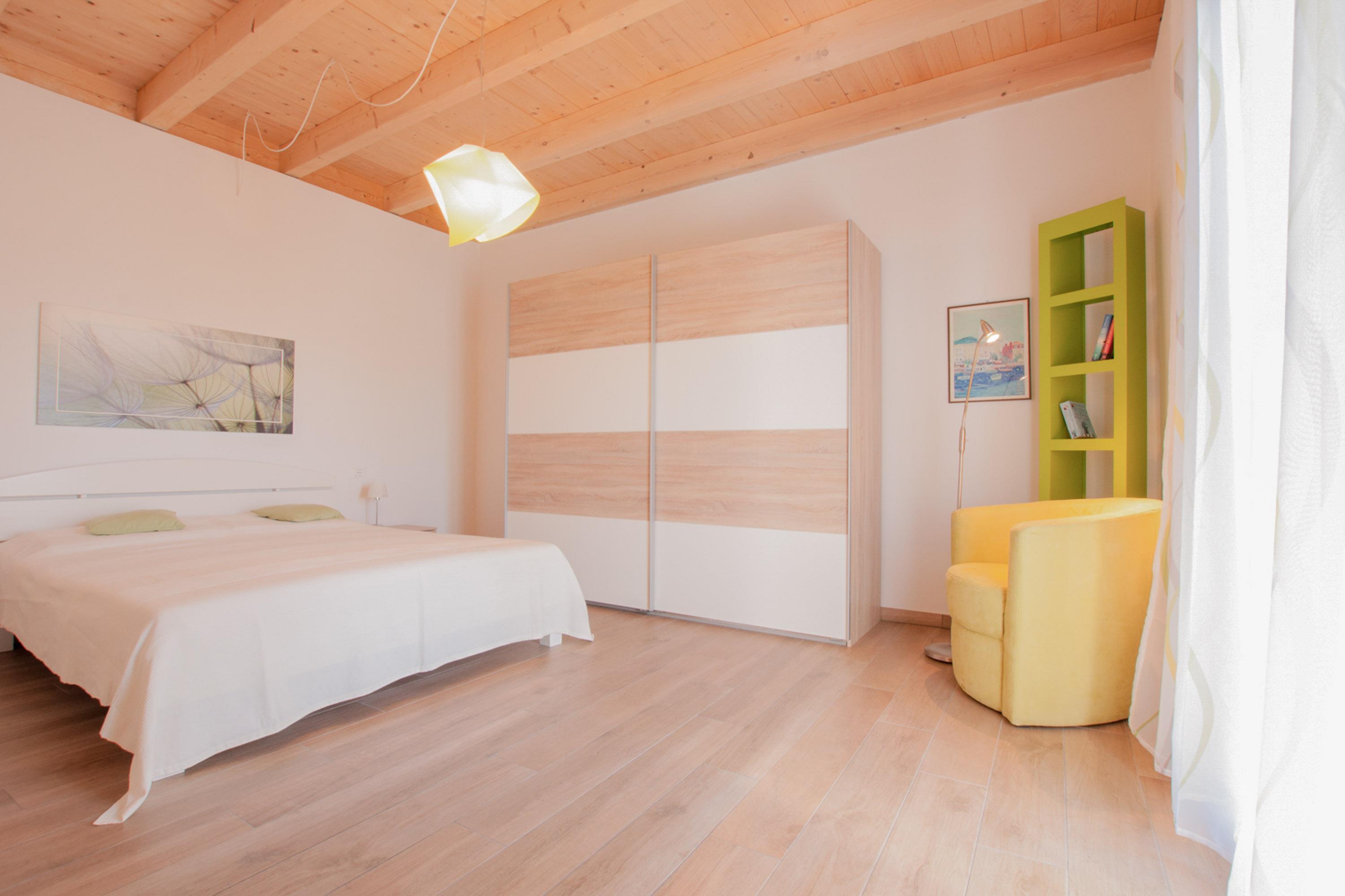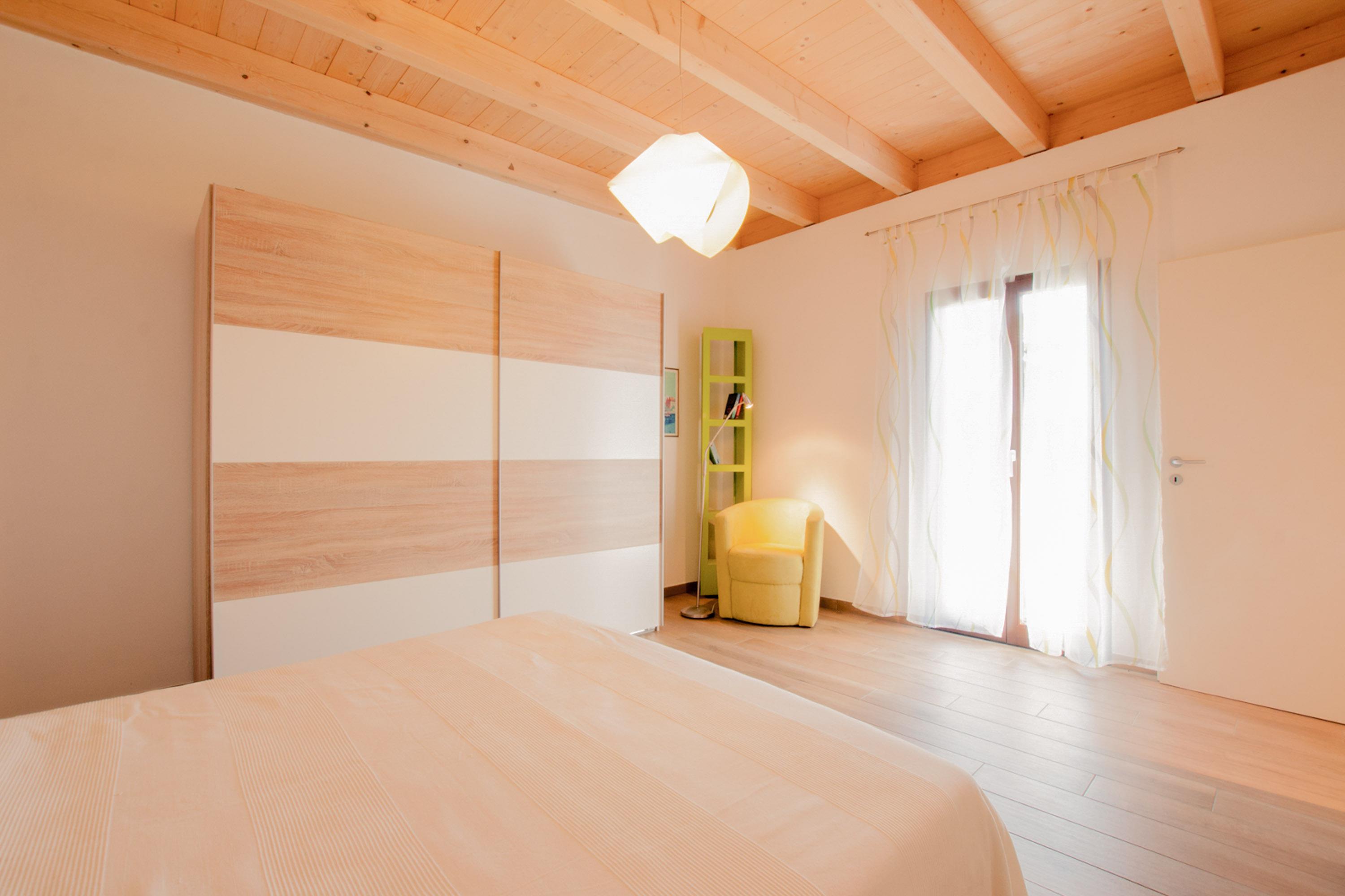 Eine Treppe führt vom Hausgang ins lichtdurchflutete Obergeschoss. Ein Schlafzimmer bietet ein Doppelbett, einen französischen Balkon mit traumhaftem Blick auf den See und einen großen Kleiderschrank sowie Regale und einen Sessel zum Entspannen.