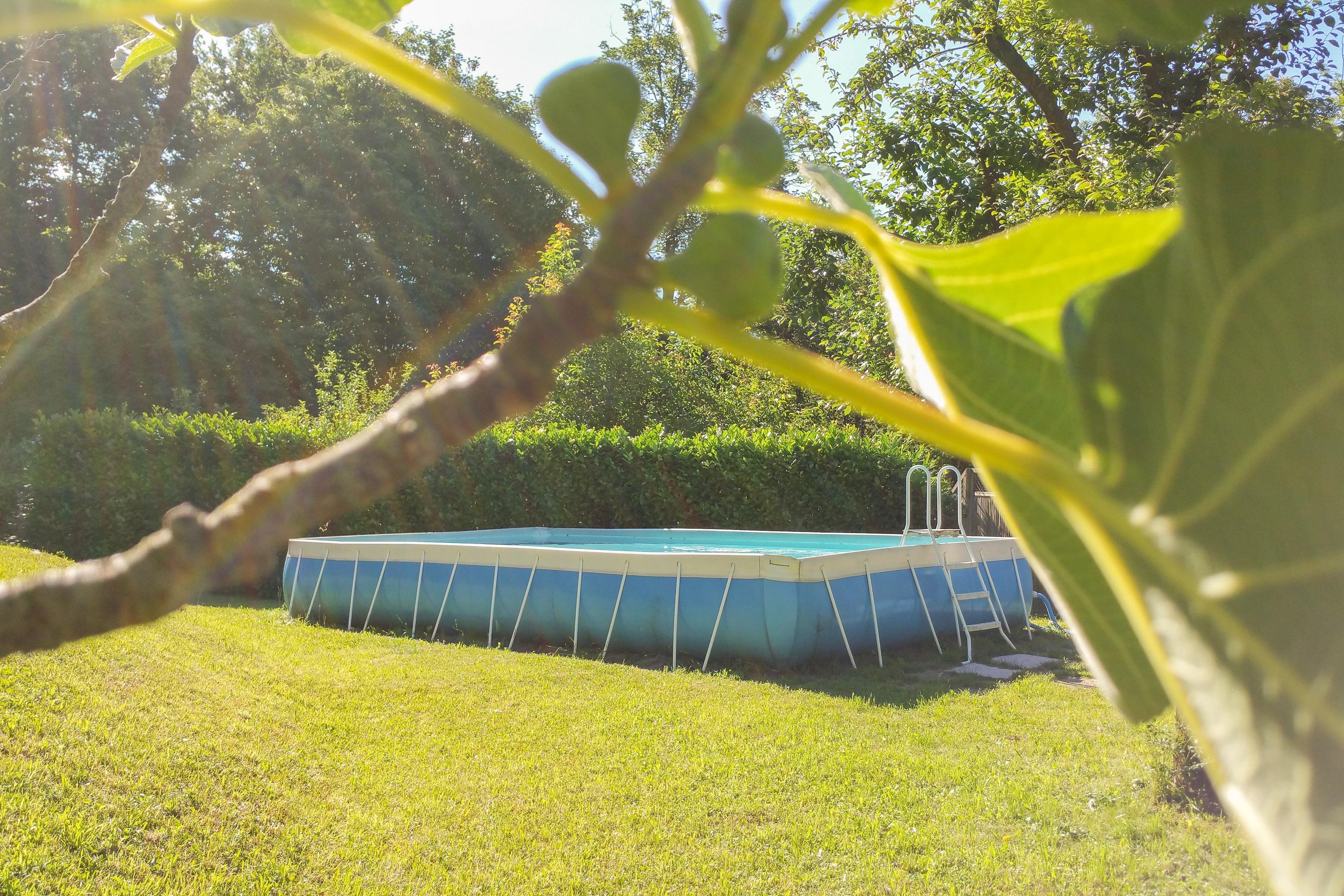 Eine Steintreppe führt zum Pool-Bereich, der von Mitte Juni bis Ende September betrieben wird und sich unterhalb des Hauses befindet. Kinder können hier auch alleine eine Runde schwimmen, da der Pool von der oberen Terrasse aus gut einsehbar ist. Liegestühle zum Relaxen sind ebenfalls vorhanden. Eine große Rasenfläche zum Fußballspielen, Toben und Entspannen erwartet Sie an diesem reizvollen Ort.