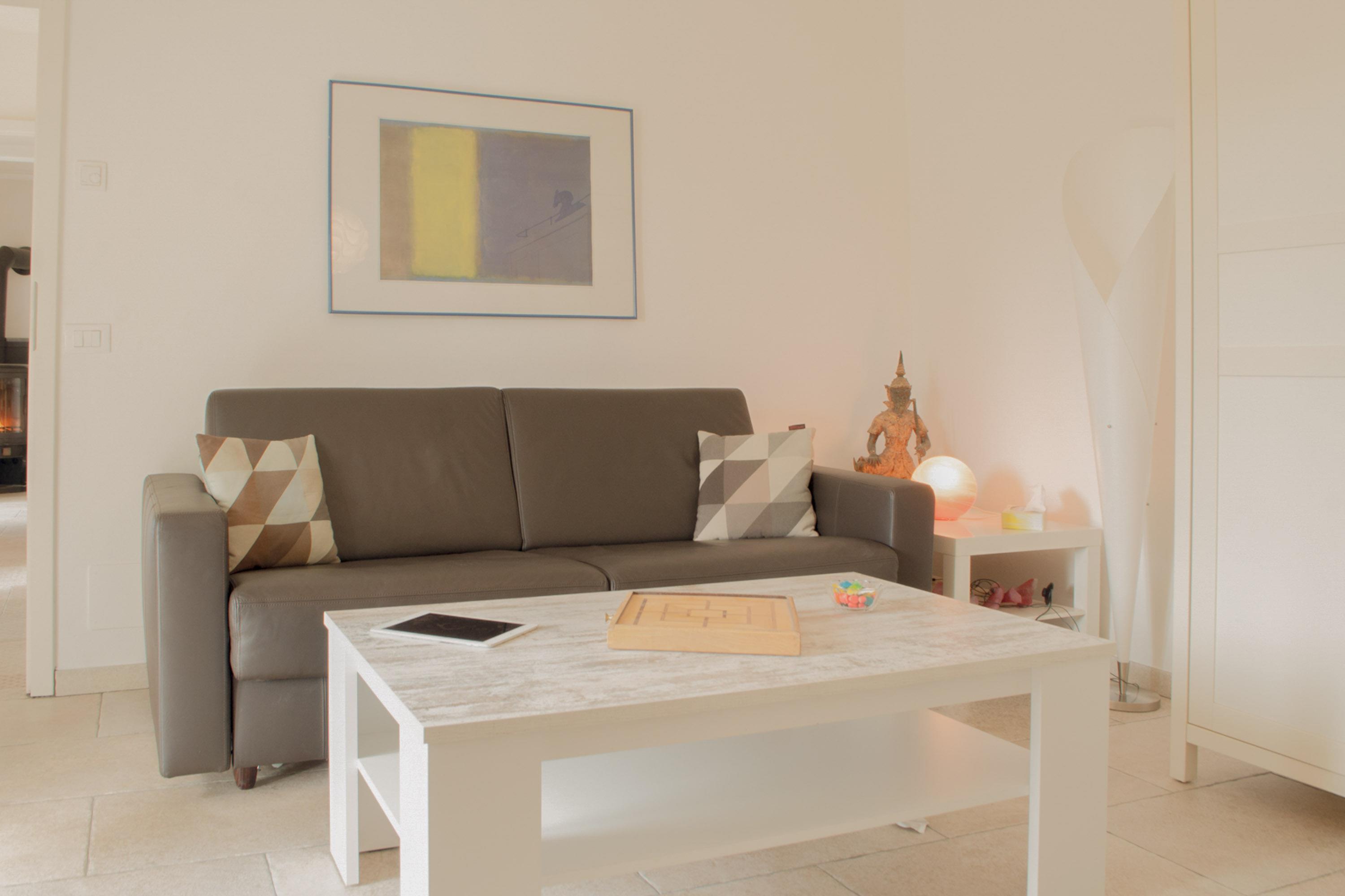 Ein prächtiges Lederschlafsofa für zwei Personen und ein Entertainment-Bereich sorgen für eine gemütliche Atmosphäre.