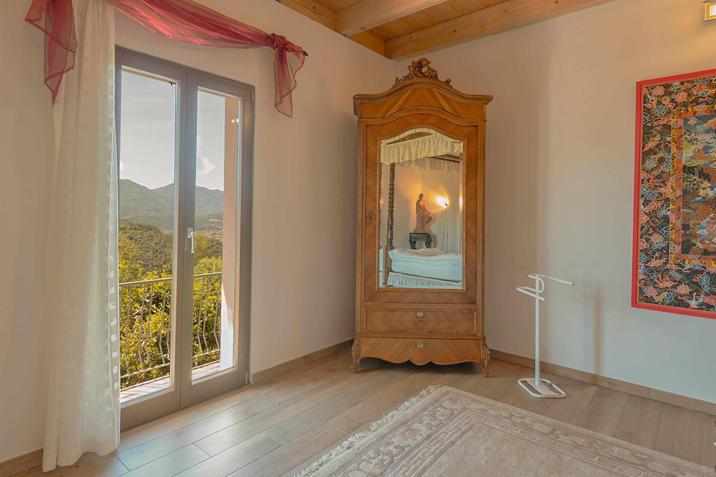 Ein weiteres Schlafzimmer ist mit einem antiken Himmelbett, einem Kleiderschrank und einer Kommode mit Spiegel ausgestattet. Das Obergeschoss bietet außerdem ein hochwertiges Badezimmer mit begehbarer Dusche, WC, Bidet, großem Waschtisch mit Schubladen und Seitenschrank, großer Spiegelfläche und ebenfalls Fußbodenheizung.