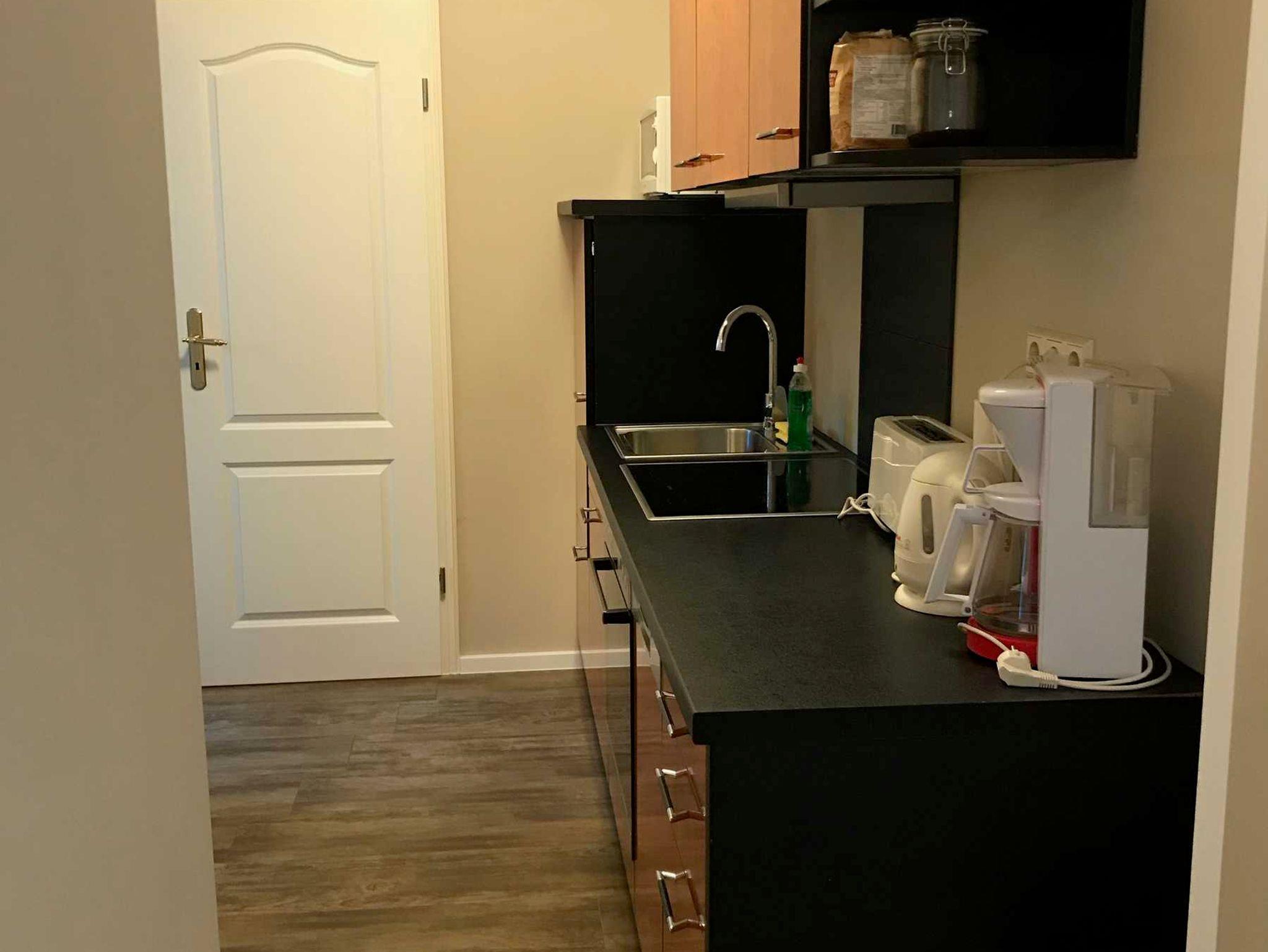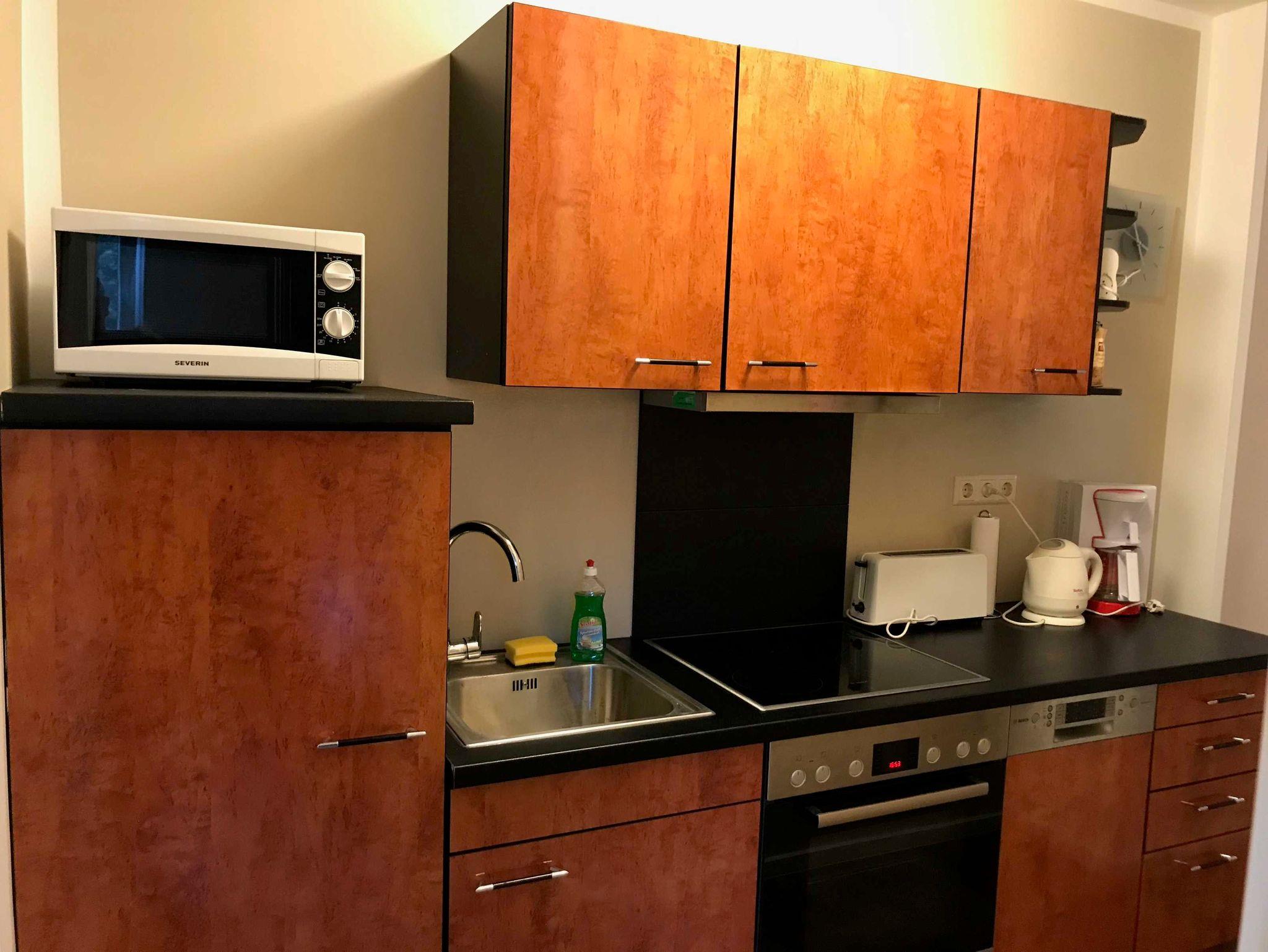 • Küche ist komplett ausgestattet: Elektroherd/Backofen/Ceran-Kochfeld, Kühlschrank mit Gefrierfach, Geschirrspülmaschine, Mikrowelle, Kaffeemaschine, Wasserkocher und weiterem umfangreichen Kücheninterieur