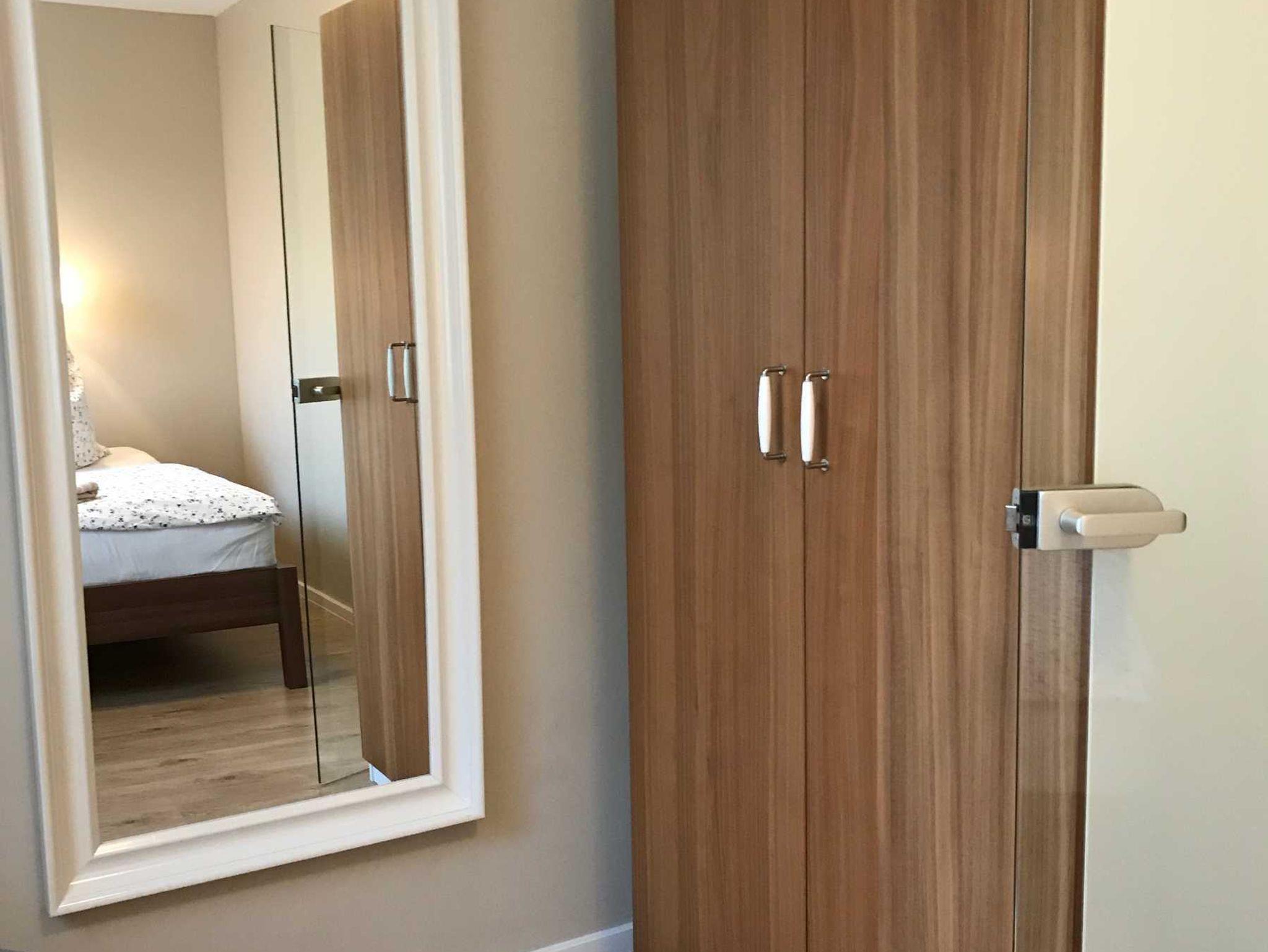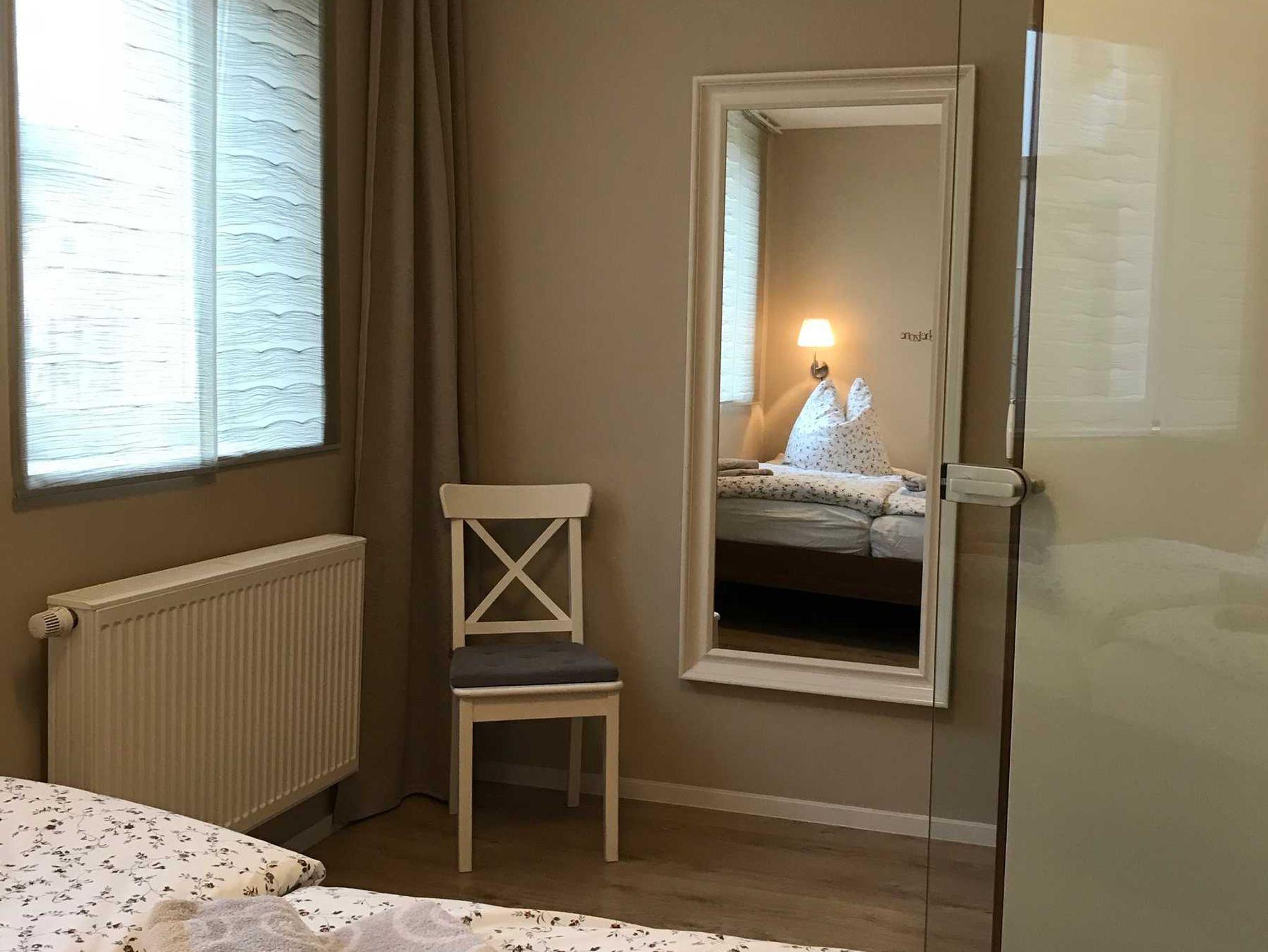 • Schlafzimmer: Doppelbett (1,80x2,00 m) für 2 Personen mit hohem Einstieg und große, Ganzkörper-Wandspiegel