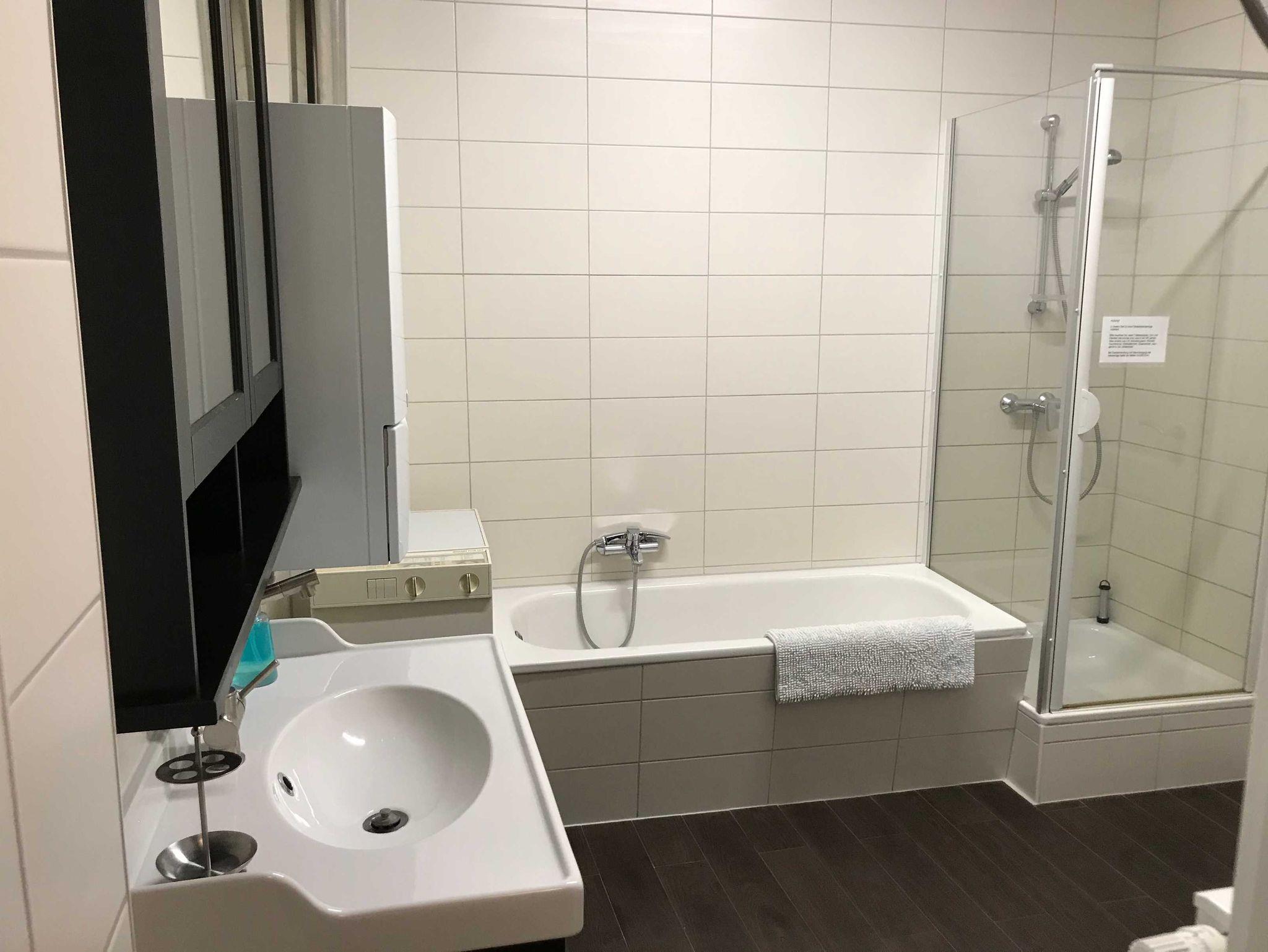 • Bad mit Dusche/WC, Badewanne und einem Fön