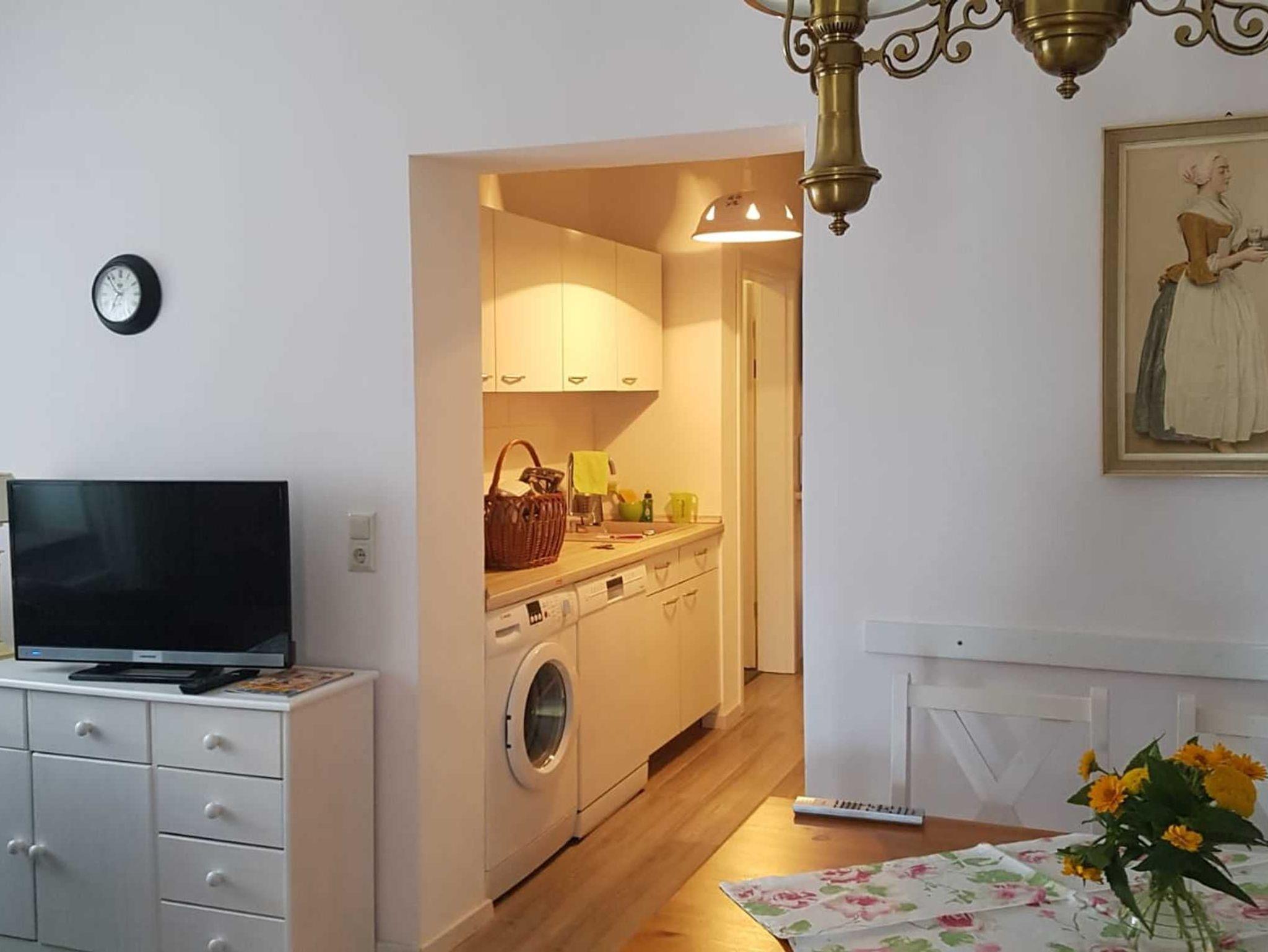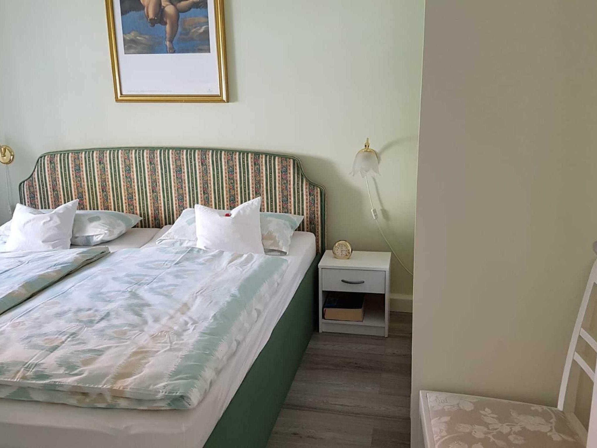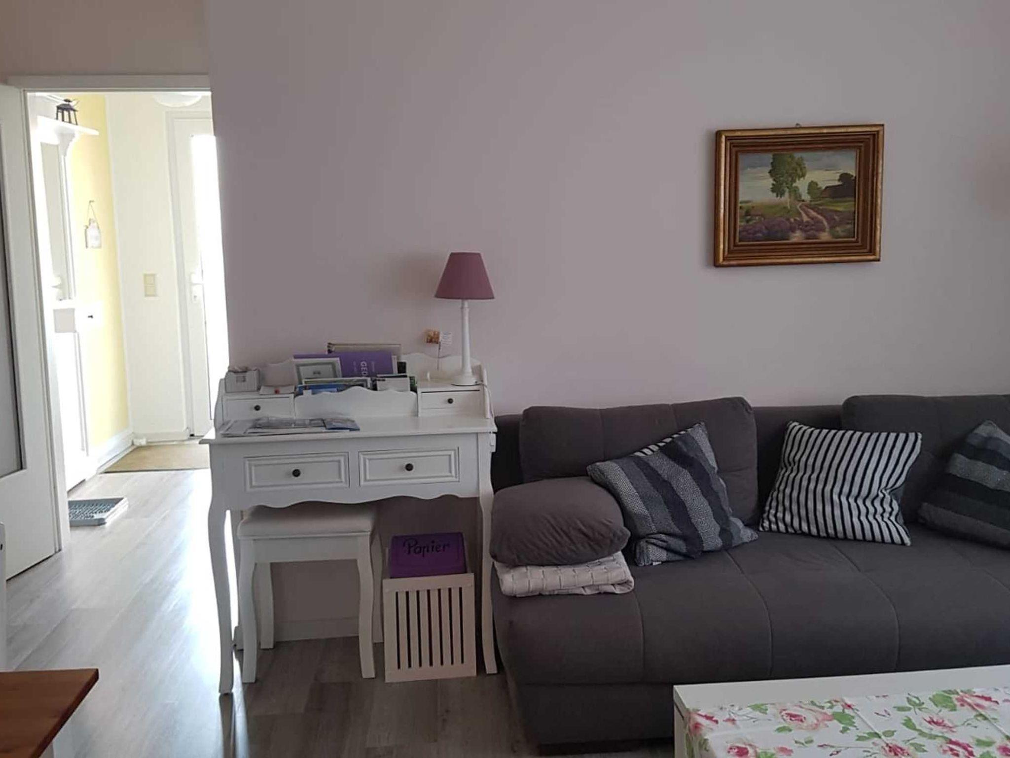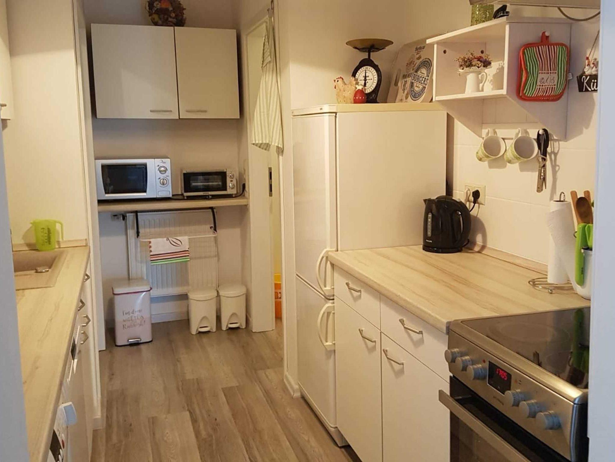 Das Schlafzimmer ist mit einem Doppelbett ausgestattet. Im Wohnzimmer befindet sich eine Schlafcouch für eine Aufbettung für maximal 2 Personen. Eine komplett ausgestattete Küche mit Waschmaschine, Geschirrspüler, Herd, Mikrowelle, Kaffeemaschine und einem Brötchenaufbackofen. Neben der Küche befindet sich eine Kammer, die zum Abstellen der Koffer etc. genutzt werden kann.