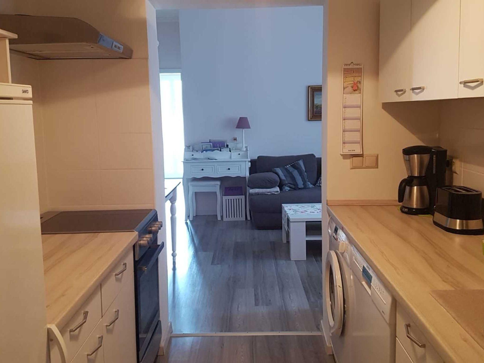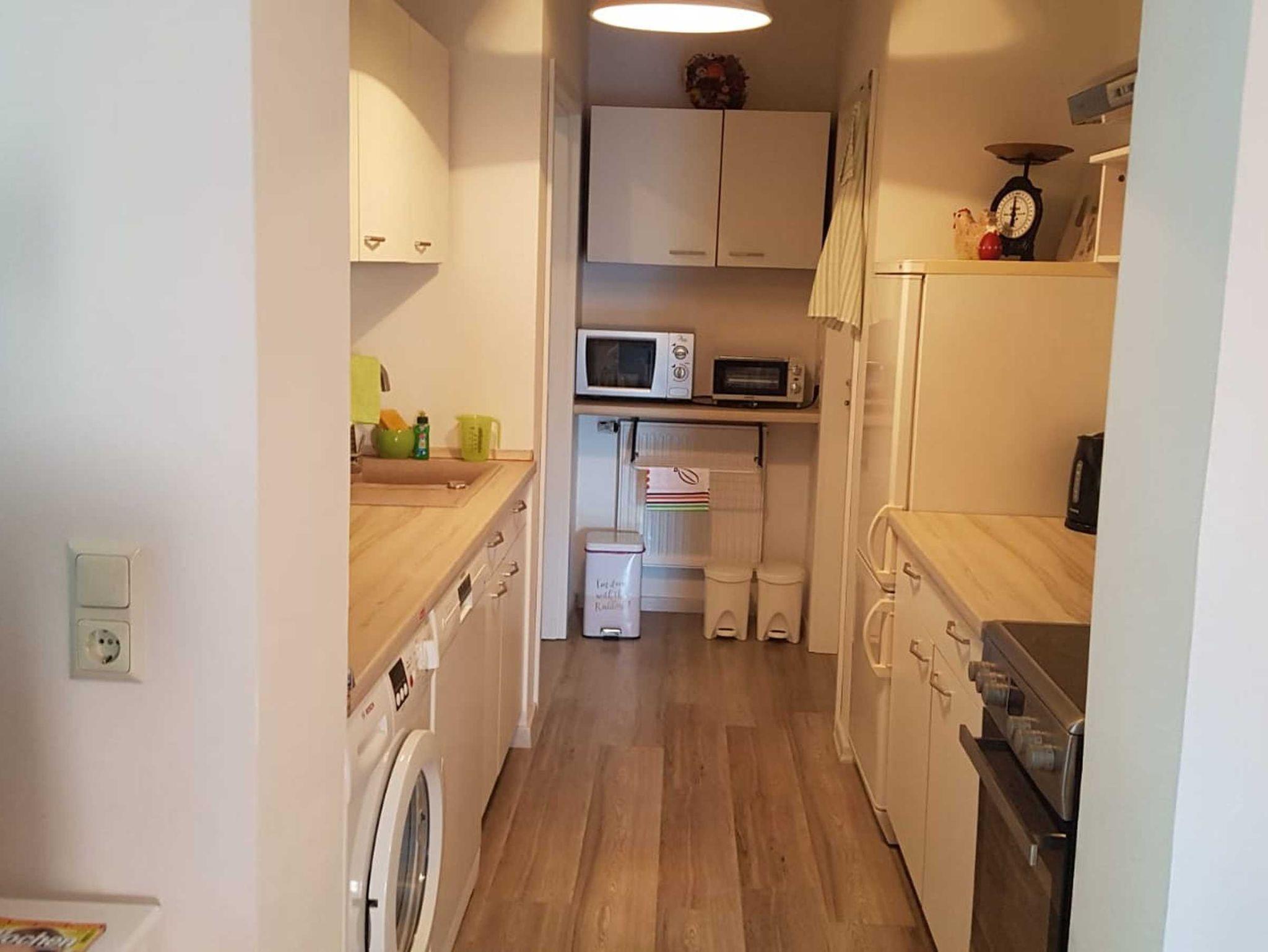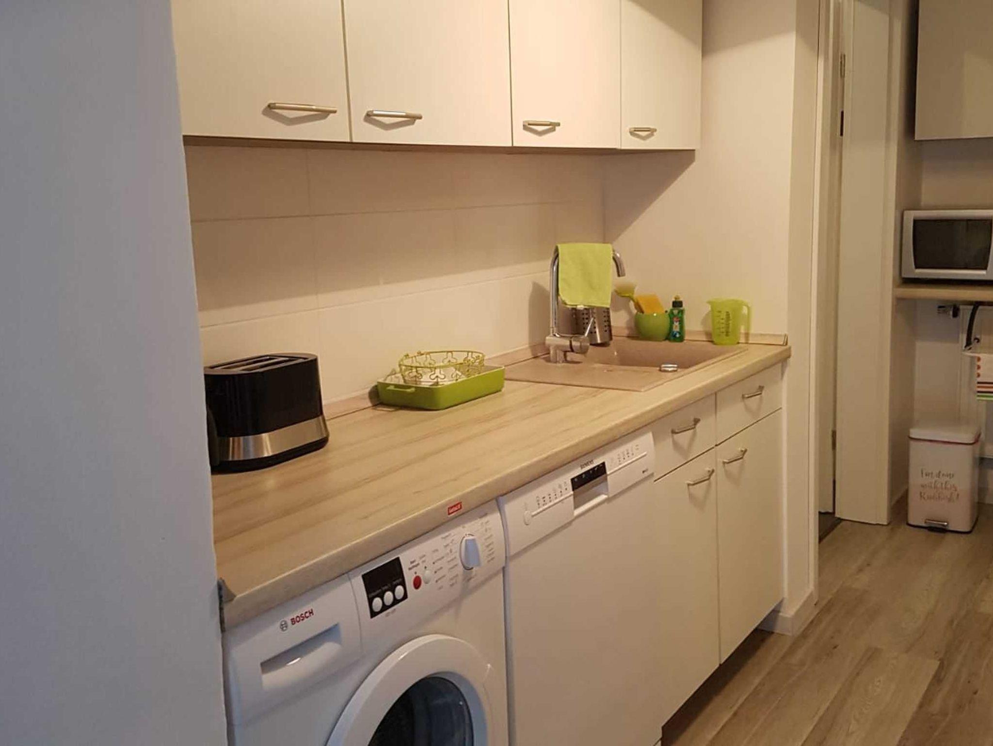 • komplett ausgestattete Küche mit Waschmaschine, Geschirrspüler, Herd, Mikrowelle, Kaffeemaschine, Wasserkocher und Brötchenaufbackofen
