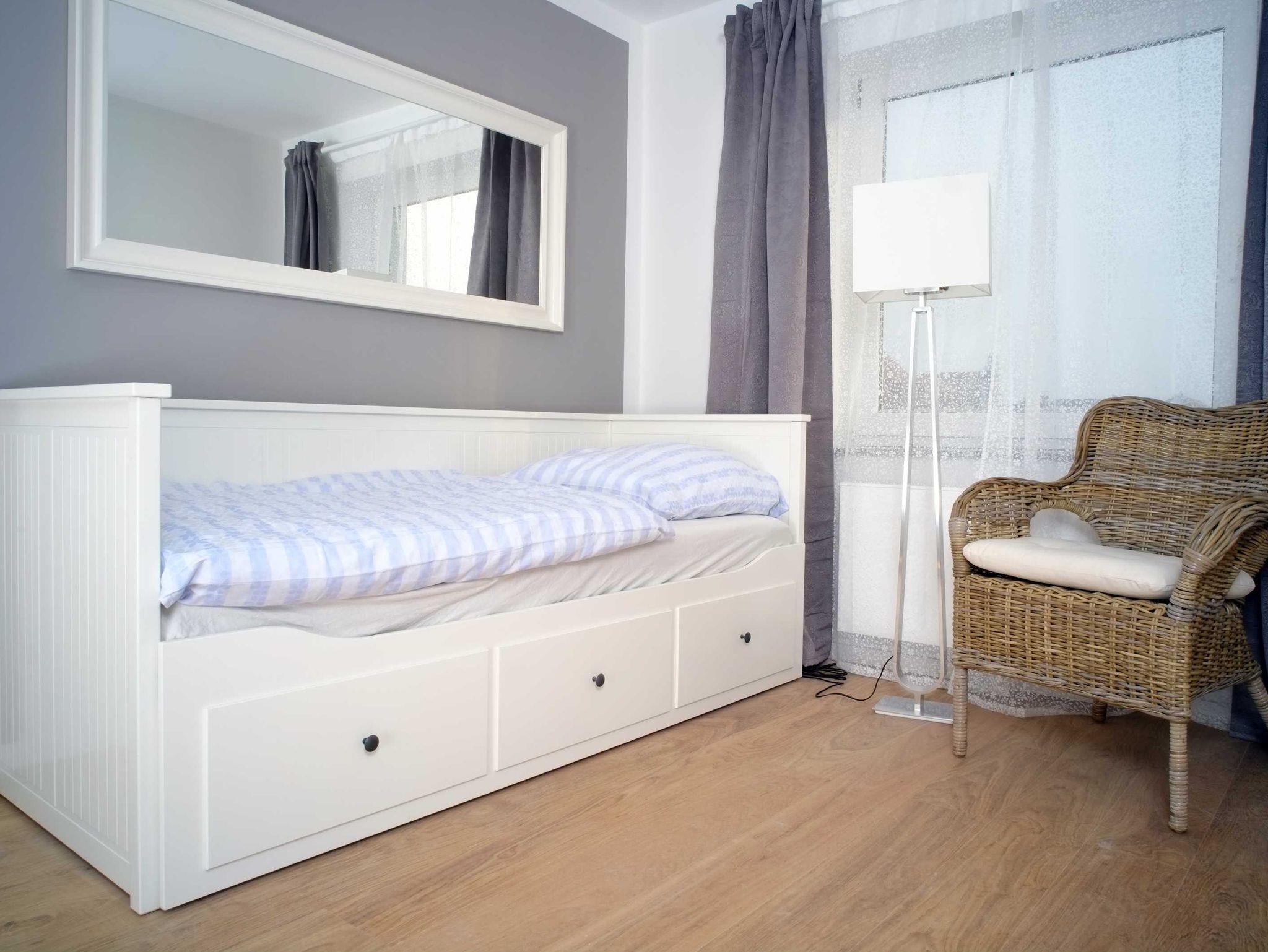 • Schlafzimmer mit einem Einzelbett, welches zu einem Doppelbett mit getrennten Matratzen ausgezogen werden kann.