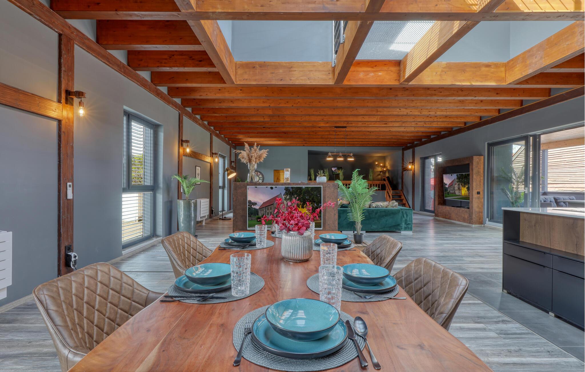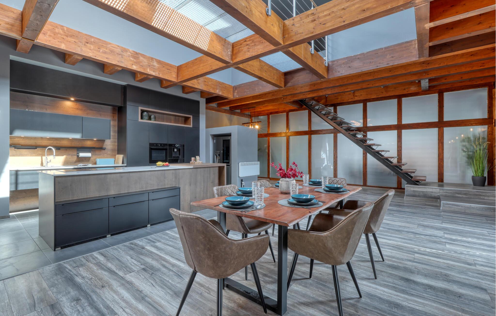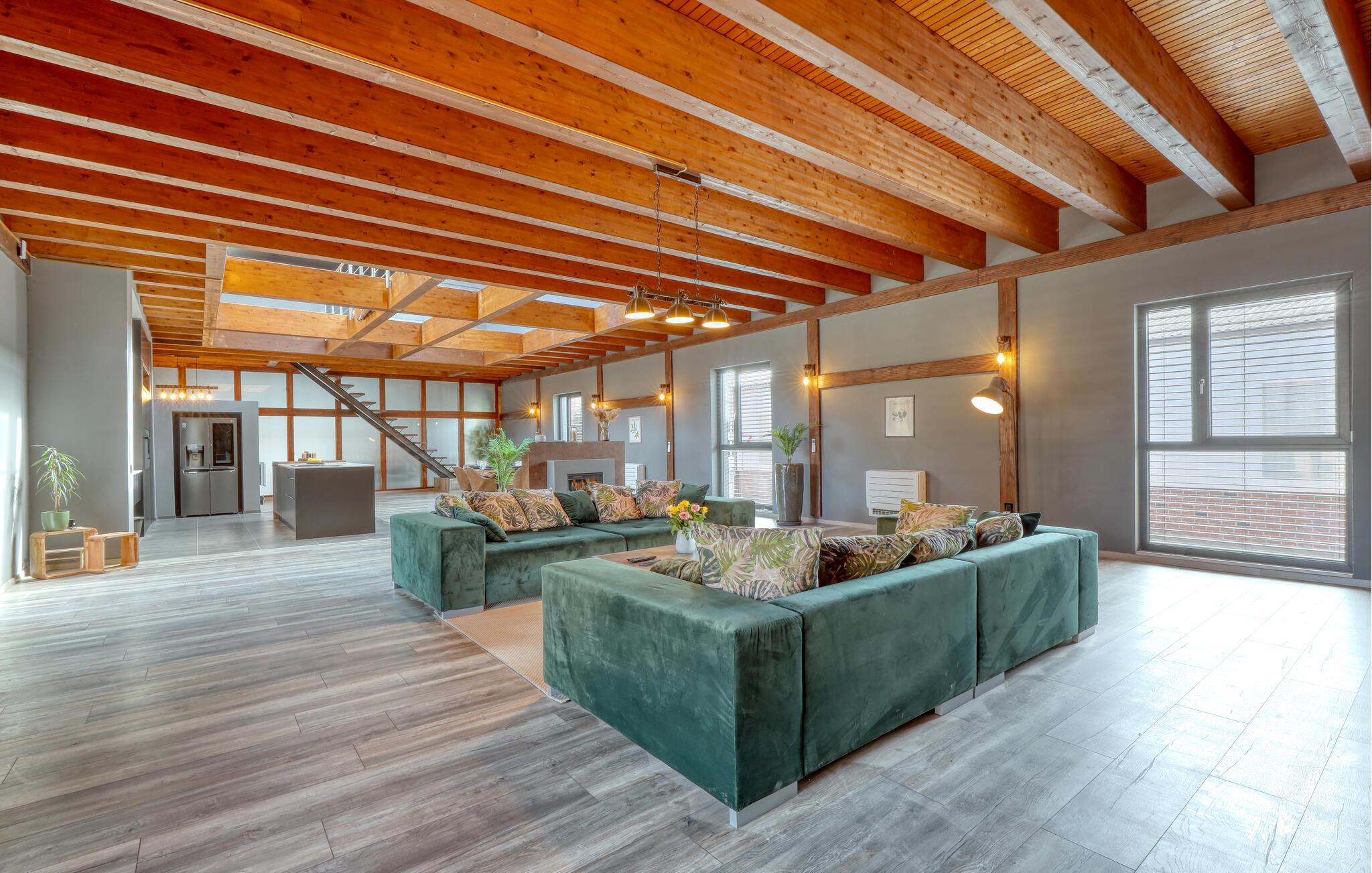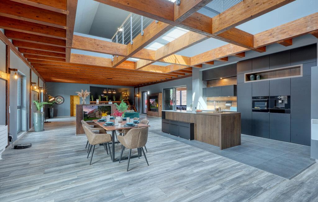 Hvis I skal på ferie som en større flok, og hvis I ikke går af vejen for ekstravagant komfort, er denne fantastiske villa et helt oplagt valg for jer. Interiøret fremtræder endog virkelig lækkert med moderne detaljer, faciliteter og møbler, der sammen med de rustikke og kæmpestore træbjælker skaber en helt særegen stemning her. De store rum får et skønt lysindfald gennem de store vinduespartier, og farverne udstråler varme og elegance, så det er nærmest umuligt ikke at slappe af, med det samme I træder ind. Køkkenet er fuldt udstyret, så lad kokkene tage sig god tid med madlavningen. Efter aftensmaden kan I gøre det lidt ekstra lækkert for jer selv med et boblebad eller en gedigen svedetur i den infrarøde sauna, mens I lægger planer for de kommende dage.