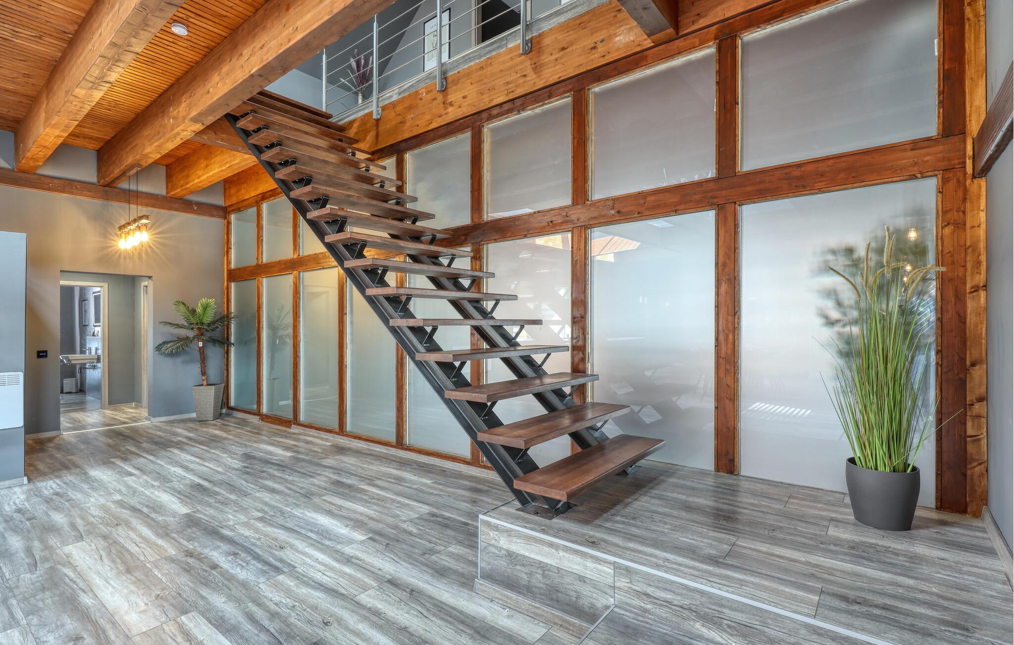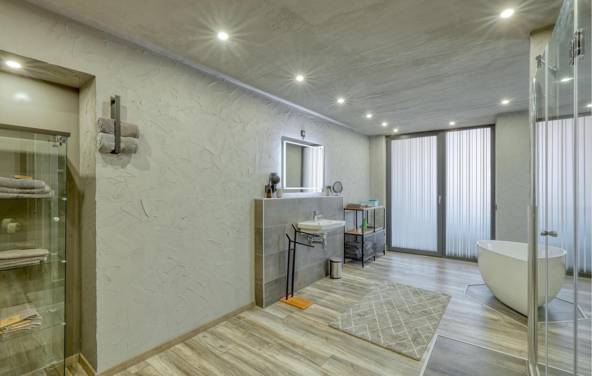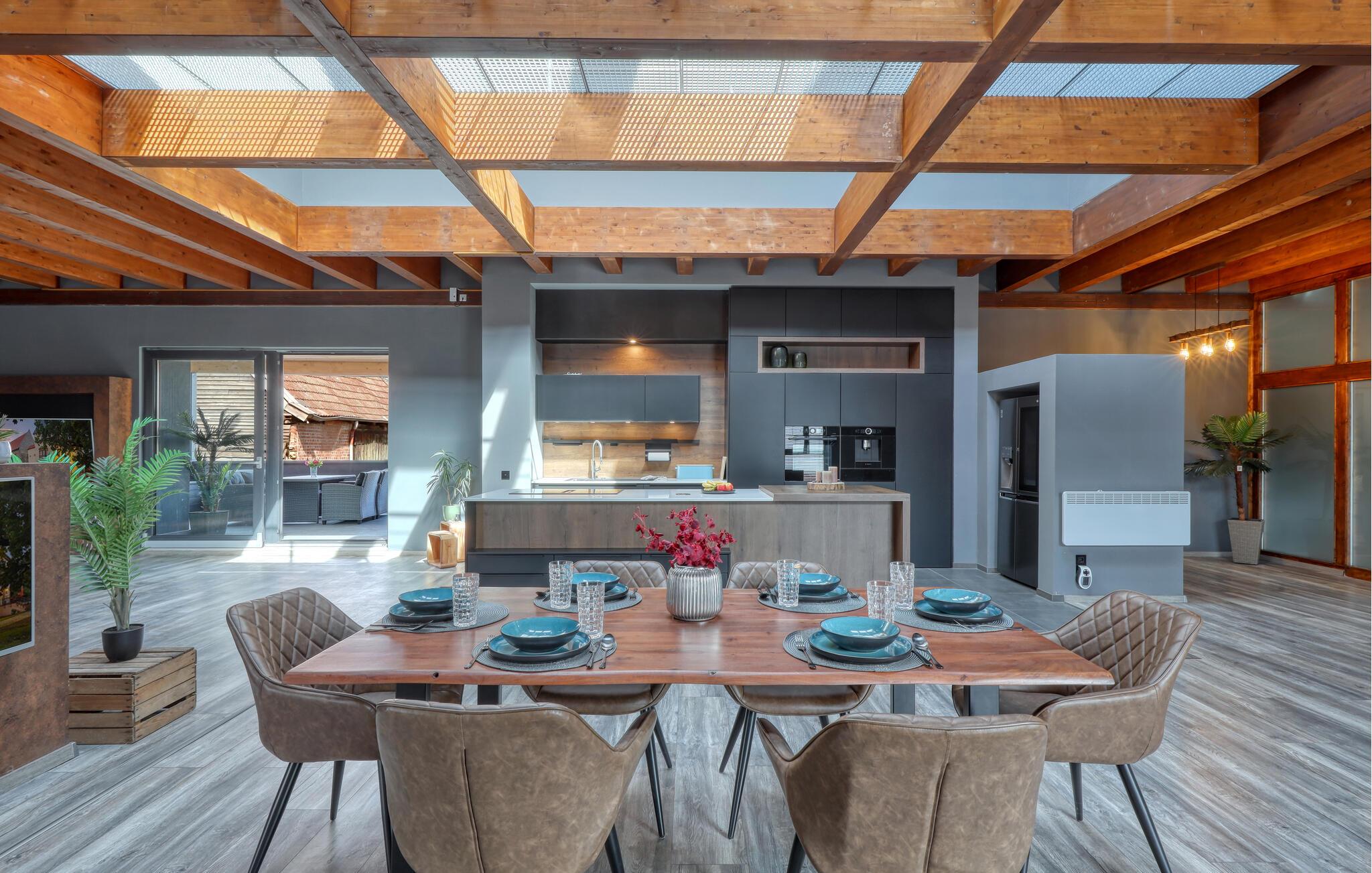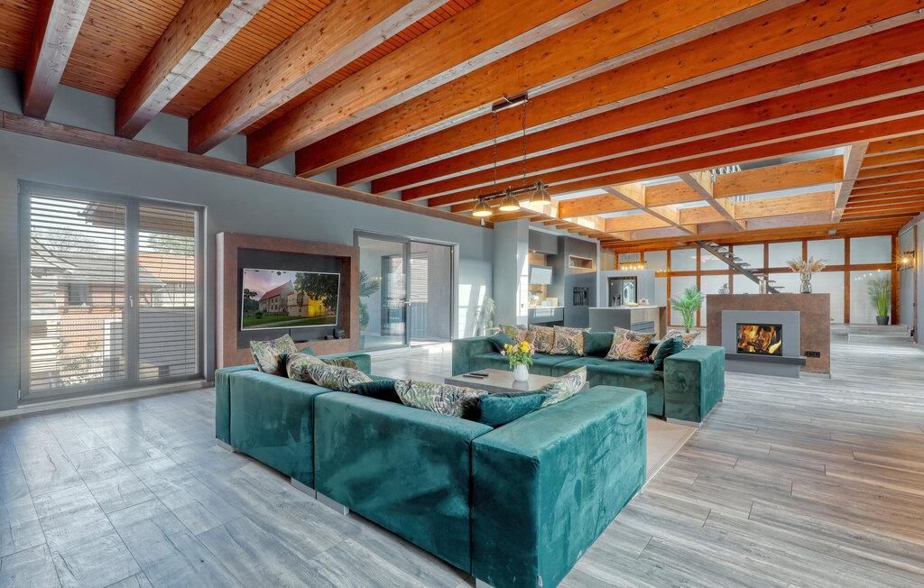 Hvis I skal på ferie som en større flok, og hvis I ikke går af vejen for ekstravagant komfort, er denne fantastiske villa et helt oplagt valg for jer. Interiøret fremtræder endog virkelig lækkert med moderne detaljer, faciliteter og møbler, der sammen med de rustikke og kæmpestore træbjælker skaber en helt særegen stemning her. De store rum får et skønt lysindfald gennem de store vinduespartier, og farverne udstråler varme og elegance, så det er nærmest umuligt ikke at slappe af, med det samme I træder ind. Køkkenet er fuldt udstyret, så lad kokkene tage sig god tid med madlavningen. Efter aftensmaden kan I gøre det lidt ekstra lækkert for jer selv med et boblebad eller en gedigen svedetur i den infrarøde sauna, mens I lægger planer for de kommende dage.