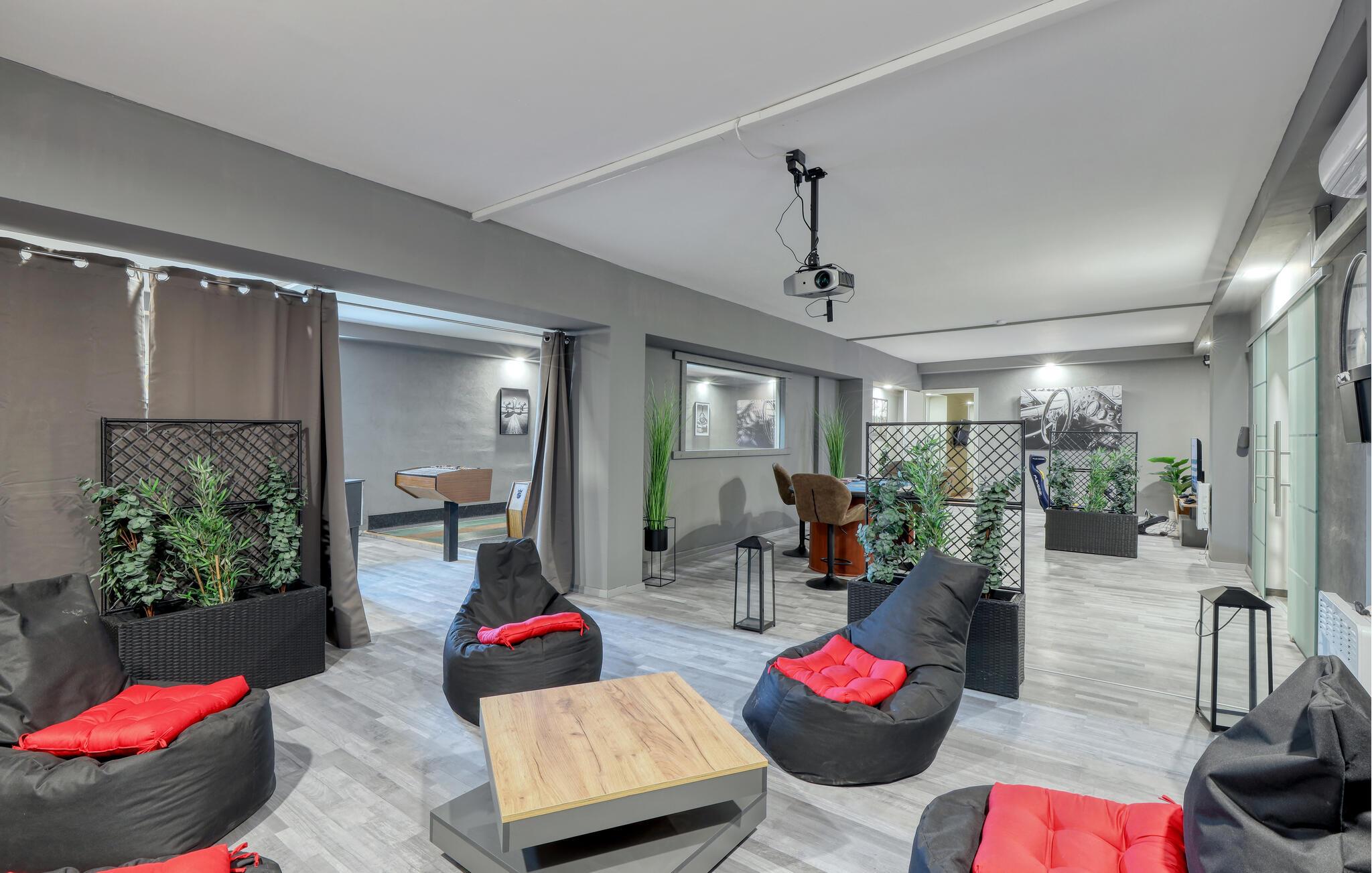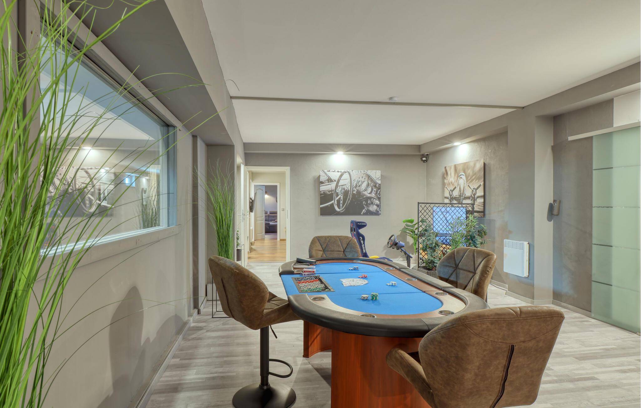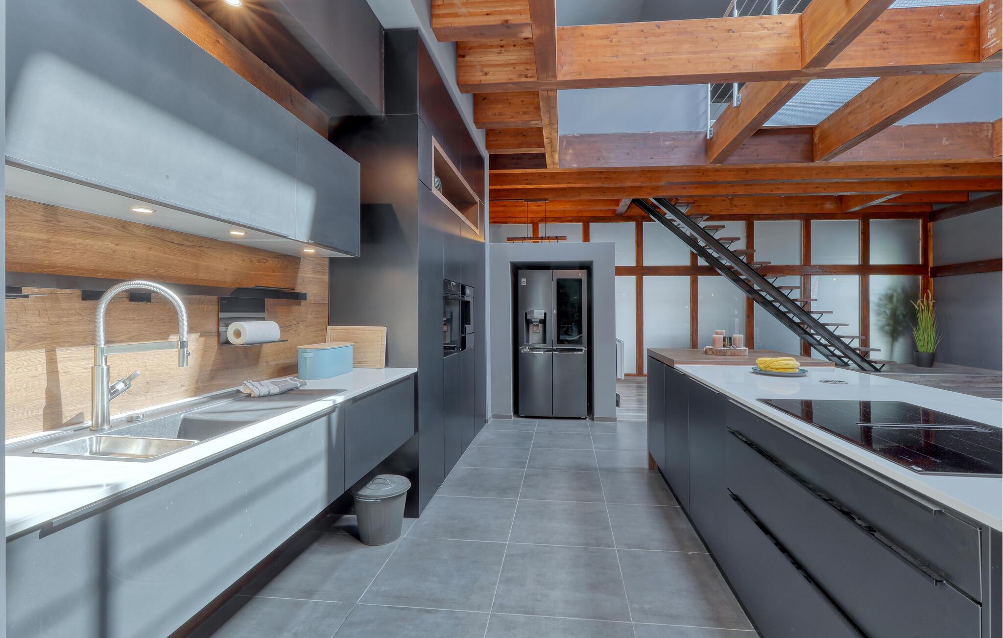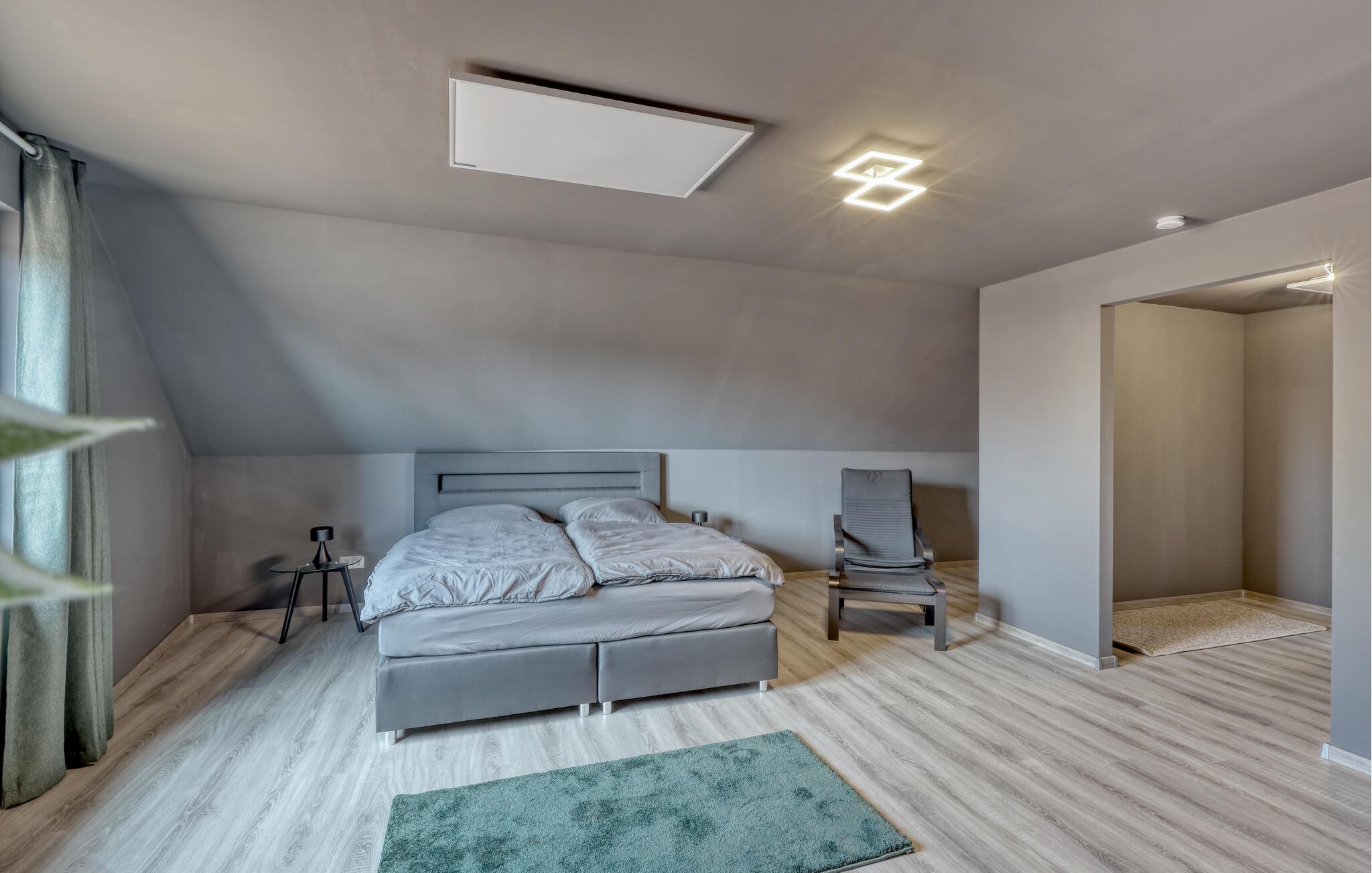 Hvis I skal på ferie som en større flok, og hvis I ikke går af vejen for ekstravagant komfort, er denne fantastiske villa et helt oplagt valg for jer. Interiøret fremtræder endog virkelig lækkert med moderne detaljer, faciliteter og møbler, der sammen med de rustikke og kæmpestore træbjælker skaber en helt særegen stemning her. De store rum får et skønt lysindfald gennem de store vinduespartier, og farverne udstråler varme og elegance, så det er nærmest umuligt ikke at slappe af, med det samme I træder ind. Køkkenet er fuldt udstyret, så lad kokkene tage sig god tid med madlavningen. Efter aftensmaden kan I gøre det lidt ekstra lækkert for jer selv med et boblebad eller en gedigen svedetur i den infrarøde sauna, mens I lægger planer for de kommende dage.