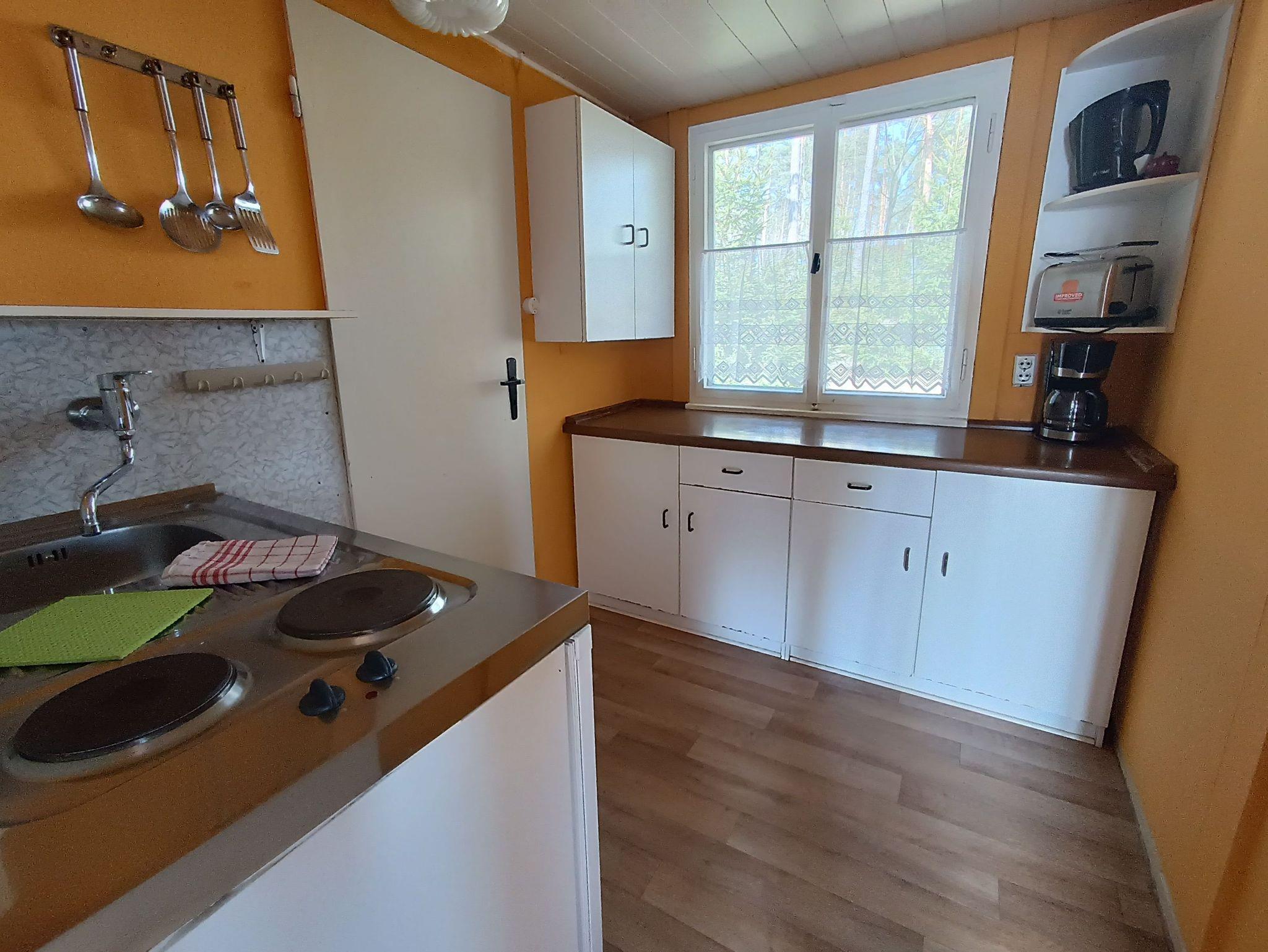 - Küche mit 2 Platten Elektroherd, Kühlschrank mit Gefrierfach, mit Kaffeemaschine, Toaster, Geschirr etc.
