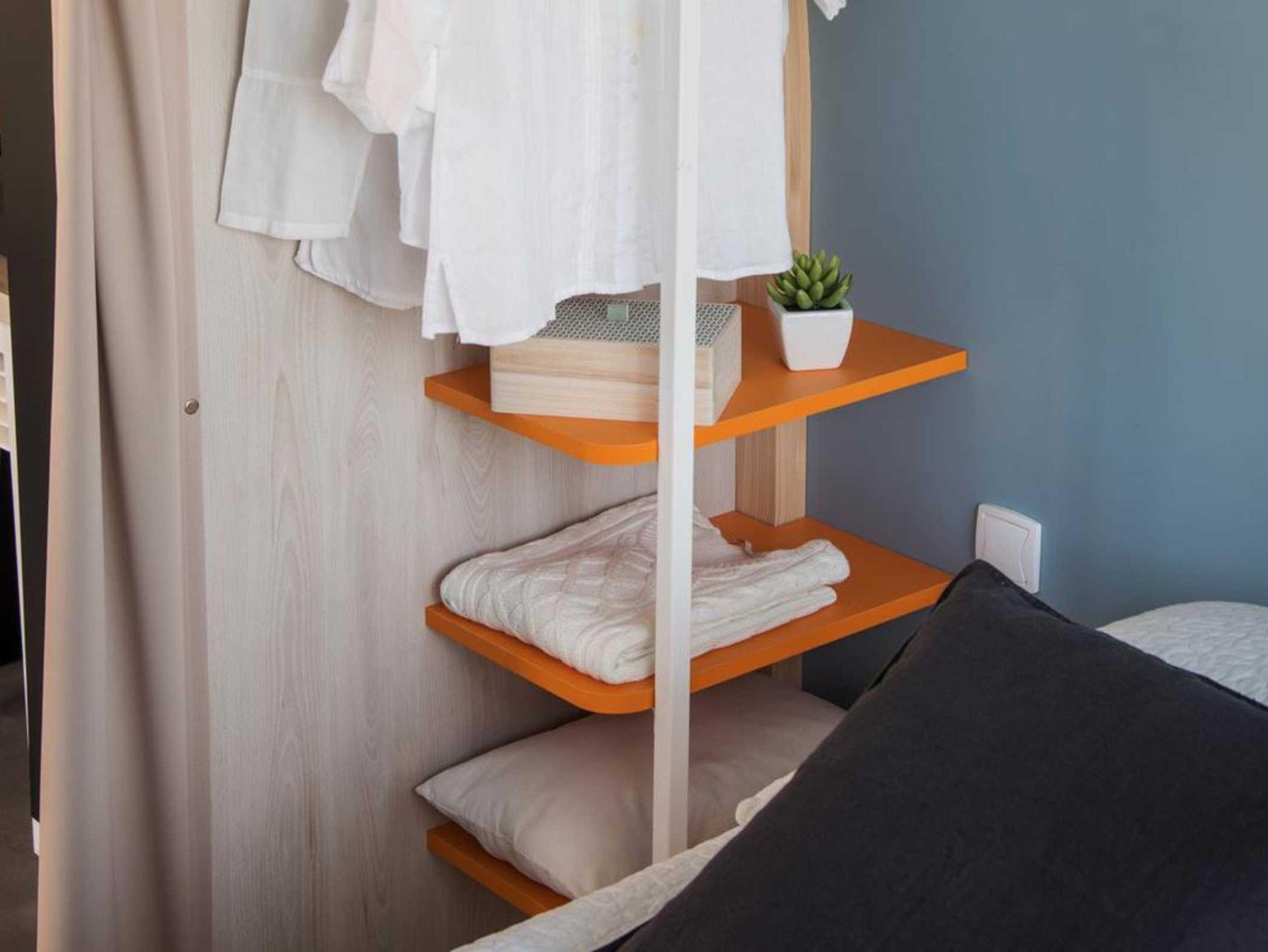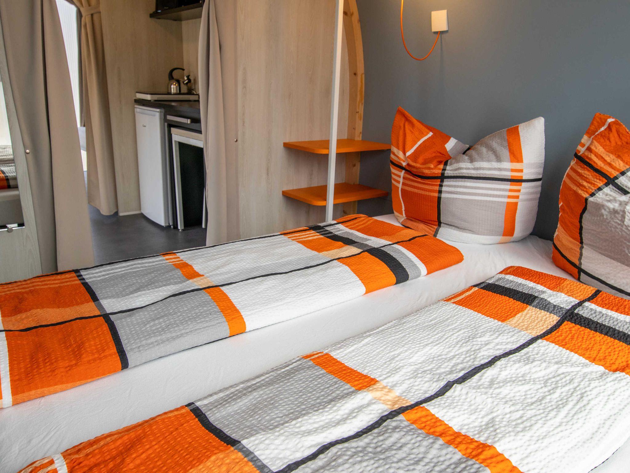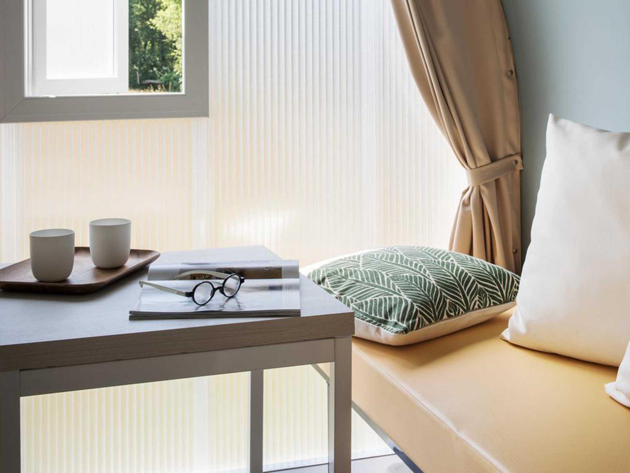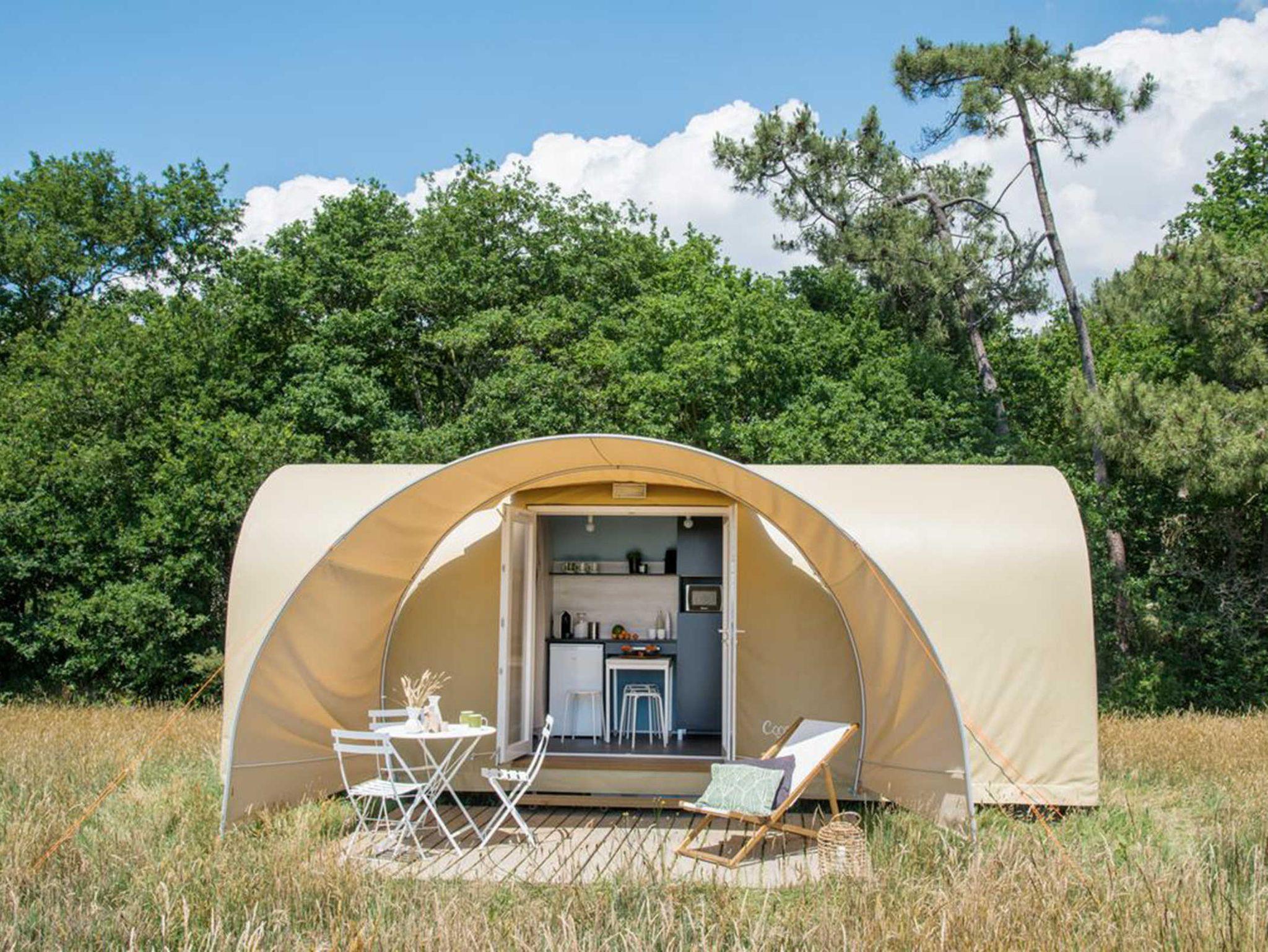 Über eine Terrasse gelangen SIe in das Coco Sweet Zelt. Über den Vorraum gelangen Sie in die beiden Schlafzimmer. Ein Schlafzimmer ist mit einem Doppelbett ausgestattet, das andere mit zwei Einzelbetten. Im Vorraum befinden sich Esstisch und vier Stühle, Kühlschrank, Mikrowelle und Kochstelle (1 Induktionsplatte).