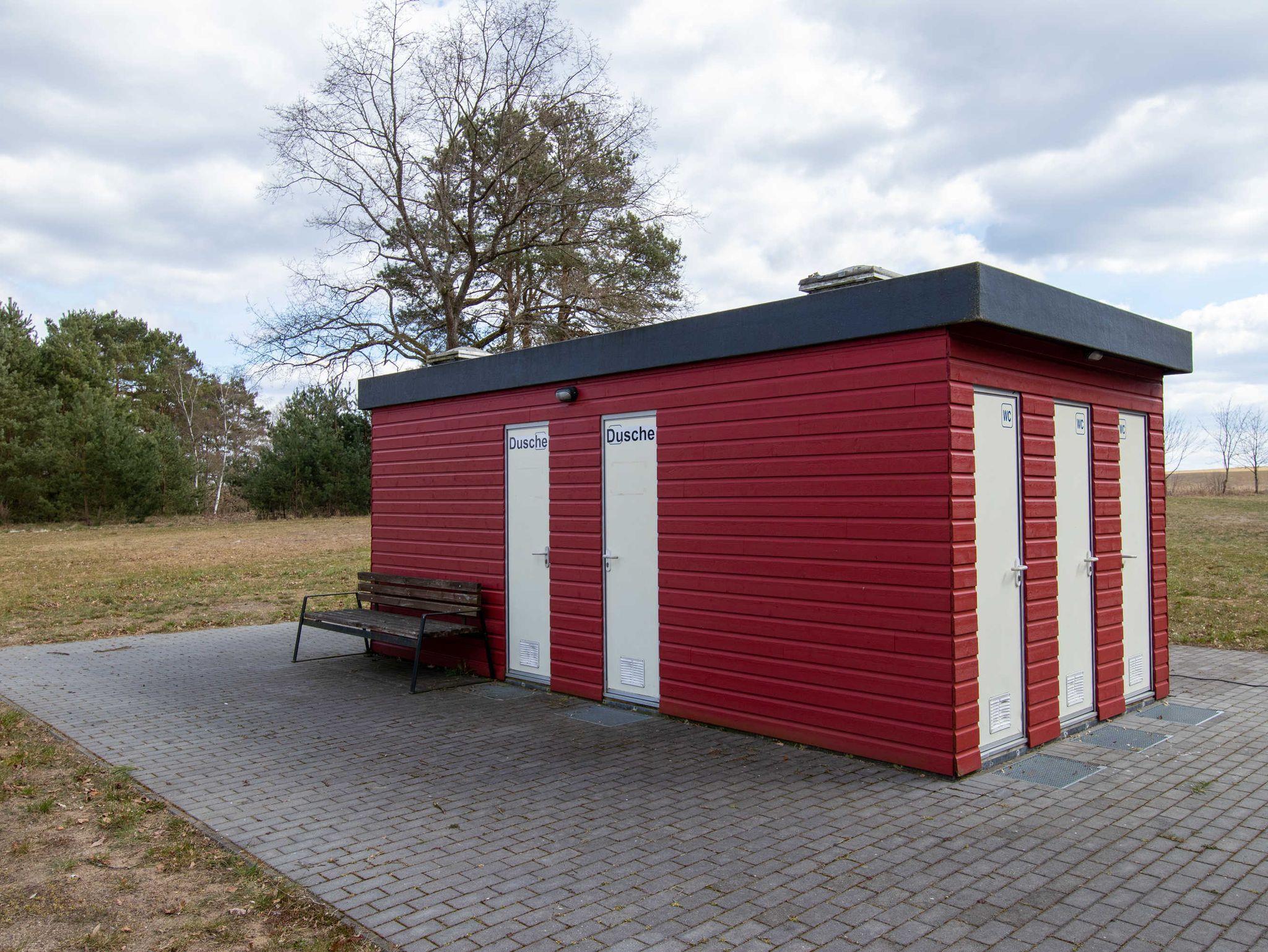 Das gemeinschaftlich genutzte Sanitärgebäude mit Einzelduschen und Toiletten befindet sich nur ca. 25 Meter von den Zelten entfernt.