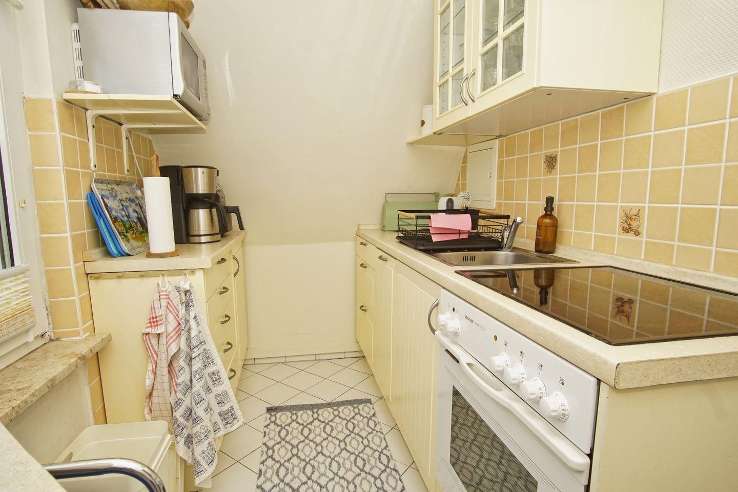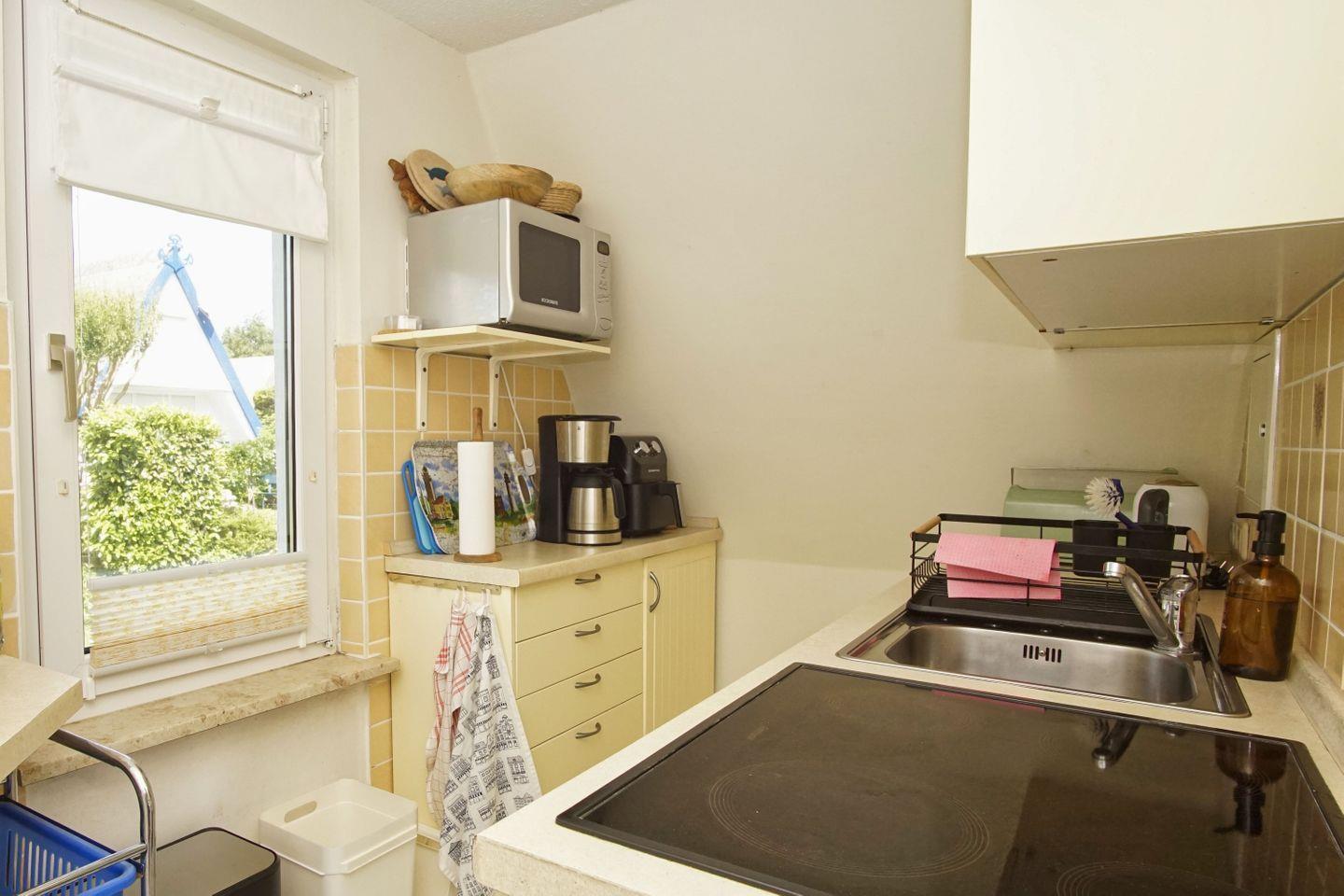 KÜCHE // geschlossene Küche, 4-Platten Ceranfeld, Backofen, Airfryer, Kühlschrank mit Gefrierfach, Mikrowelle, Toaster, Wasserkocher, Kaffeemaschine, reichlich Besteck, Geschirr und Küchenutensilien ++