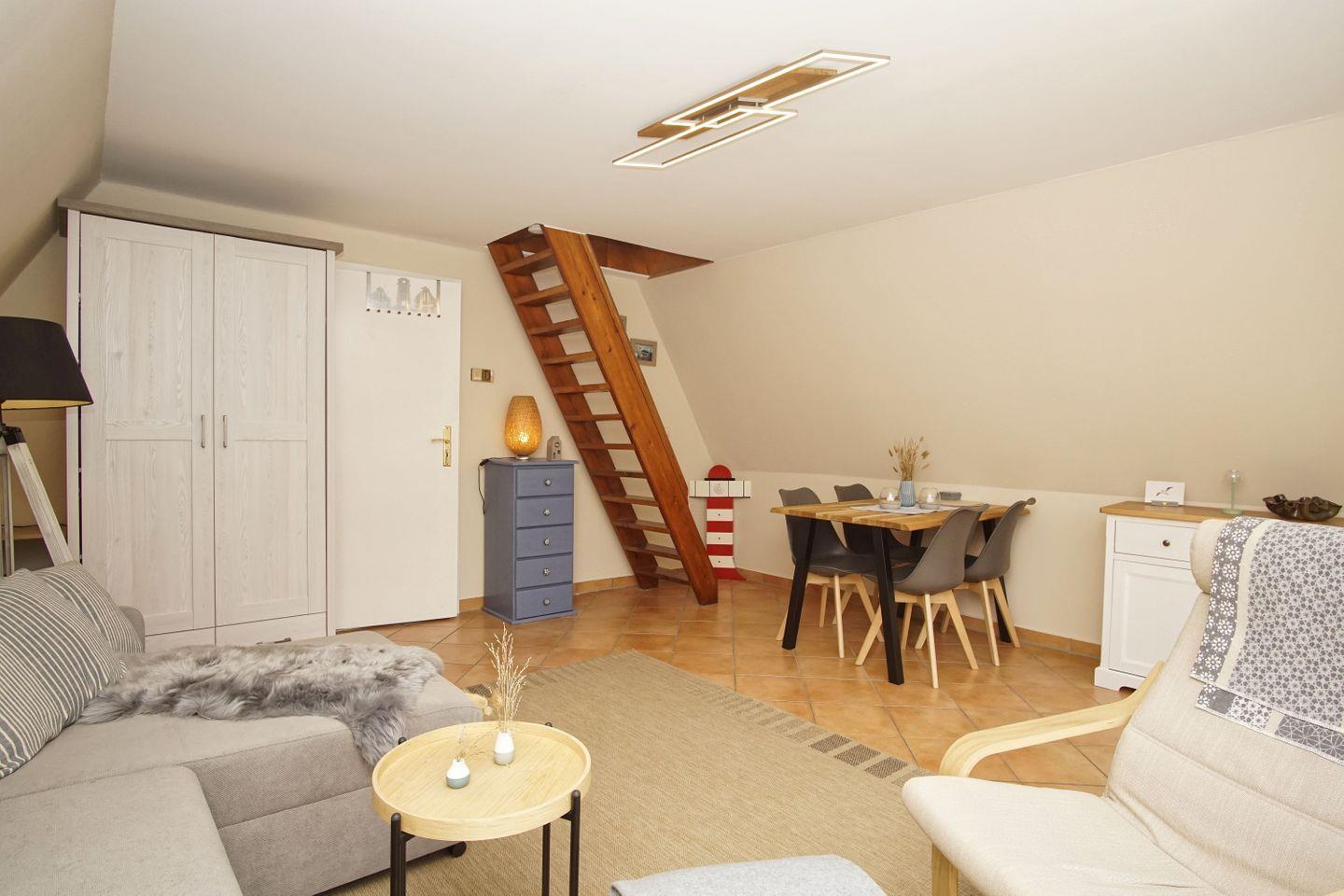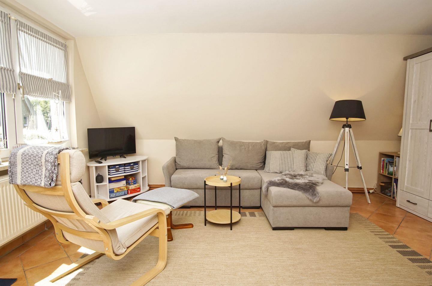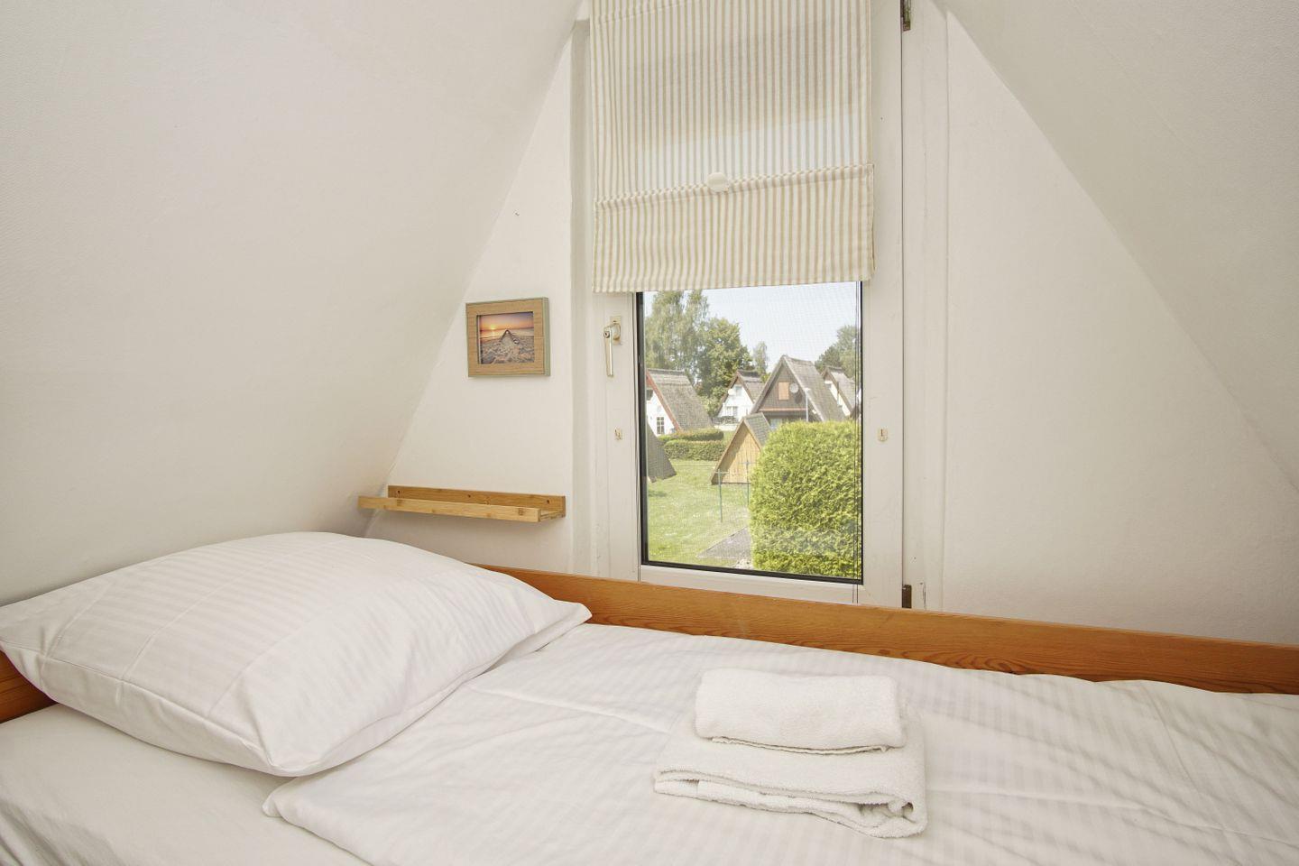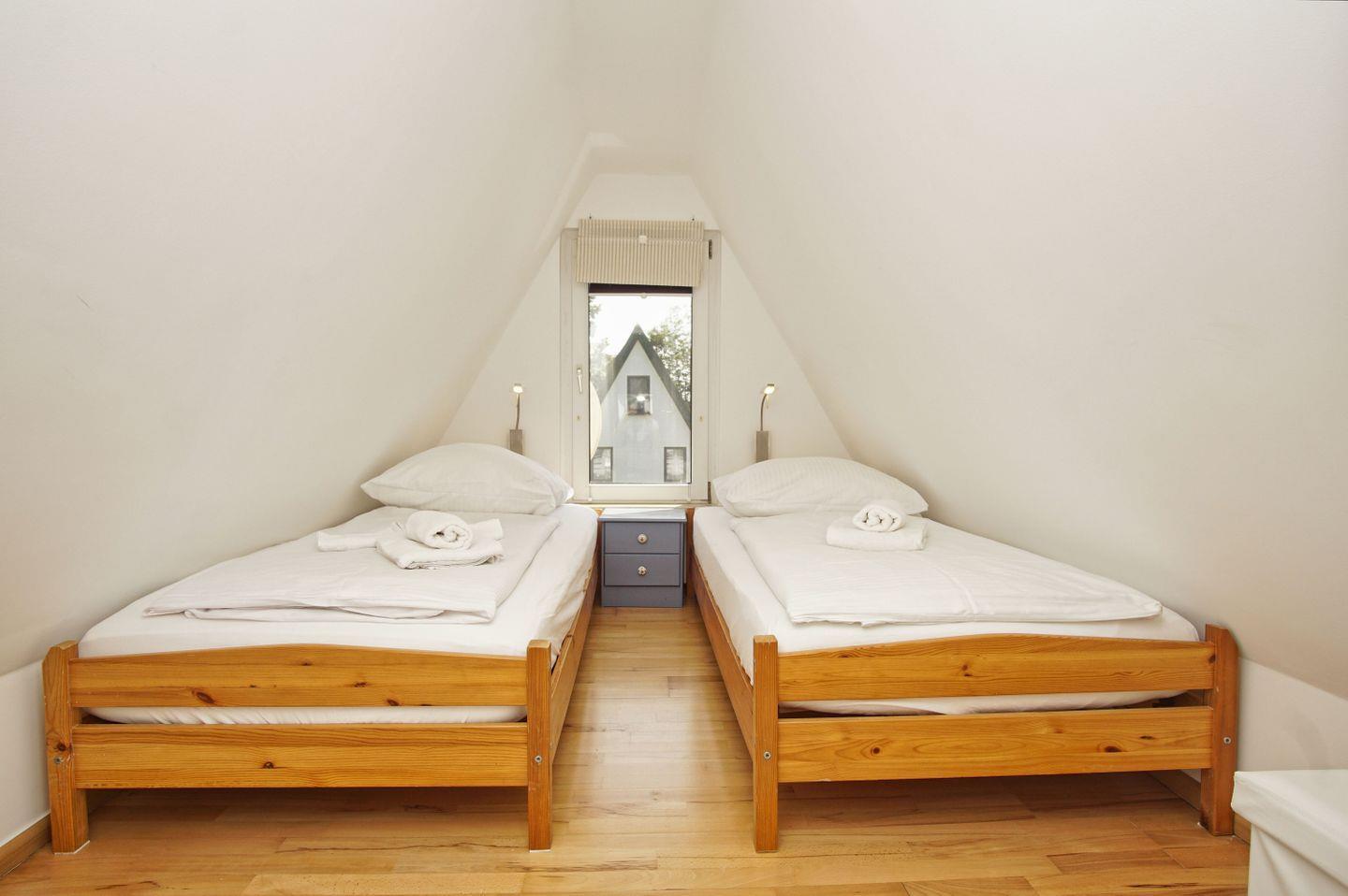 SCHLAFEN // ein Schlafzimmer mit zwei Einzelbetten, ein Schlafzimmer mit einem Einzelbett, (Schlafzimmer sind über eine steile Treppe zu erreichen, Dachschrägen in den Schlafzimmern), Schlafcouch im Wohnzimmer ++