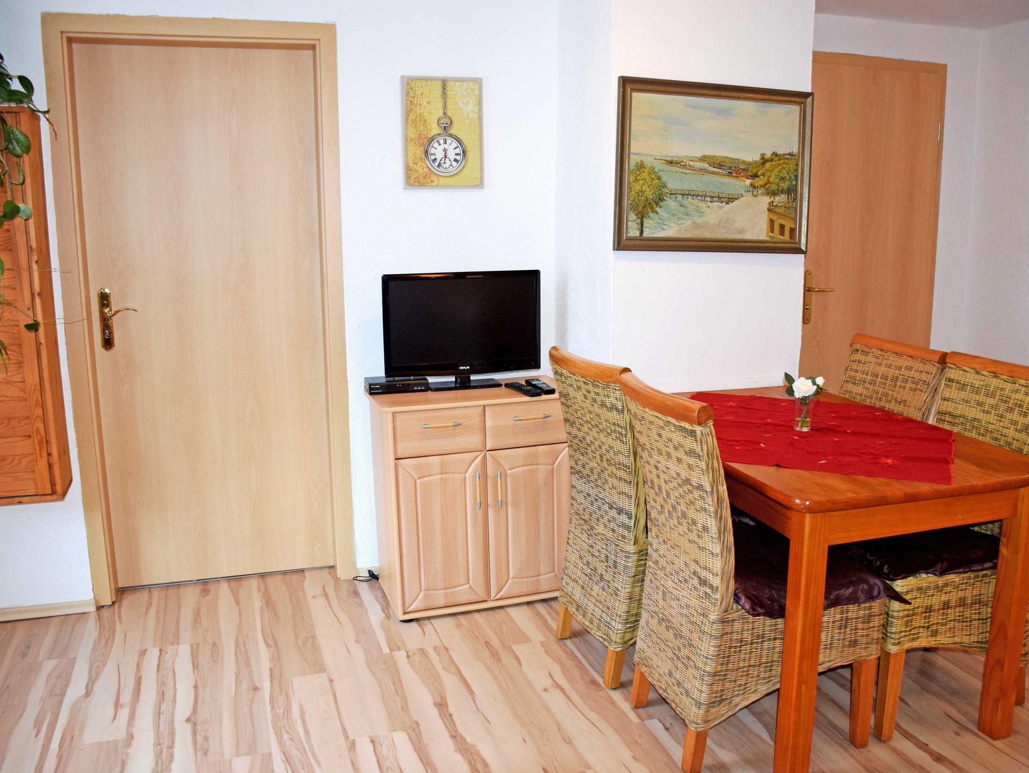 Im großen Wohnzimmer stehen eine Sitzgruppe mit Tisch und Sesseln, ein Esstisch mit Stühlen und ein Schrank mit TV - Gerät. Die Couch kann bei Bedarf für zwei Gäste aufgebettet werden. Ein kleines Kinderreisebett und ein Hochstuhl können auf Wunsch kostenlos bereit gestellt werden.