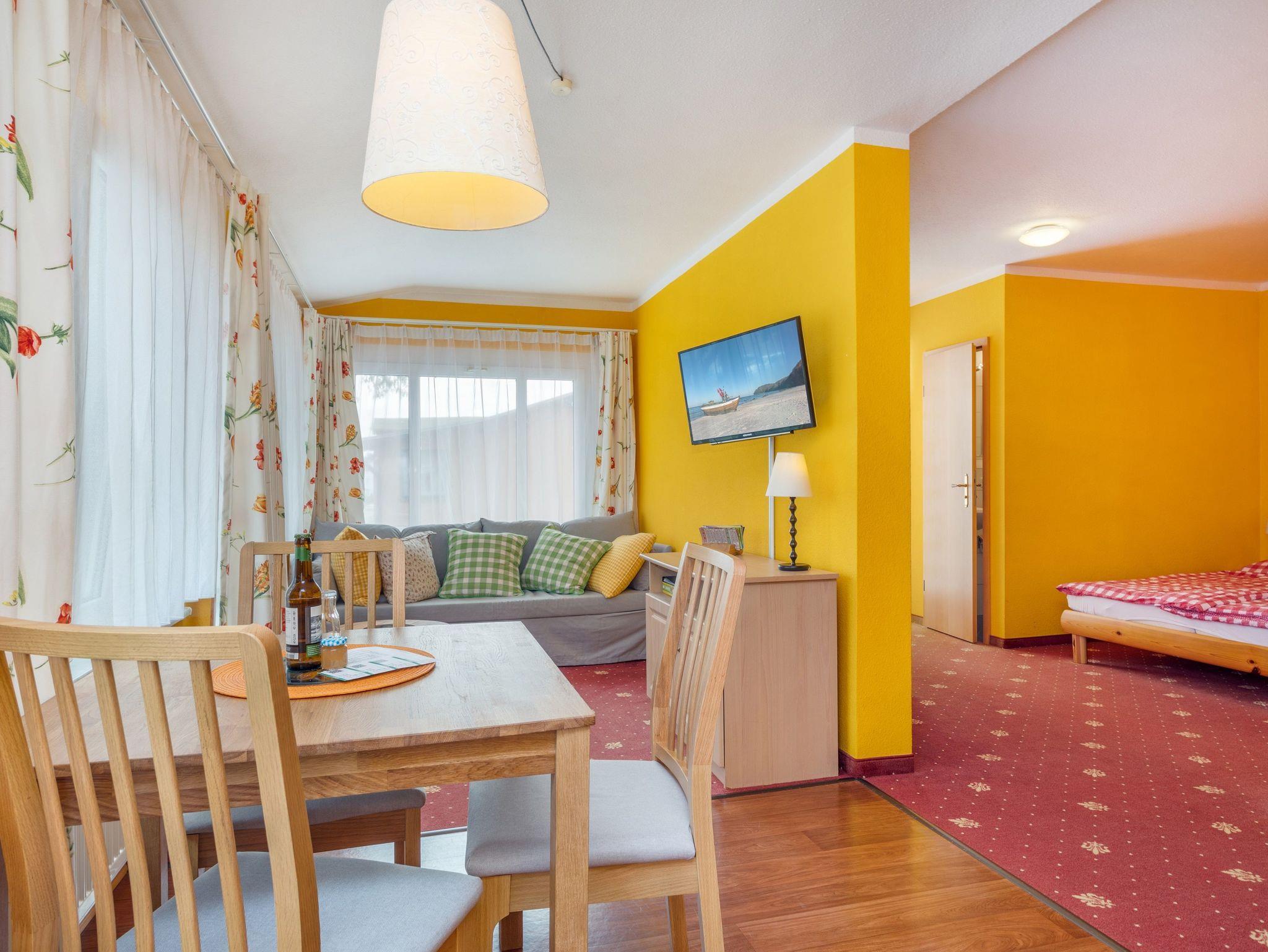 Im kombinierten Wohn-/Schlafraum befinden sich ein bequemes Doppelbett mit Nachttischen und Leselampen sowie ein Kleiderschrank, eine Schlafcouch mit Tisch und ein TV-Gerät. Hier steht auch ein Esstisch mit Stühlen.