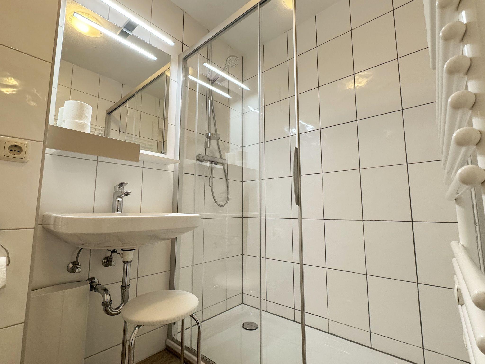 Die gemütlich eingerichtete und ruhig gelegene Nichtraucherwohnung mit ca. 55 m² und ist ideal für 2 bis max. 4 Personen geeignet. Die Wohnung 12 befindet sich in der 1. Etage. Der Wohnbereich besteht aus einem Smart-TV, Blue-Ray-Player und Mini-Stereo-Anlage, WLAN, einer Eck-Couch mit Ausziehfunktion für die 3./4. Person (1,15m x 2,20), Couchtisch, einen Ohrensessel mit Hocker, Leselampe sowie einen Esstisch mit 4 Stühlen. Angrenzend zum Wohnbereich finden Sie eine offene Küchenzeile. Diese verfügt über diverse Küchenhelfer wie zum Beispiel einem Ceranfeld mit Backofen, Kühlschrank, Geschirrspüler, Mikrowelle, Wasserkocher, Toaster, Kaffeemaschine, Pad-Maschine (Senseo) und weitere Küchenutensilien. Vom Wohn- und Essbereich aus haben Sie jeweils einen Zugang zum Balkon die beide bestuhlt sind und zusätzlich einen Sonnenschirm und eine Sonnenliege bietet. Das separate Schlafzimmer mit bodentiefen Fenstern ist mit einem Boxspringbett (1,80 m x 2,00 m), Nachttischkonsolen und einem Kleiderschrank ausgestattet. Auch vom Schlafzimmer können Sie auf den östlichen Balkon gelangen. Im innenliegenden Badezimmer runden eine Dusche, WC, Fön und ein Waschtisch den Bereich ab. Alle Räumlichkeiten sind gefliest, außer das Schlafzimmer, in dem Laminat verlegt ist. Insektenschutzgitter befinden sich zusätzlich in allen Räumlichkeiten. Ein PKW-Stellplatz (7B/12) ist für Sie reserviert und befindet sich hinter dem Haus. Für Ihre geliehenen oder auch mitgebrachten Fahrräder ist eine abschließbare Unterstellmöglichkeit vorhanden. Für unsere kleinen Gäste sind 1x Kinderreisebett (ohne Matratze und Bett Inlett) sowie 1x Hochstuhl inklusive. Haustiere nicht erlaubt. Die Erstausstattung eines Wäschepaketes (komplette Bettwäsche, 1 Duschhandtuch, 2 kleine Handtücher) können Sie bis 14 Tage vor Anreise gegen einen Aufpreis dazu buchen oder durch eigene ergänzen. Ab 2 gebuchten Paketen erhalten Sie einmalig 1 Geschirrhandtuch und 1 Duschvorleger hinzu.