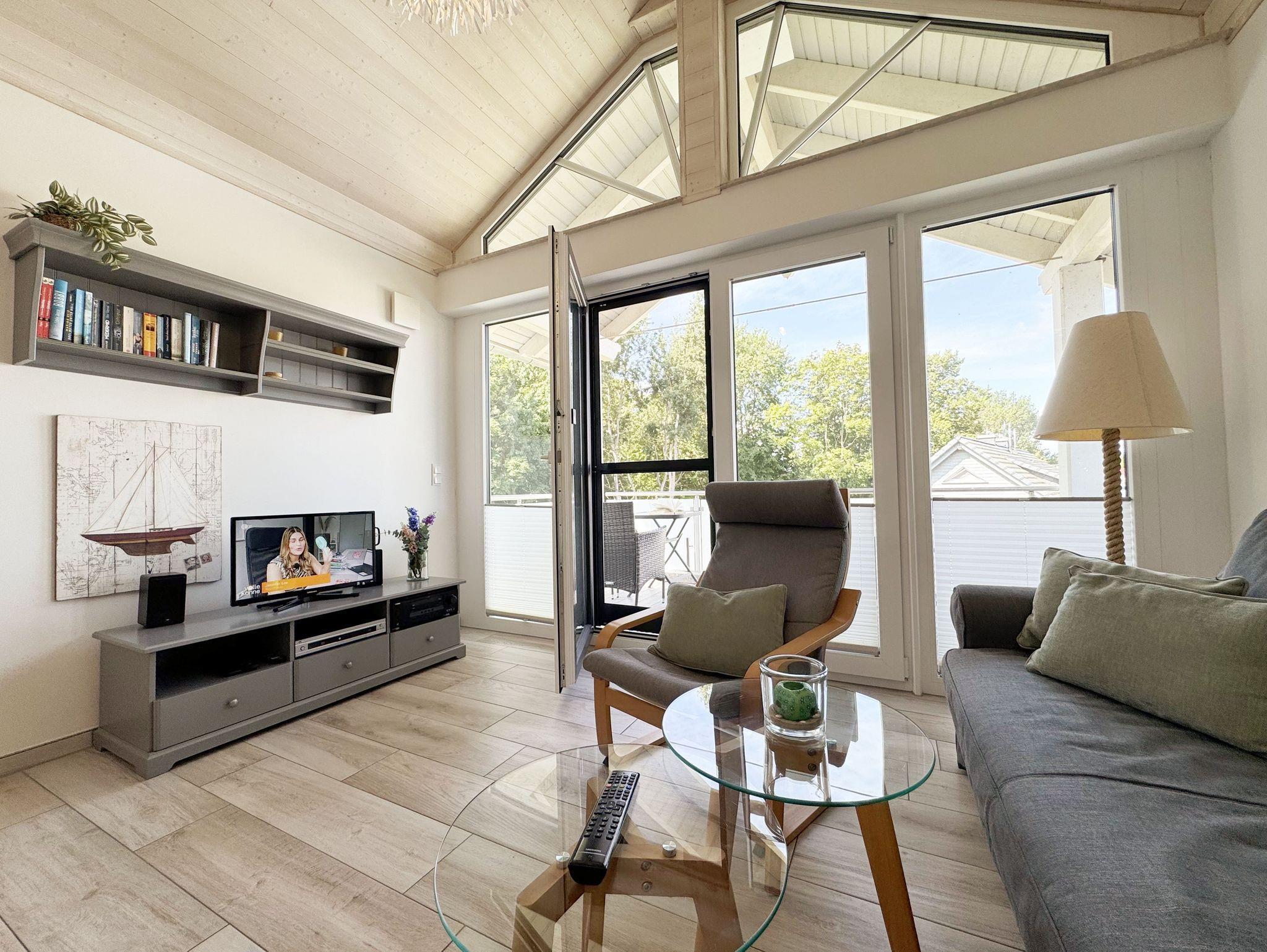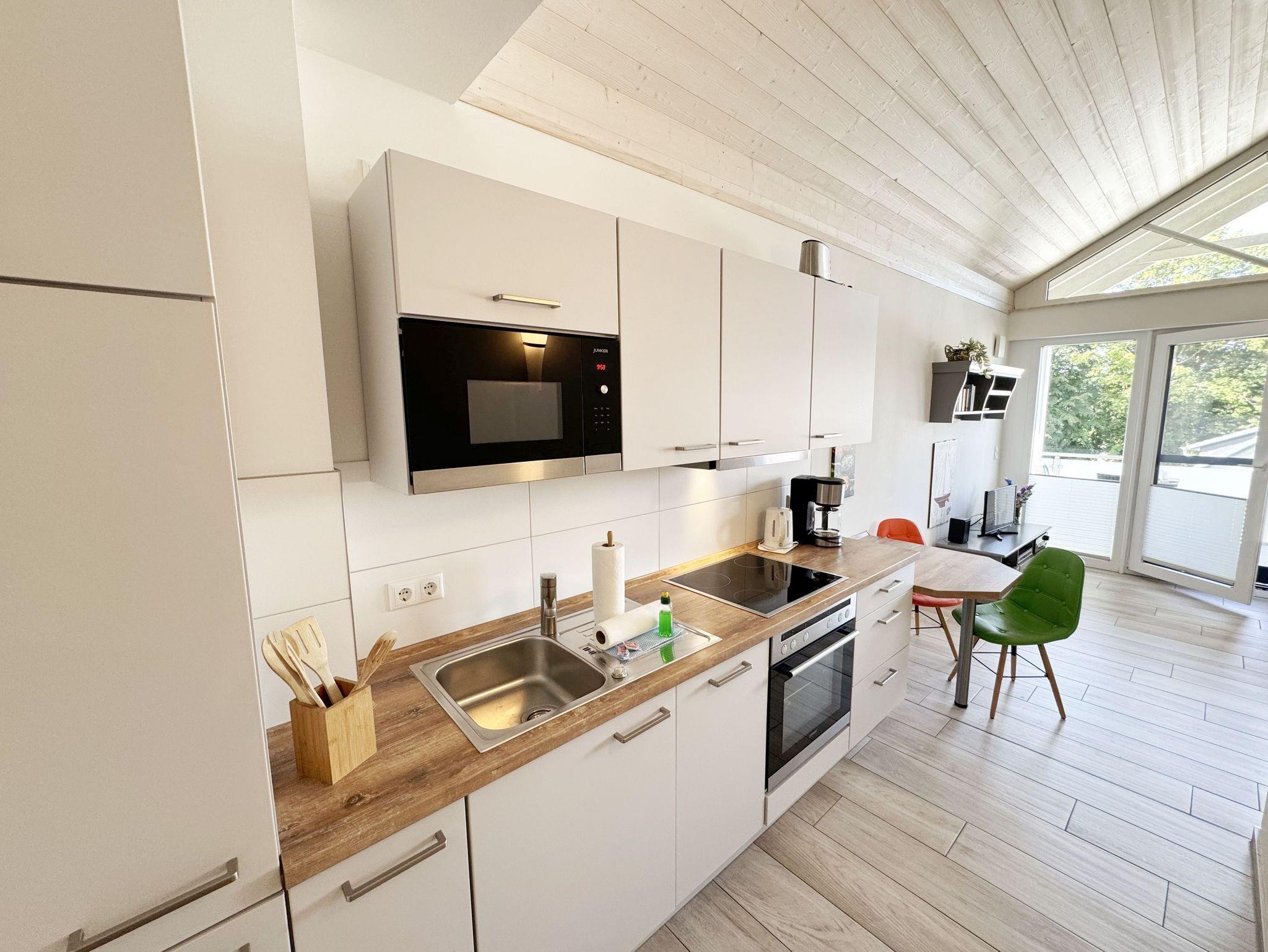 Die helle und freundliche ca. 40 m² große Nichtraucherferienwohnung befindet sich in der 2. Etage des Hauses Windrose und bietet Platz für max. 2 bis 3 Erwachsene. Sie besticht durch einen Blick in ein Gebälk bis zum Dachfirst. Durch das große Panoramafenster genießen Sie einen Ausblick auf Thiessow und ein kleines Wäldchen. Durch einen kleinen Eingangsbereich mit Garderobe erreichen Sie den offenen Wohn- und Essbereich mit Küchenzeile, welche mit einem Kühlschrank mit Gefrierfach, einem 4 -Zonen-Ceranfeld, einem Backofen, einem Geschirrspüler, einer Mikrowelle und diversen Küchenutensilien wie Kaffeemaschine, Wasserkocher, Toaster, Handmixer usw. ausgestattet ist. Ein Esstisch mit Stühlen schließt sich der Küchenzeile an. Ein Lowboard mit Smart-TV, Blue Ray-Player, Mini-Stereo-Anlage sowie eine Couch, die sich mit wenigen Handgriffen als Aufbettung für die 3. Person verwandeln lässt (1,40m x 2,00m), Couchtisch, Relax-Sessel und Leselampe prägen den Wohnbereich. Von hier gelangen Sie auf den großen, überdachten und bestuhlten Balkon (Süd/West) mit Insektenschutztür. Auch im Urlaub brauchen Sie auf einen Internetanschluss (WLAN) nicht verzichten. Dieser ist für Sie inklusive. Ein angrenzender Schlafraum mit Kleiderschrank und Doppelbett (1,60 m x 2,00 m) mit 7-Zonen-Kaltschaummatratzen sowie Nachttischablagen sorgt für Ruhe und Entspannung. Ein modernes Bad mit ebenerdiger Dusche, Handtuchtrockner, Waschtisch, Kosmetikspiegel, Fön, WC und Waschmaschine lässt keinen Wunsch offen. Für eine angenehme Wärme sorgt die Fußbodenheizung in allen Räumlichkeiten. Haustiere sind nicht erlaubt. Auf der gepflegten Außenanlage steht Ihnen ein zur Wohnung gehörender abschließbarer Fahrradschuppen (Nr. 10) für Ihre mitgebrachten oder geliehenen Fahrräder zur Verfügung. Auf dem gemeinschaftlichen Grillplatz mit Sitzmöglichkeiten können Sie Ihren Urlaubstag ausklingen lassen. Ein PKW-Stellplatz (Nr. 10) steht inklusive zur Verfügung. Die Erstausstattung eines Wäschepaketes (komplette Bettwäsche, 1 Duschhandtuch, 2 kleine Handtücher) können Sie bis 14 Tage vor Anreise gegen einen Aufpreis dazu buchen oder durch eigene ergänzen. Ab 2 gebuchten Paketen erhalten Sie einmalig 1 Geschirrhandtuch und 1 Duschvorleger hinzu.