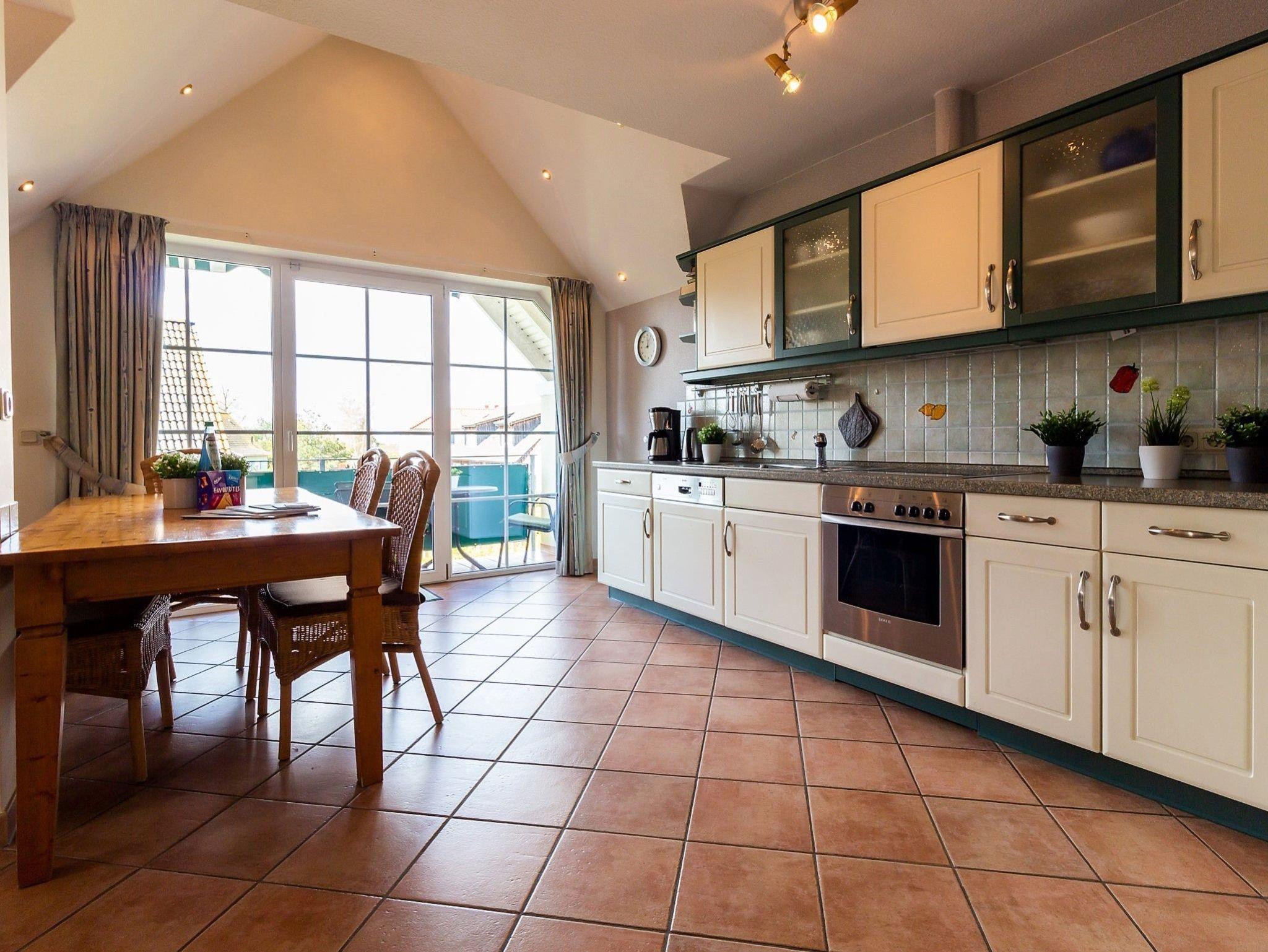 Die Wohnung ist eine Maisonette-Wohnung und besitzt 3 Schlafzimmer (2xDoppelbett, 2 Einzelbetten) und 2 komfortable Duschbäder und hat eine Größe von 115 qm. Ein Wohnzimmer und eine Küche in offener Bauweise mit offenem Kamin. Auf dem windgeschützten Südwestbalkon mit Blick zum Bodden können Sie den Tag genießen. Ausgestattet ist der Balkon mit einem Tisch, 4 Stühlen, Markise sowie einen Hochlehnstuhl mit Liegemöglichkeit. Auf der ersten Ebene sind alle Räume gefliest bis auf das Schlafzimmer, dort liegt Korkboden. In der zweiten Ebene ist das Bad gefliest, ein Schlafzimmer hat Teppichboden, der Flur und das größere Schlafzimmer haben ebenfalls Korkböden. Alle Schlafzimmer können verdunkelt werden. Fliegengitter sind zur Giebelseite an allen Fenstern vorhanden. Die Wohnung hat eine Zentralheizung und im Bad in der ersten Ebene ist ein großer Handtuchheizkörper sowie eine Fußbodenheizung. Einen Kfz-Stellplatz befindet sich unter dem Carport.