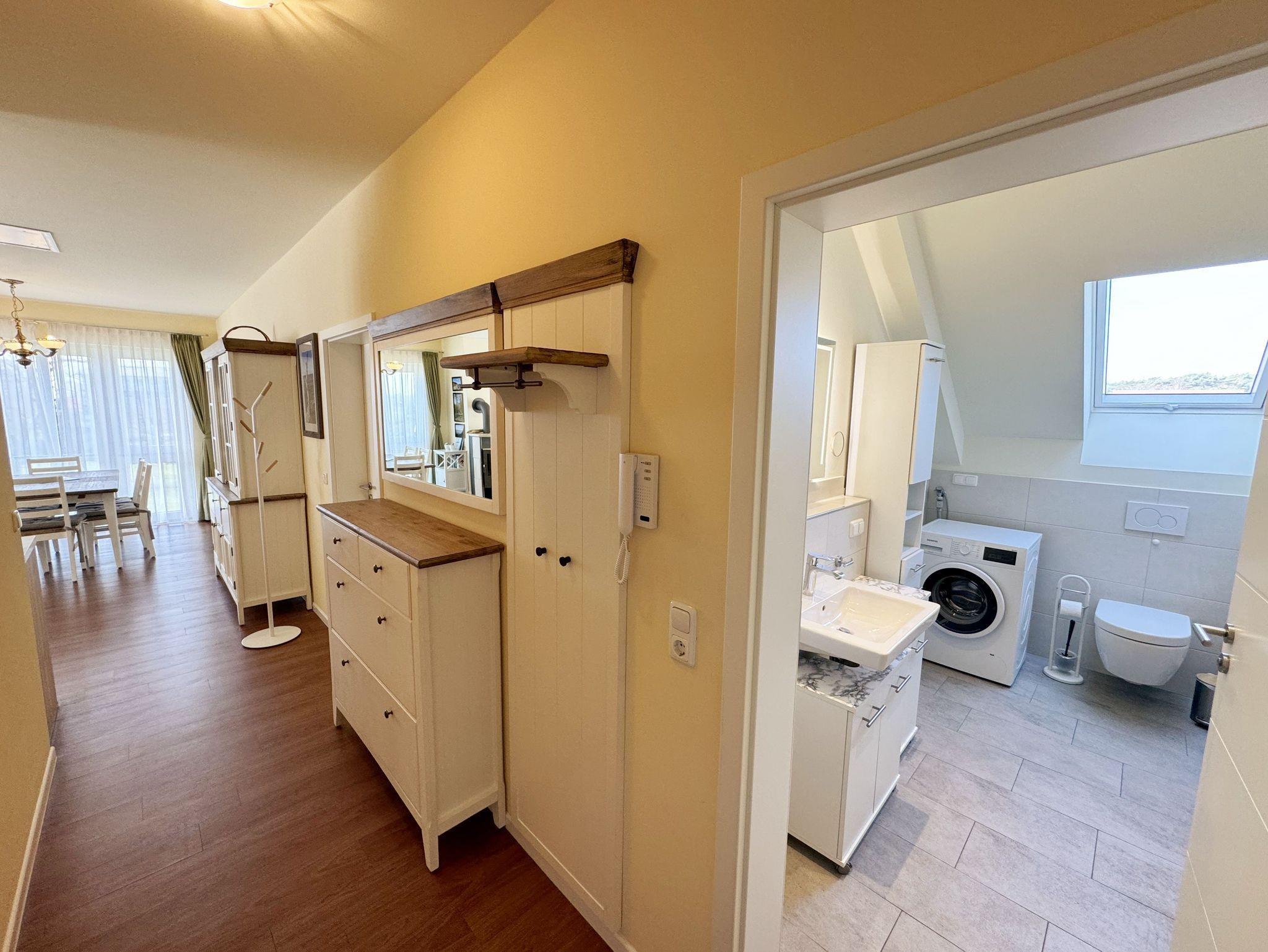 Die ca. 80 qm große Dachgeschosswohnung ist Teil des im Stile der Bäderarchitektur erbauten Ferienhauses Sterntaucher mit 8 Wohnungen. Die Nichtraucherwohnung ist modern und mit hohem Standard eingerichtet. Sie bietet Platz für 2 bis 5 Personen. Das im Landhausstil mit Massivmöbel eingerichtete Wohn-/Esszimmer besticht durch seine bodentiefen Fenster, die viel Tageslicht in die großzügigen Räume bringen. Abgerundet wird der Wohnbereich mit einer Couch (Aufbettungsmöglichkeit für die 5. Person/ 1,20m x 2,00m) mit Couchtisch, einer Leselampe, Smart-TV, Blu-Ray-Player sowie ein Radio mit CD-Player und USB-Anschluss. Diverse Gesellschaftsspiele und Bücher laden zum Entspannen in geselliger Runde oder zur gemütlichen Zweisamkeit ein. In der kälteren Jahreszeit ist der Kamin ein besonderes Highlight. Auch auf einen Internetanschluss (WLAN) müssen Sie nicht verzichten. Dieser ist für Sie inklusive. Vom Wohnbereich gelangen Sie auf den bestuhlten mit Sonnenschirm und nach Süden ausgerichteten Balkon. Die angrenzende und komfortable Küchenzeile fügt sich dem Wohnbereich an. Durch ein Cerankochfeld, einem Backofen, einem Kühlschrank mit Gefrierkombination, einer Spülmaschine, einer Kaffeemaschine, einem Wasserkocher, einem Toaster und mit ausreichenden Kochutensilien können Sie sich nach Herzenslust selbstverpflegen. Das größere Schlafzimmer verfügt über ein Doppelbett (1,80 m x 2,00 m mit Komforthöhe), Nachttischablagen, einen Kleiderschrank und Schreibtisch sowie einen Flachbild-TV. Im kleineren Schlafzimmer befinden sich neben den beiden Einzelbetten (0,90 m x 2,00 m) Nachttischablagen, ein Garderobenschrank sowie ein Schreibtisch. Beide Schlafzimmer können mit Fensterläden verdunkelt werden. Das Badezimmer mit Tageslicht ist mit einer ebenerdige Glasdusche, einem Waschtisch, einem WC, einer Waschmaschine, einem Kosmetikspiegel, einem Fön und einem beheizbarem Handtuchtrockner ausgestattet. Alle Räumlichkeiten wurden mit einer mit Fußbodenheizung ausgestattet. Im Hauswirtschaftsraum befinden sich diverse Reinigungsutensilien sowie ein Wäscheständer, ein Bügelbrett und ein Bügeleisen. Im Schlafzimmer und in der Balkontür befinden sich Insektenschutzgitter. Haustiere sind nicht erlaubt. Für unsere kleinen Gäste steht 1x Kinderreisebett (ohne Bett Inlett/ohne Zusatzmatratze) und 1x Hochstuhl inklusive zur Verfügung. Einen PKW-Stellplatz (Nr. 08) finden Sie direkt am Objekt sowie auch einen wohnungseigenen Schuppen (Nr. 08), wo Sie Ihre geliehenen oder mitgebrachten Fahrräder unterstellen können. Die Erstausstattung eines Wäschepaketes (komplette Bettwäsche, 1 Duschhandtuch, 2 kleine Handtücher) können Sie bis 14 Tage vor Anreise gegen einen Aufpreis dazu buchen oder durch eigene ergänzen. Ab 2 gebuchten Paketen erhalten Sie einmalig 1 Geschirrhandtuch und 1 Duschvorleger hinzu.