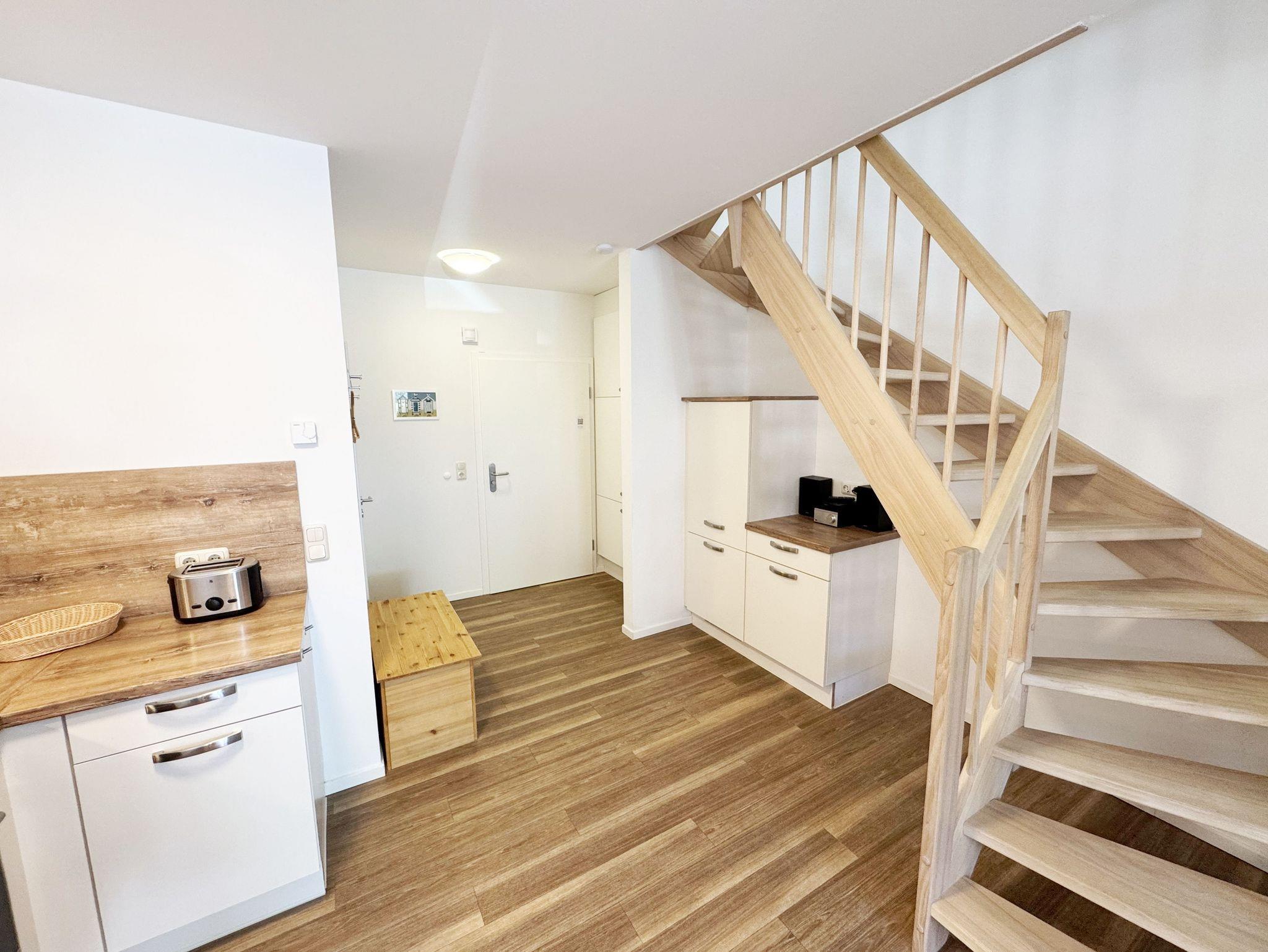 Die großzügige, moderne 2 Raumwohnung (Nichtraucher) mit ca. 63 qm aufgeteilt über 2 Etagen mit Innentreppe, einer Südwest Terrasse mit knapp 8 qm und einen Südwest Balkon mit knapp 4 qm wurde mit Möbeln im modernen Stil ausgestattet. Die Wohnung ist ideal für 1 bis 4 Personen ausgelegt. Der Wohn-, Koch- und Essbereich findet auf einer Ebene statt. Im Obergeschoss befindet sich ein Schlafzimmer mit Doppelbett (2x 0,90m x2,00m), Kleiderschrank und einen Schreibtisch. Hier befindet sich auch das Bad mit ebenerdiger Dusche, Handtuchtrockner, WC, Waschtisch und Fön. Ein Gäste-WC befindet sich zusätzlich im unteren Bereich. In allen Räumen sorgen Fußbodenheizungen mit Einzelraumregelung für angenehmes Wohnklima. Die großen Terrassentüren im Schlaf- und Wohnbereich sind mit elektrischen Rollläden sowie Insektenschutzgitter versehen. Die Küchenzeile mit Geschirrspüler, Ceranfeld mit Umluft Haube, Backofen, Kühlschrank mit Gefrierfach, Kaffeemaschine, Toaster, Wasserkocher, Esstisch und kleine Küchenhelfer runden die Ausstattung für die Selbstverpflegung ab. Im Wohnbereich vor der Terrasse gibt es eine Schlafcouch (Aufbettungsmöglichkeit für 3./4. Person, 1,50m x 2,10m), Tisch, Sessel, Smart-TV, Radio/CD und Blu-Ray-Player. Für die kälteren Tage steht Ihnen auch ein Kaminofen zur Verfügung (kein Brennholz vorhanden). Auch auf einen Internetanschluss (WLAN) brauchen Sie im Urlaub nicht verzichten. Dieser ist für Sie inklusive. Die Terrasse und der Balkon sind mit Tisch und Stühlen ausgestattet. 1 Haustier ist gegen eine Gebühr erlaubt. Ein PKW-Stellplatz Nr. 03 und ein verschließbarer Schuppen für Fahrräder gehören zur Wohnung dazu. Die Erstausstattung eines Wäschepaketes (komplette Bettwäsche, 1 Duschhandtuch, 2 kleine Handtücher) können Sie bis 14 Tage vor Anreise gegen einen Aufpreis dazu buchen oder durch eigene ergänzen. Ab 2 gebuchten Paketen erhalten Sie einmalig 1 Geschirrhandtuch und 1 Duschvorleger hinzu.