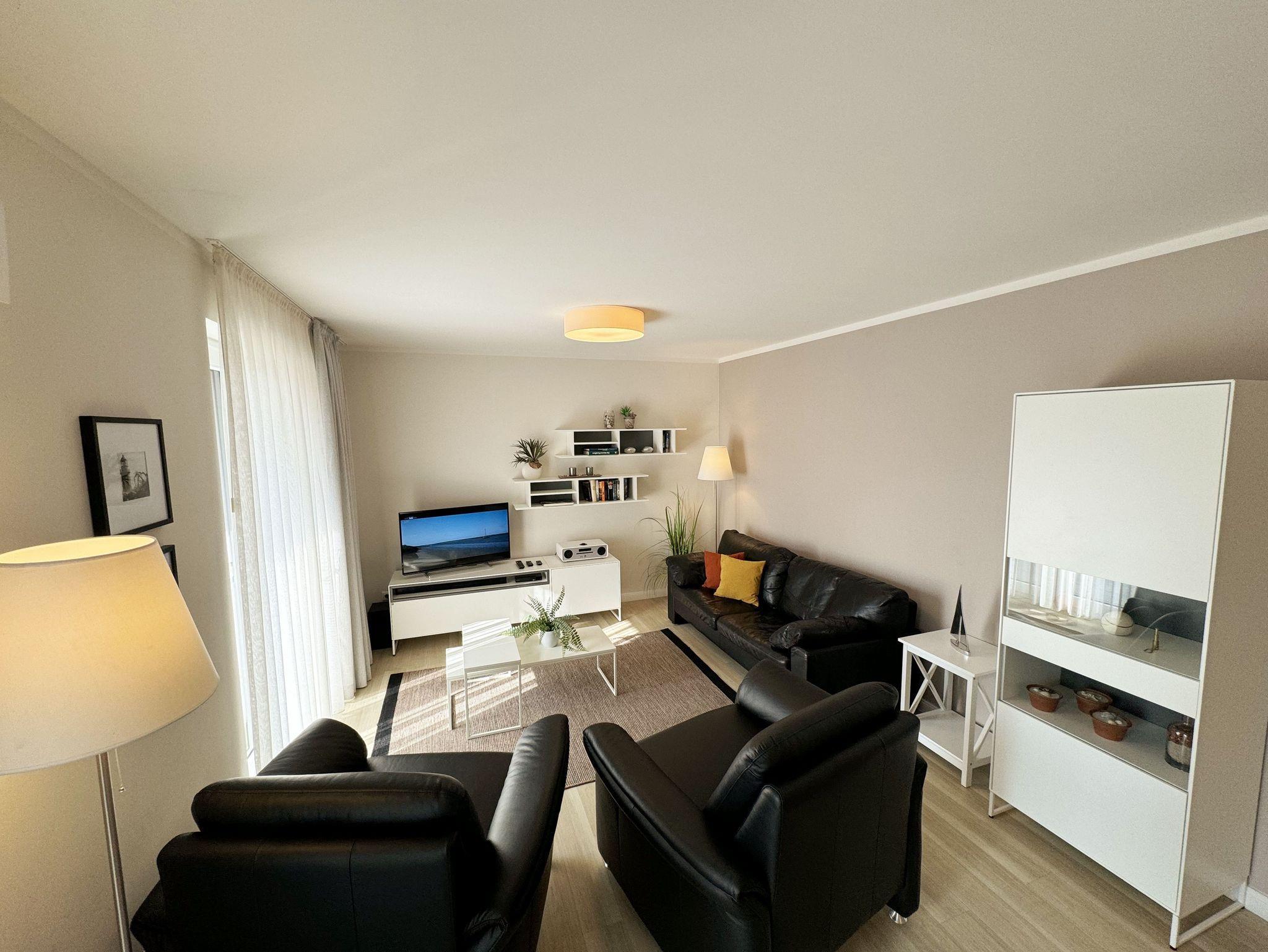 Die 70 m² große Nichtraucherwohnung Nr. 02 Seeschwalbe im Haus Windrose befindet sich im Erdgeschoss und bietet Ihnen Platz für 2 bis max. 4 Erwachsene. Eine durchdachte Raumaufteilung sowie eine hochwertige Ausstattung bieten Ihnen alle Möglichkeiten für einen erholsamen Urlaub. Die eingerichtete Einbauküche befindet sich im kombinierten Koch-/Essbereich. Ein Geschirrspüler, ein Kühlschrank mit Eisfach, 4 Zonen Ceranfeld mit Backofen, eine Kaffeemaschine Mokkamaster KBG Select, ein Toaster, ein Wasserkocher, sowie diverse Küchenutensilien bietet Ihnen somit alles, was Sie zum Kochen benötigen. Im angrenzenden Essbereich steht ein großer Esstisch mit 4 Stühlen zur Verfügung. Von dem Ess-/Wohnbereich gelangen Sie direkt auf die bestuhlte 26 m² Terrasse (Süd/West) davon 13 m² überdacht sowie ein Sonnenschirm und Relaxsessel. Entspannen und Relaxen Sie in einem Wohnbereich der mit modernen weißen Hülsta Möbeln, eine gemütliche Ledercouch sowie 2 Sessel, zwei Couchtischen und zwei Stehlampen ausgestattet ist. Ein DAB-Radio mit CD-Player und Bluetooth, ein Smart-TV mit Soundbar, ein Blu-Ray-Player sowie diverse Gesellschaftsspiele tragen zu Ihrer Unterhaltung bei. Auch im Urlaub brauchen Sie auf einen Internetanschluß (WLAN) nicht verzichten. Dieser ist für Sie inklusive. Ein Schlafzimmer ist mit einem großen Schwebetürenschrank für Ihre Urlaubsgarderobe, mit einem bequemen Boxspringbett Hülsta (1,80 m x 2,00 m, durchgehender Topper), zwei Nachttischablagen und zwei Leselampen ausgestattet. Das kleine Schlafzimmer ist mit zwei übereckstehenden Liegen (0,80 m x 2,00 m), zwei Leselampen, diversen Ablagemöglichkeiten und zwei kleinen Schränken eingerichtet. Das moderne Bad mit Waschplatz, WC, Fön, Spiegelschrank, Kosmetikspiegel, einer ebenerdigen komfortablen Regendusche mit Echtglasabtrennung und einen Handtuchtrockner runden den Sanitärbereich ab. Eine Waschmaschine, ein Wäscheständer, ein Bügeleisen mit Bügelbrett, sowie ein Staubsauger stehen Ihnen zur Verfügung. Alle Räumlichkeiten sind mit Insektenschutzgitter, einer Fußbodenheizung sowie einer Raumlüftungsanlage ausgestattet und können durch Fensterläden verdunkelt werden. Ein PKW kann auf dem kostenfreien Stellplatz Nr. 02 direkt am Haus geparkt werden. Ihre mitgebrachten oder geliehenen Fahrräder können Sie in den zur Wohnung gehöhrenden abschließbaren Abstellraum Nr. 02 (am PKW Stellplatz) unterbringen. Hier befindet sich auch eine Anschlussmöglichkeit zum Aufladen von Pedelecs. Direkt am Haus befindet sich ein Grillplatz mit Sitzgelegenheiten. Haustiere sind nicht erlaubt. Die Erstausstattung eines Wäschepaketes (komplette Bettwäsche, 1 Duschhandtuch, 2 kleine Handtücher) können Sie bis 14 Tage vor Anreise gegen einen Aufpreis dazu buchen oder durch eigene ergänzen. Ab 2 gebuchten Paketen erhalten Sie einmalig 1 Geschirrhandtuch und 1 Duschvorleger hinzu. Wir wünschen Ihnen einen traumhaften und angenehmen Urlaub an der Ostsee, erholen Sie sich gut.