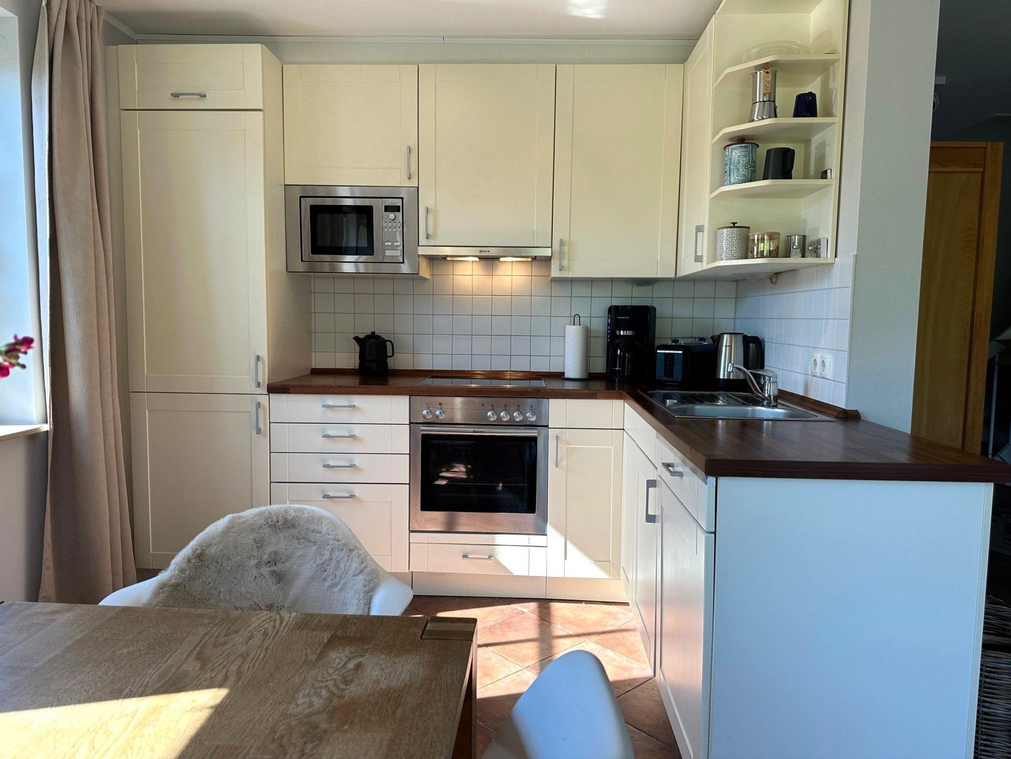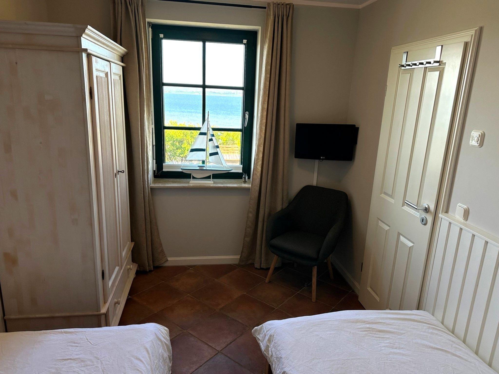 Ein großer, drehbarer Fernseher kann sowohl vom Essbereich und der Küche als auch direkt vom Sofa aus genutzt werden. Zusätzlich stehen ein DVD-Player, eine Stereoanlage, eine Auswahl an Büchern sowie Spiele zur Verfügung. Verbringen Sie gemeinsam Zeit am großen Esstisch oder kochen Sie in der voll ausgestatteten offenen Küche mit Kühl-Gefrierkombination, Cerankochfeld, Dunstabzugshaube, Geschirrspüler, Toaster, Mikrowelle, Wasserkocher und Filterkaffeemaschine. Das Schlafzimmer mit Blick auf den Bodden verfügt über zwei Einzelbetten und einen Fernseher. Das separate Duschbad befindet sich gegenüber dem Schlafzimmer. Unter der Treppe befindet sich ein kleiner Abstellraum.