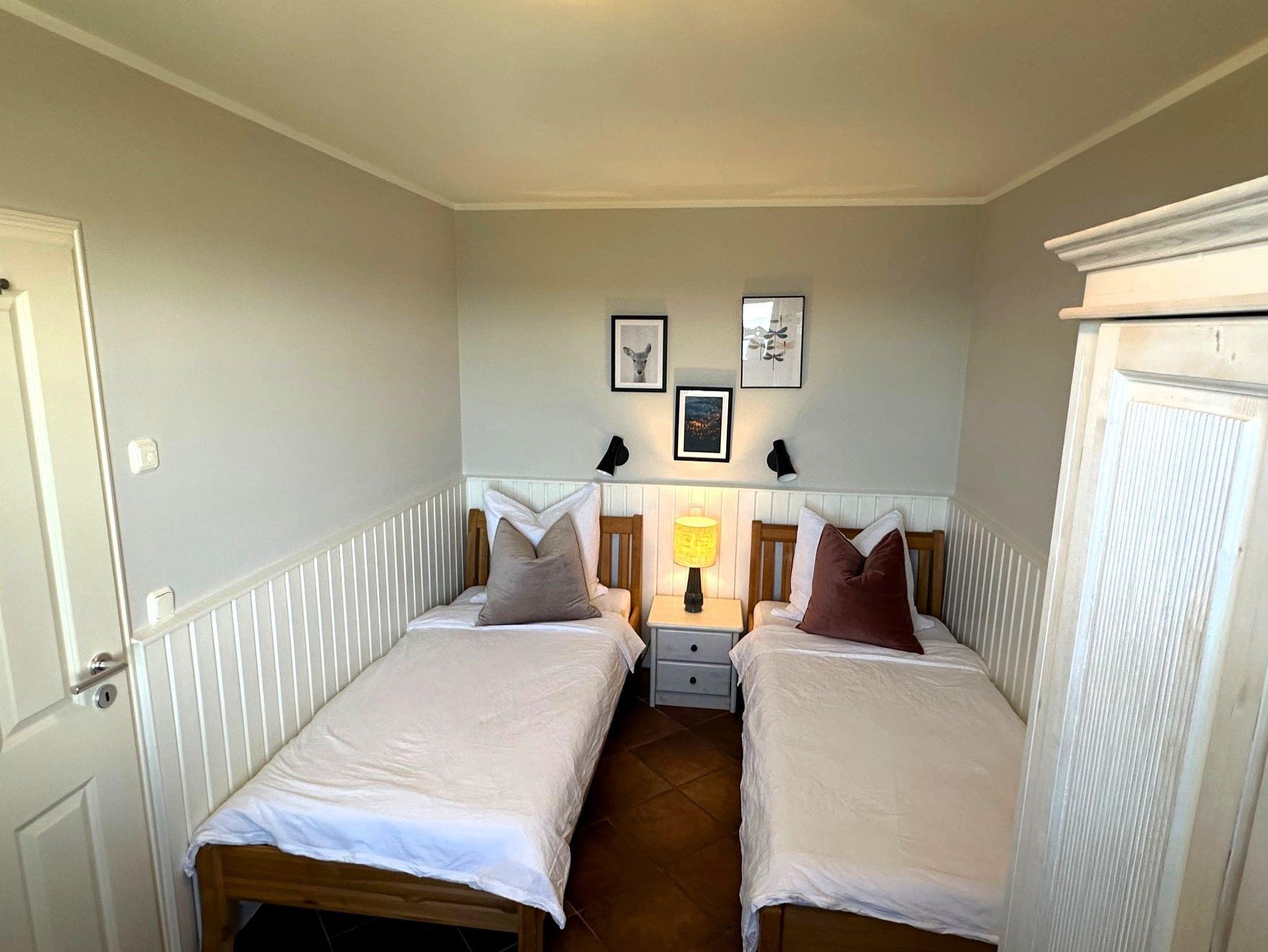 Im Obergeschoss erwarten Sie zwei Schlafzimmer mit Doppelbett sowie ein geräumiges Bad mit Badewanne, Dusche, zwei Waschbecken und einem separaten WC. Eine Waschmaschine und ein Trockner stehen zur Nutzung bereit. Im oberen Bad befindet sich auch die geräumige Sauna, die jeden Aufenthalt zum Wellnessurlaub macht.