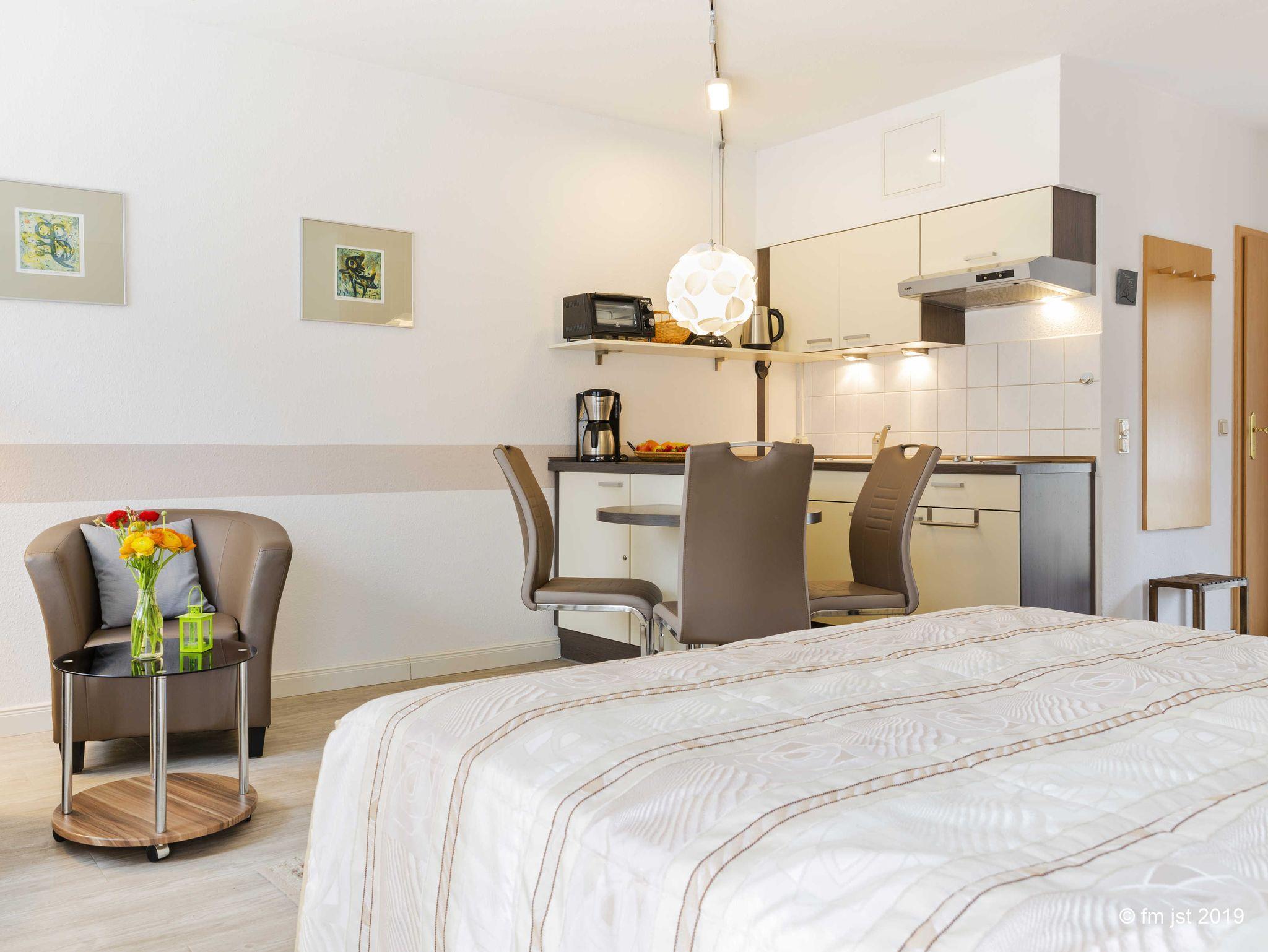 Die Ferienwohnung bietet Platz für zwei bis drei Personen. Die Wohnung bietet Ihnen einen Wohn- Schlafbereich mit Anbindung zur offenen Küche. Im Vorraum befindet sich eine Schlafcouch und ein Kleiderschrank.