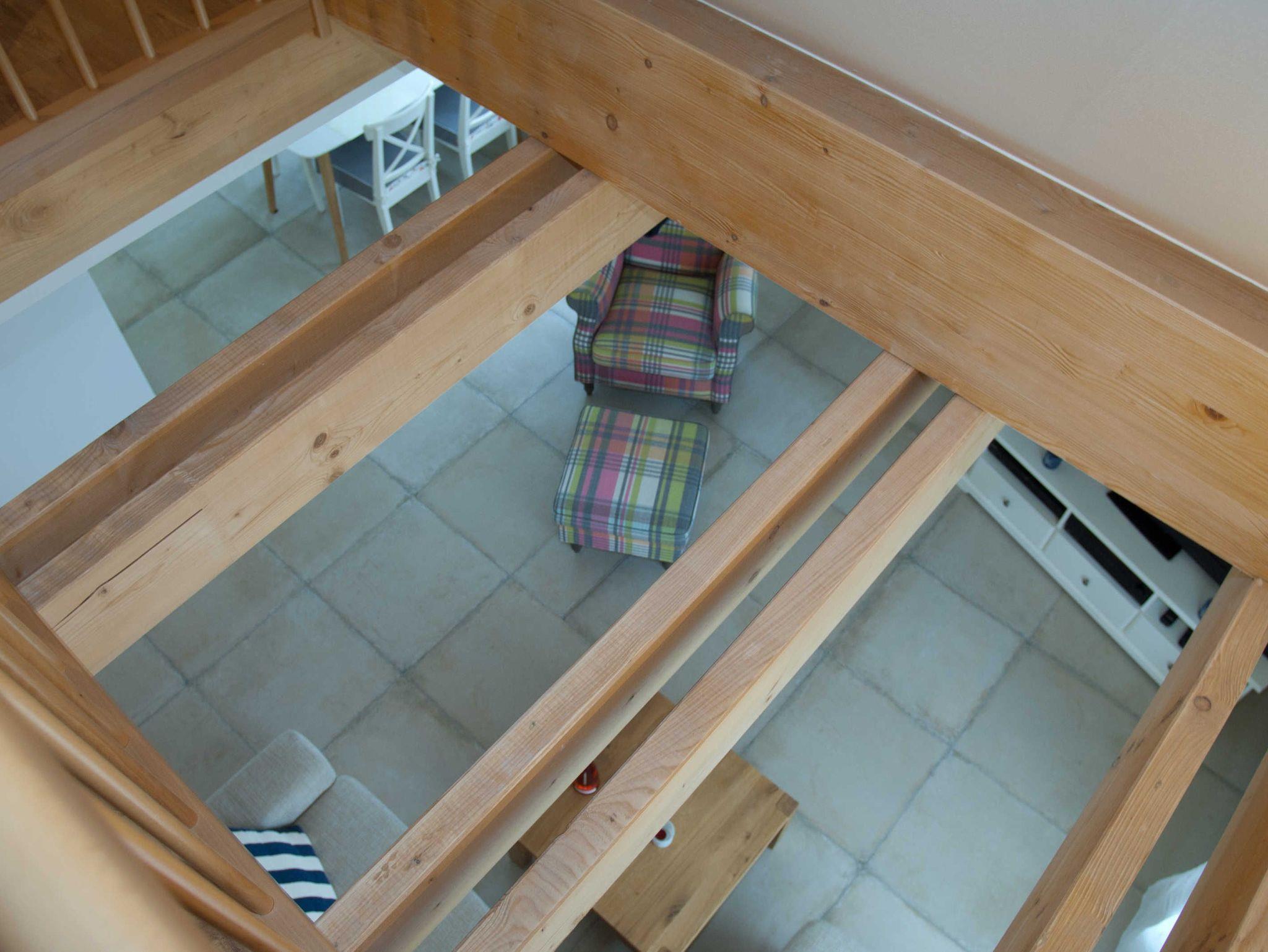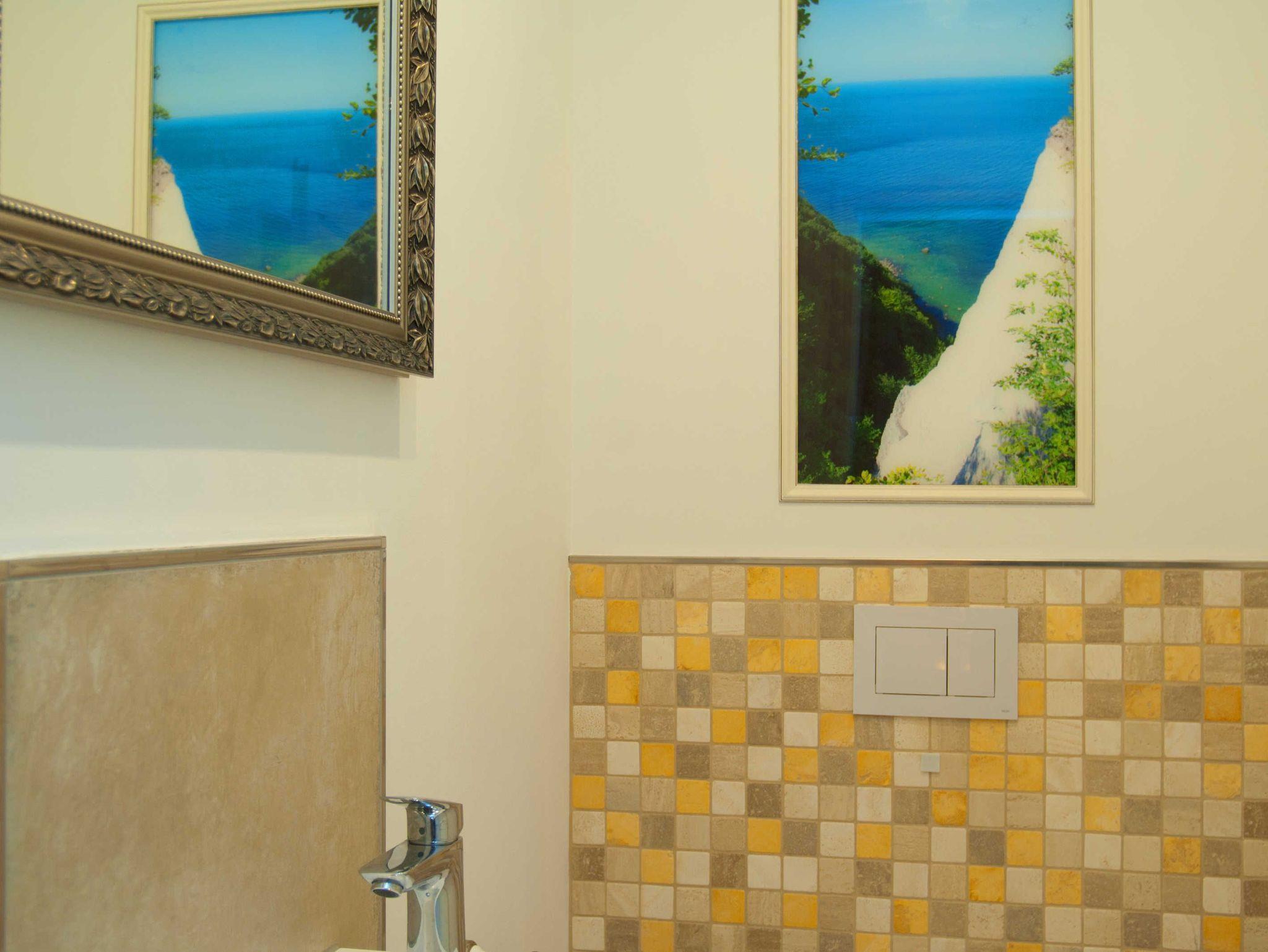 Die wunderschöne Küche im Landhaus Stil ist mit hochwertigen Markengeräten ausgestattet. Ein großer Esstisch bietet Platz für gemütliche Abende mit weitem Ausblick bis hin zur Insel Vilm. Die beiden Schlafbereiche sind mit Doppelbetten und Flachbild-TV ausgestattet. Den besonders gemütlichen Schlafbereich im Spitzboden erreicht man über eine Treppe vom Wohnzimmer. Die im Wohnbereich offene Zwischendecke mit freiliegenden Balken ist das Highlight dieser Wohnung. Zum luxuriös ausgestattete Bad mit großer ebenerdiger Regendusche gehört eine große Badewanne und ausreichend Platz. Das nicht im Bad befindliche WC ist von beiden Schlafbereichen separat zugänglich.