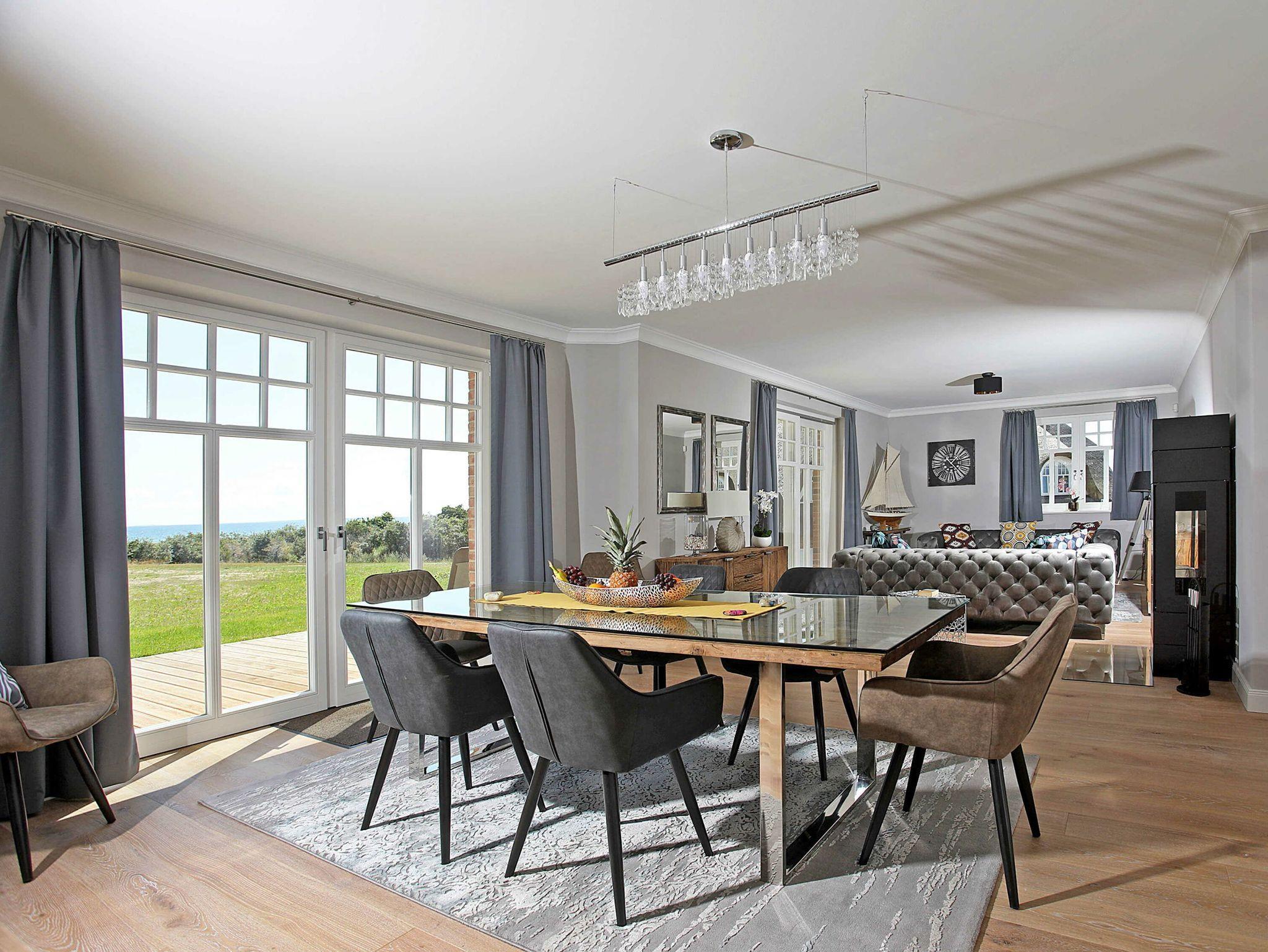 Der lichtdurchflutete Wohn- und Essbereich mit Meerblick befindet sich im Erdgeschoss. Das Wohnzimmer ist mit gemütlichen Sofas und einem LED UHD TV ausgestattet. In den kühleren Jahreszeiten verbreitet der, im Wohnzimmer eingebaute, Kamin eine besonders behagliche Atmosphäre.[nbsp] Die große integrierte Küchenzeile mit einem Backofen, einer Mikrowelle, einem Geschirrspüler, einem großen Kühlschrank mit Gefrierfach, einer Kaffeemaschine, Toaster, Wasserkocher und diversen Kleininventar lässt das Herz jeden Hobbykochs höher schlagen. Eine freistehende Kochinsel mit Sitzmöglichkeit rundet das Wohnküchenflair ab.