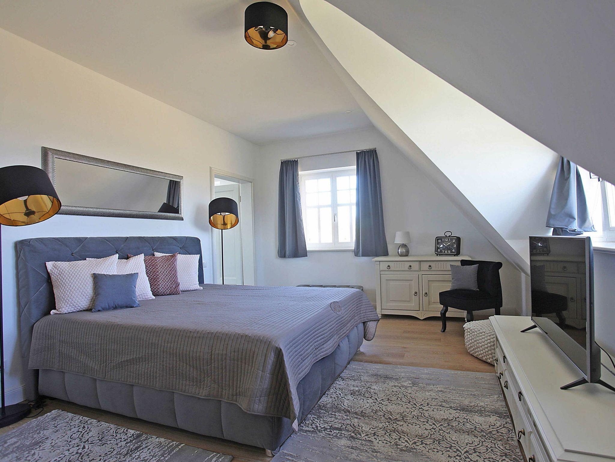 Über eine Treppe gelangen Sie in das außergewöhnlich schöne Obergeschoß. Hier erwarten Sie 3 Schlafzimmer - 2 davon mit einem Doppelbett (Box-Spring-Betten mit durchgehendem Topper) der Größe 180x200 cm sowie einem eigenen TV. Die beiden Schlafzimmer mit den Doppelbetten haben einen direkten Zugang zum jeweiligen Bad inklusive Meerblick.