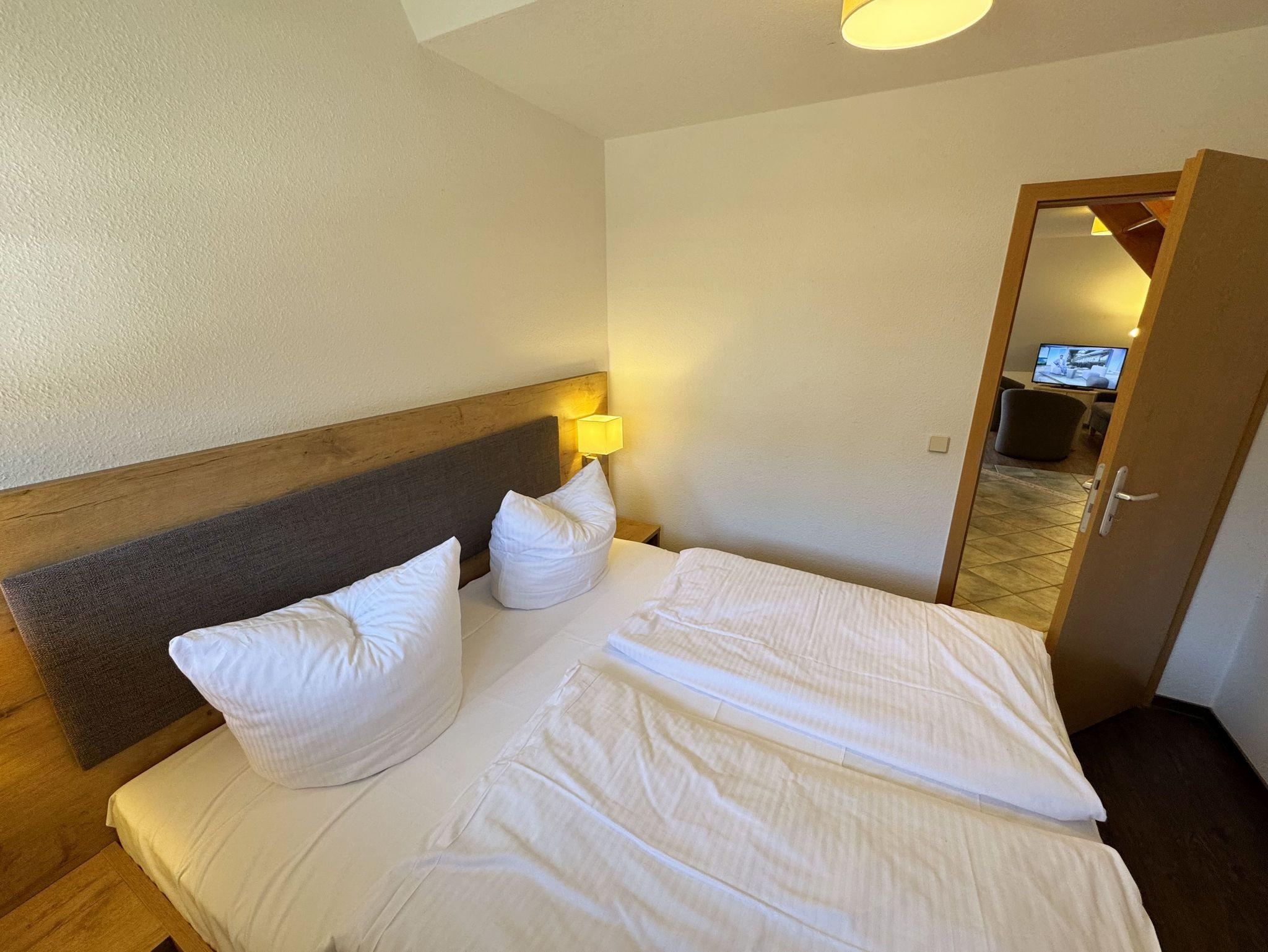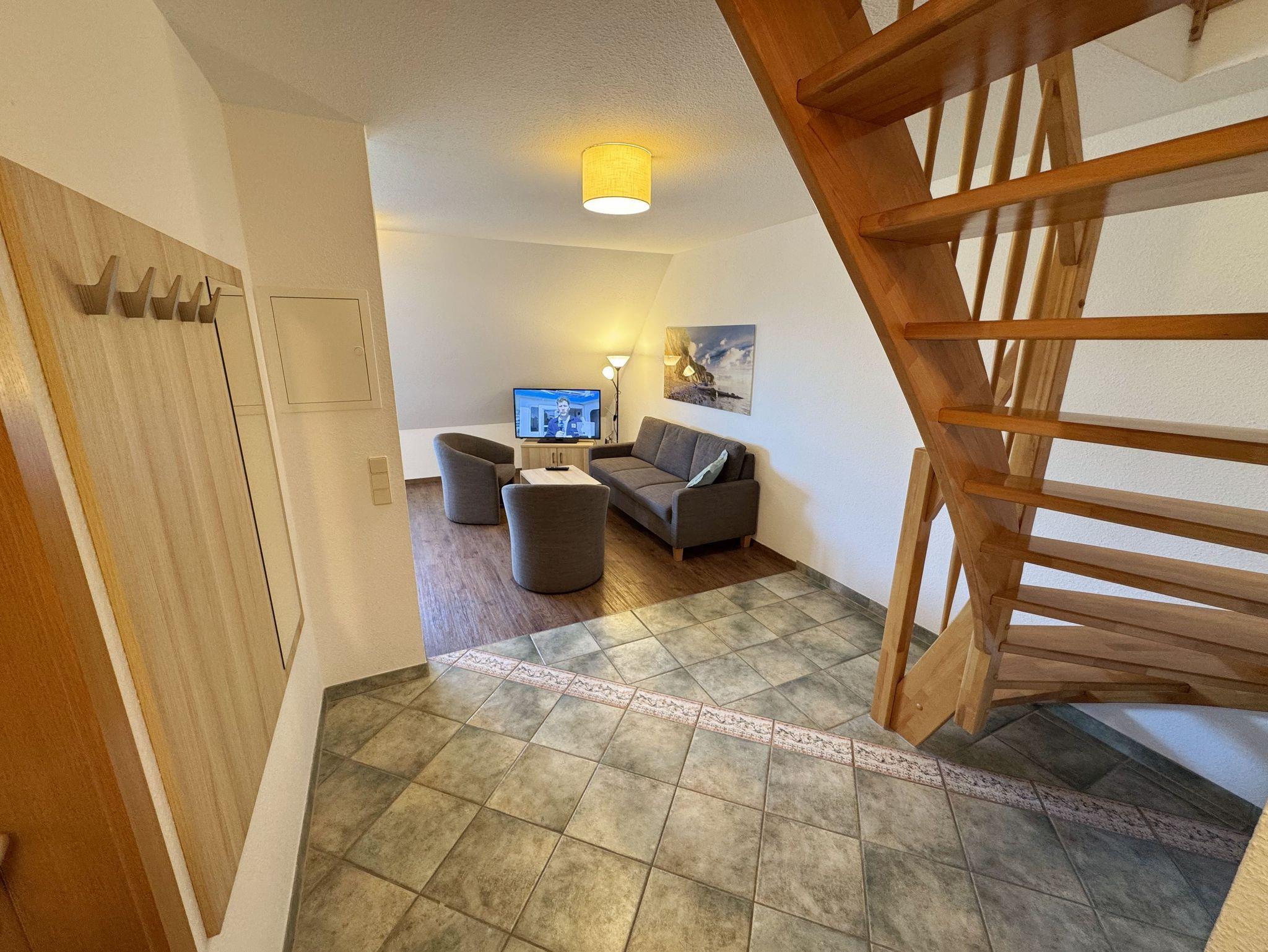 Die lichtdurchflutete Drei-Zimmer-Ferienwohnung Nr. 10 befindet sich im Obergeschoss des Hauses. Die Nichtraucherwohnung ist ausgelegt für max. 4 Erwachsene und 1 Kleinkind bis 3 Jahre im Kinderreisebett. Die Wohnung erstreckt sich mit ihren 62 qm über zwei Etagen. Über eine Holztreppe im Wohnbereich gelangen Sie in das offene Schlafzimmer mit zwei Einzelbetten (je 0,90m x 2,00m), Nachttischkonsolen und 2 Highboards. Hier bietet sich ausreichend Platz, um ein Kinderreisebett aufzustellen. Vom Eingangsbereich betritt man über den Flur, ausgestattet mit einem Kleiderschrank, den liebevoll gestalteten Wohn- und Essbereich, der auch eine vollausgestatte Küchenzeile beherbergt. Der großzügig gestaltete und freundlich eingerichtete Wohnbereich verfügt über eine gemütlich Couch, zwei Sessel, einen Flachbild-TV, ein DAB-Radio sowie einen Esstisch mit vier Stühlen. Unmittelbar an den Wohnbereich grenzt die Küchenzeile mit Geschirrspüler, Kühlschrank mit 3 ***Gefrierfach, Ceran-Kochfeld, Backofen, Kaffeemaschine, Toaster, Wasserkocher und diversen Küchenutensilien. Auf derselben Ebene finden Sie das 2. Schlafzimmer, welches über ein Doppelbett (mit verstellbaren Lattenrost im Kopfbereich/ 1,80m x 2,00m) sowie Nachttischkonsolen und Insektenschutzgitter verfügt. Im Bad befindet sich eine Dusche, WC, Fön, Kosmetikspiegel und ein Waschtisch. Den bestuhlten Balkon erreichen Sie vom Wohnbereich, hier können Sie einen Urlaubstag in Ruhe ausklingen lassen. Haustiere sind nicht erlaubt. Die Internetnutzung (WLAN) ist für Sie inklusive. Ein PKW-Stellplatz (Nr.10) steht Ihnen vor dem Haus zur Verfügung. Auf dem Grundstück können Sie Ihre Fahrräder abstellen. Die Erstausstattung eines Wäschepaketes (komplette Bettwäsche, 1 Duschhandtuch, 1 kleines Handtuch) können Sie bis 14 Tage vor der Anreise gegen einen Aufpreis dazu buchen oder durch eigene ergänzen. Ab 2 gebuchten Paketen erhalten Sie einmalig 1 Geschirrtuch und einen Duschvorleger dazu.