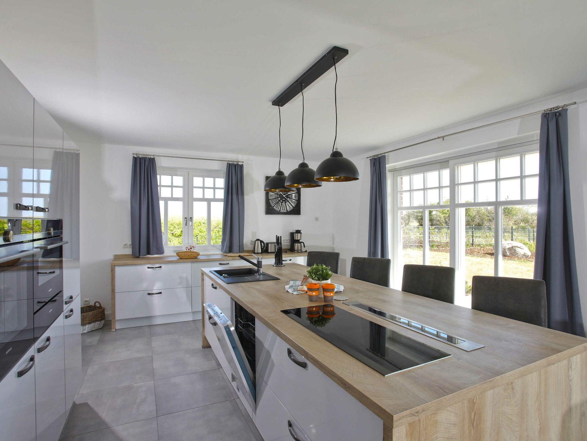 Der lichtdurchflutete Wohn- und Essbereich mit Meerblick befindet sich im Erdgeschoss. Das Wohnzimmer ist mit gemütlichen Sofas und einem LED-HD-TV ausgestattet. Wann immer Sie möchten, verbreitet der Kamin eine besonders behagliche Atmosphäre. Die große integrierte Küchenzeile mit einem Backofen, einer Mikrowelle, einem Geschirrspüler, einem großen Kühlschrank mit Gefrierfach, einer Kaffeemaschine, Toaster, Wasserkocher und diversen Kleininventar lässt das Herz jeden Hobbykochs höher schlagen. Eine freistehende Kochinsel mit Sitzmöglichkeit rundet das Wohnküchenflair ab.