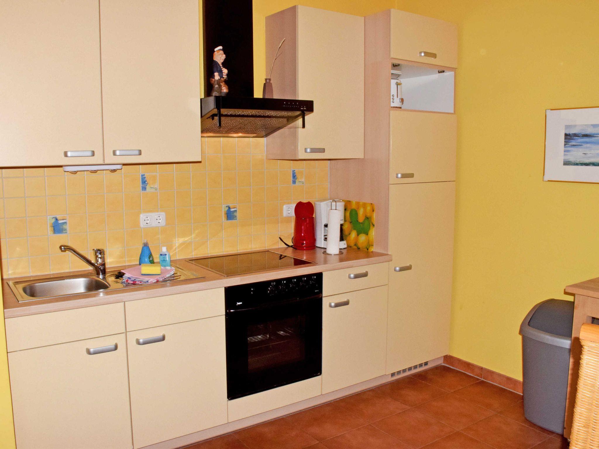 Die moderne Küchenzeile ist mit Herd, Backofen, Kaffeemaschine, Toaster, Wasserkocher und Kühlschrank komplett ausgestattet. Vom Wohnbereich aus gelangt man auf die Terrasse mit Gartenmöbeln, Strandkorb und in den Gemeinschaftsgarten.