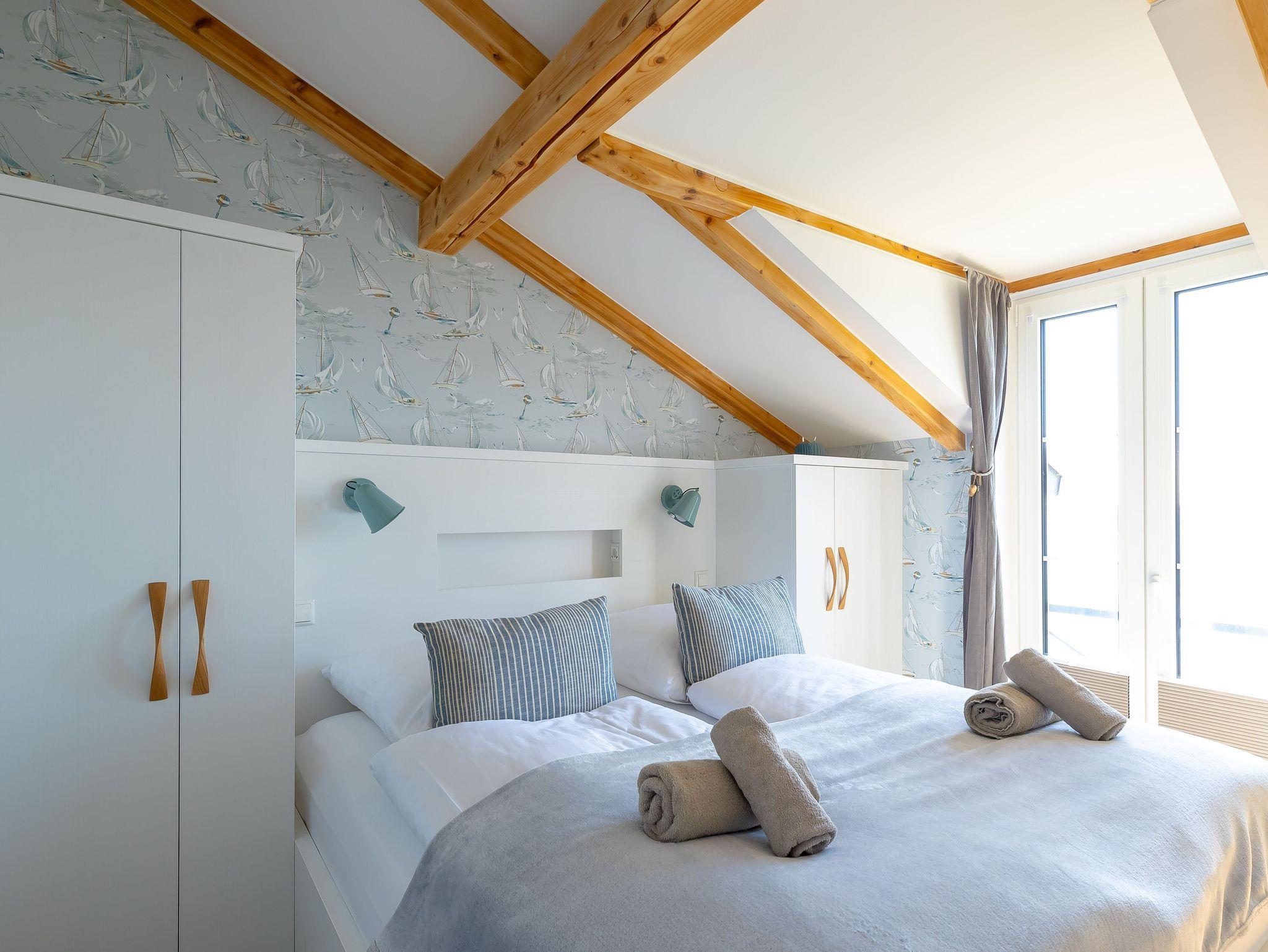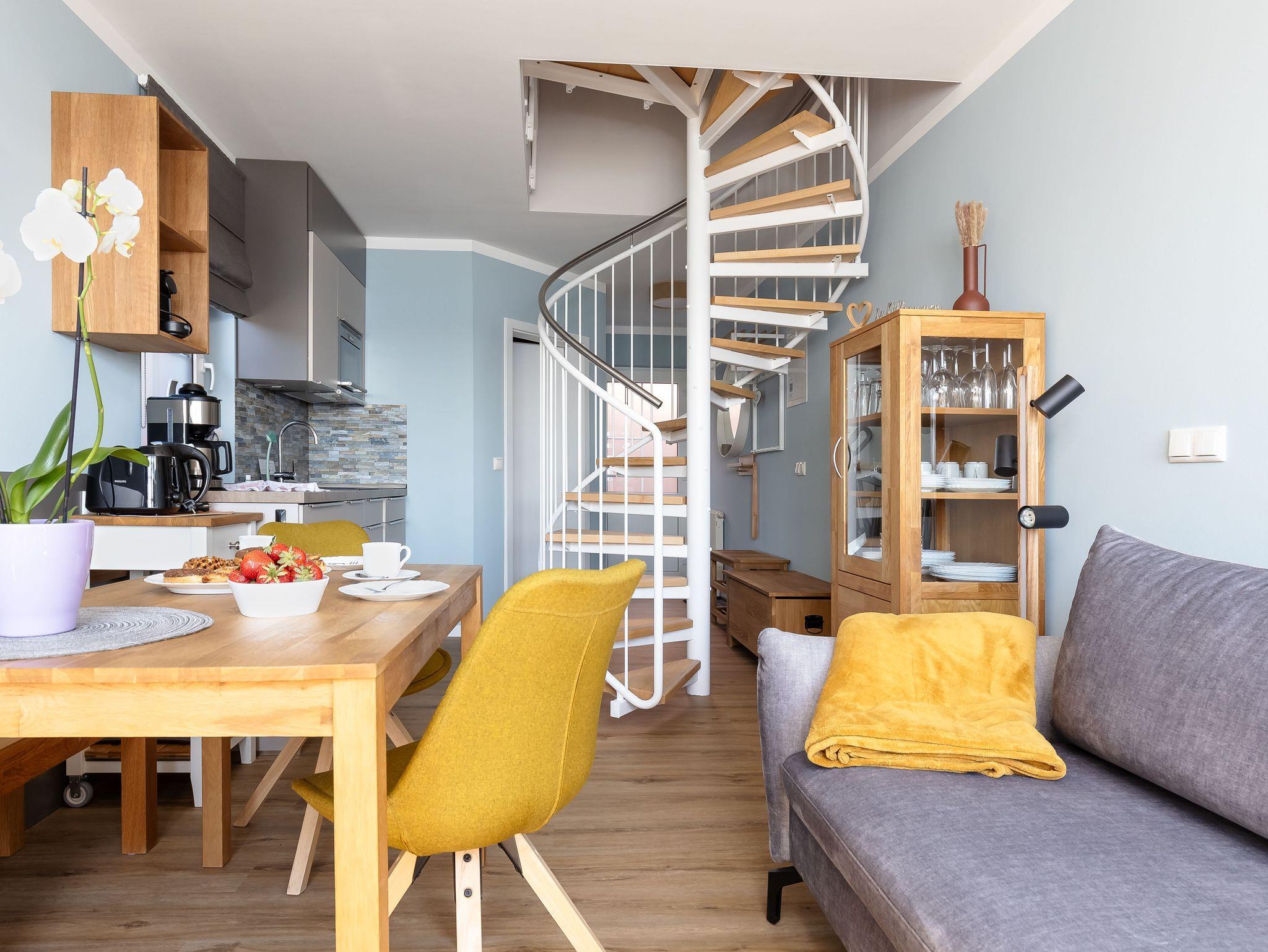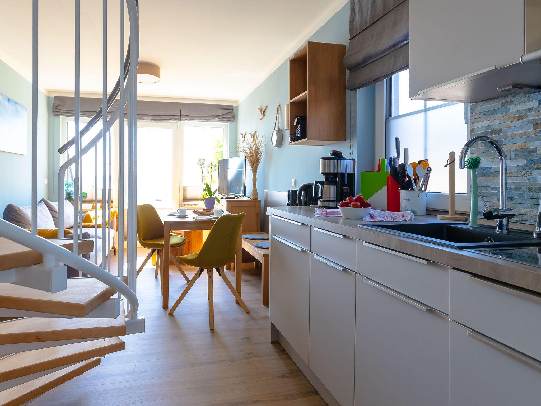 Die modern und liebevoll eingerichtete Wohnung 3 im Haus Seeblick im Maisonette-Stil verfügt über eine sonnige Terrasse mit offenem Seeblick, zwei separate Schlafbereichen im Obergeschoss, sowie einem hellen Wohnbereich mit offener Küchenzeile. Sie umfasst ca. 42qm. Genießen Sie einen unverwechselbaren Seeblick ? direkt beim Aufstehen! Der komfortable Wohnbereich mit Couch + Couchtisch, einen Sessel, einer Stehlampe, eine Kommode mit Flachbild-TV sowie eine Vitrine bietet Ihnen einen gemütlichen Ort zum Ausklingen der erlebnisreichen Tage auf der Halbinsel Mönchgut. Von hier aus gelangen Sie auf die sonnige und bestuhlte Terrasse (Süden) mit Sonnenschirm und einem einzigartigen Seeblick. Angrenzend befindet sich eine offene und voll ausgestattete Küchenzeile mit Spülmaschine, Kühlschrank mit Eisfach, Dunstabzugshaube, Wasserkocher, Kaffeemaschine, Nespresso Maschine, Toaster, Induktionsfeld und Mikrowelle und ein Essplatz. Im Obergeschoss befinden sich die beiden Schlafräume, die jeweils mit einem komfortablen Doppelbett (1,80m x 2,00m) und Kleiderschrank ausgestattet sind. Auf der unteren Ebene befindet sich das freundliche Tageslicht-Bad mit einer ebenerdigen Dusche, ein WC, ein Fön sowie ein Waschplatz mit dazugehörigem Spiegel. Für unsere kleinen Gäste steht ein Hochstuhl sowie ein Kinderreisebett (ohne Bett Inlett/inkl. Matratze) zur Verfügung. Auch ein 4-Beiner ist mit seinem eigenen Schlafplatz gegen eine Gebühr ein gern gesehener Gast. Eine Fahrrad-Unterstellmöglichkeit steht Ihnen und allen Gästen des Hauses zur gemeinschaftlichen Nutzung kostenfrei zur Verfügung. Ihr PKW-Stellplatz befindet sich knapp 100m vom Haus entfernt und ist für Sie inklusive. Die Erstausstattung eines Wäschepaketes (komplette Bettwäsche, 1 Duschhandtuch, 2 kleine Handtücher) können Sie bis 14 Tage vor Anreise gegen einen Aufpreis dazu buchen oder durch eigene ergänzen. Ab 2 gebuchten Paketen erhalten Sie einmalig 1 Geschirrhandtuch und 1 Duschvorleger hinzu.