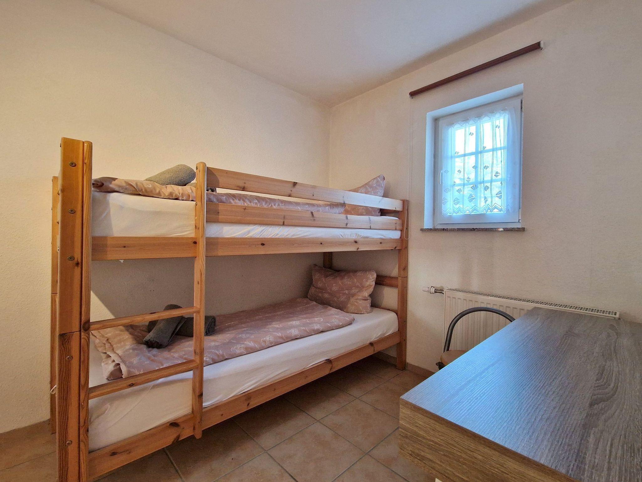 Diese Ferienwohnung mit Terrasse und separatem Kinderzimmer verfügt über einen Essbereich, Küchenzeile mit Geschirrspüler, einen Sitzbereich und ein Doppelbett. Im Kinderzimmer befindet sich ein Doppelstockbett.