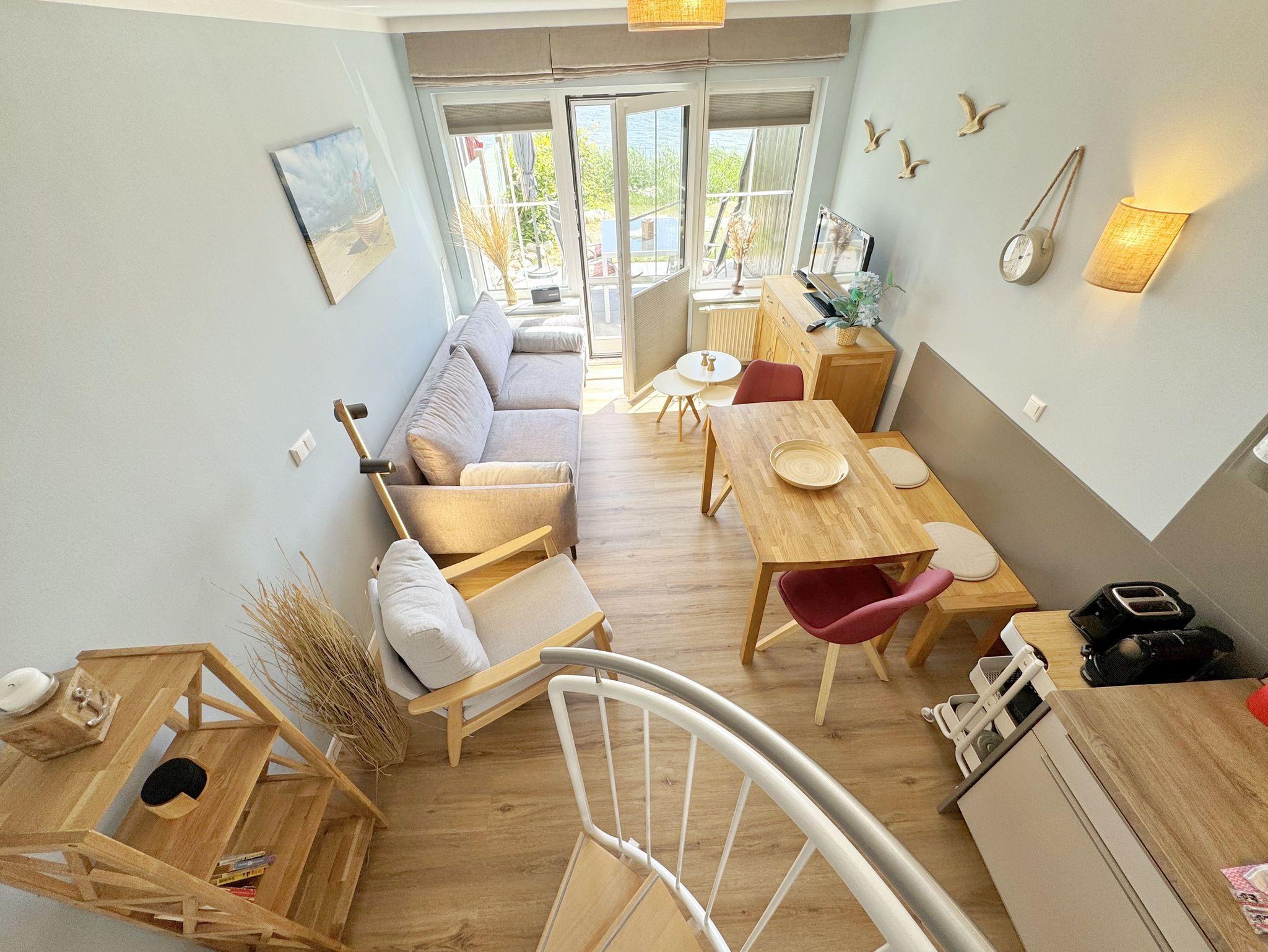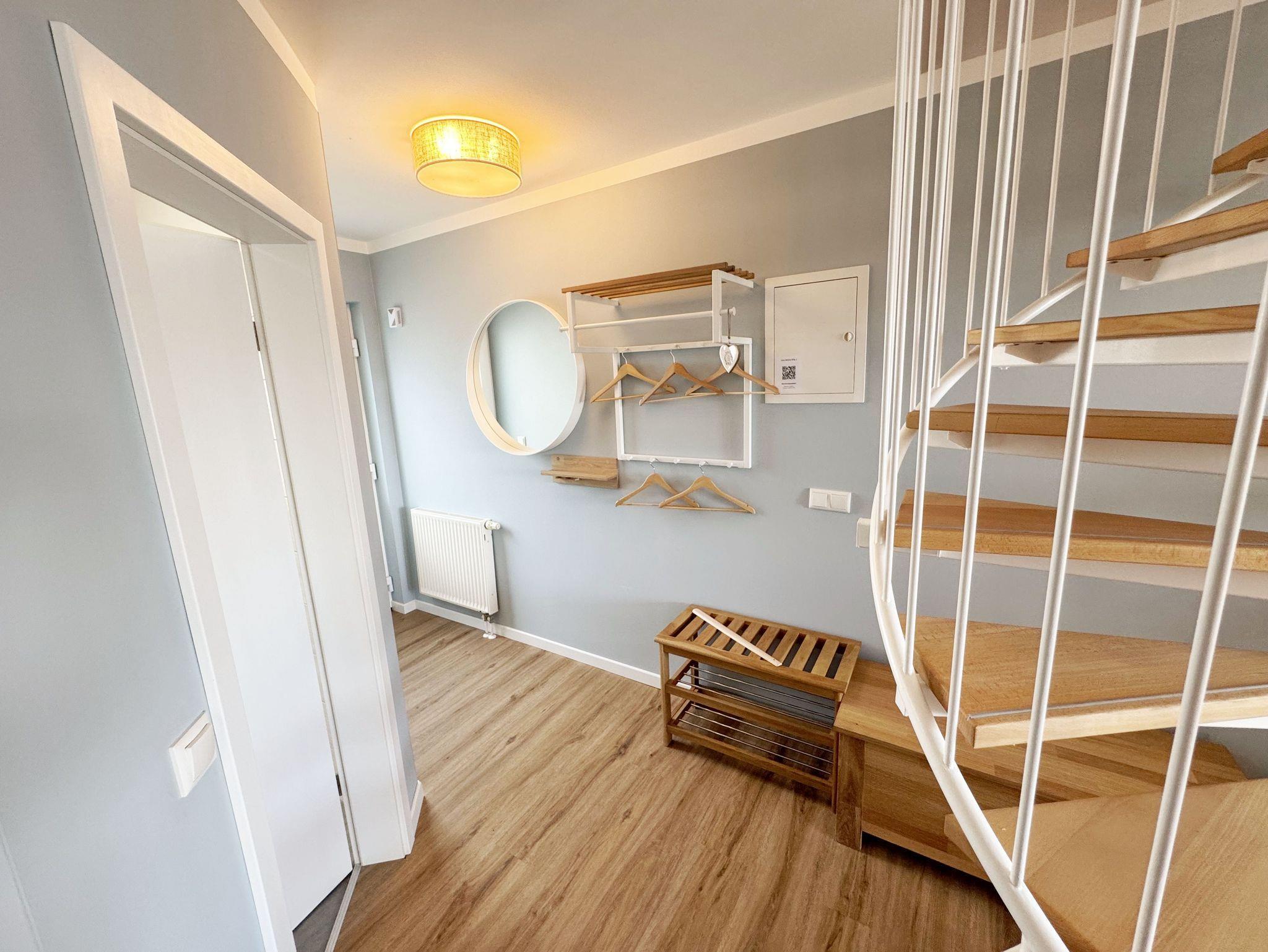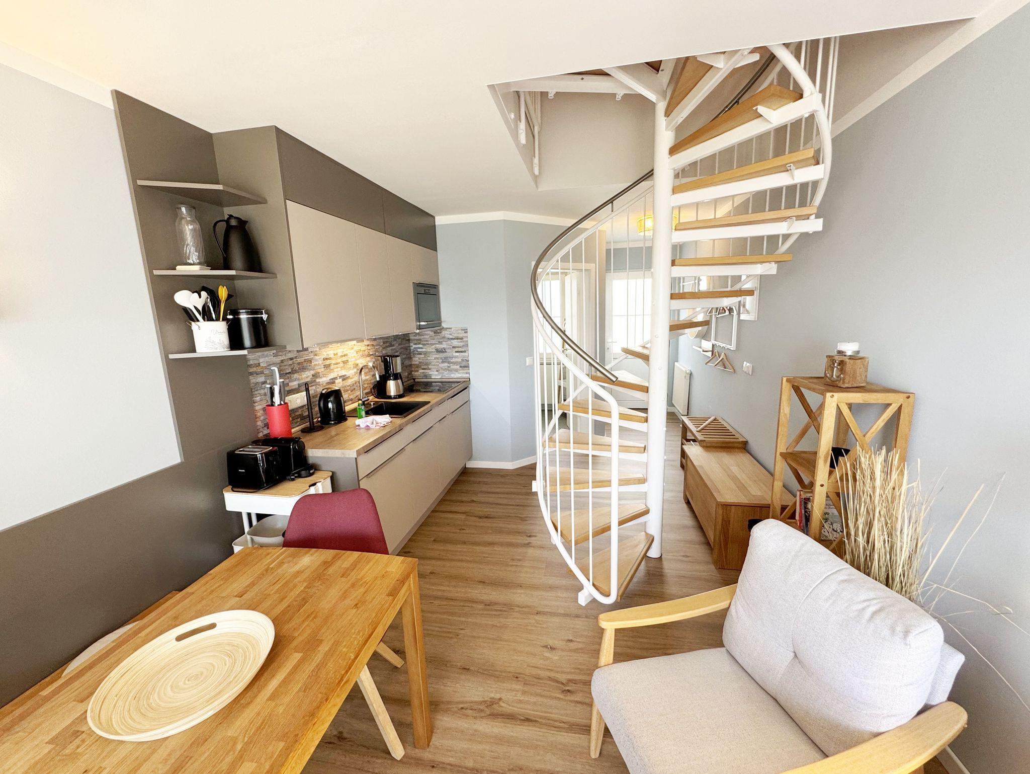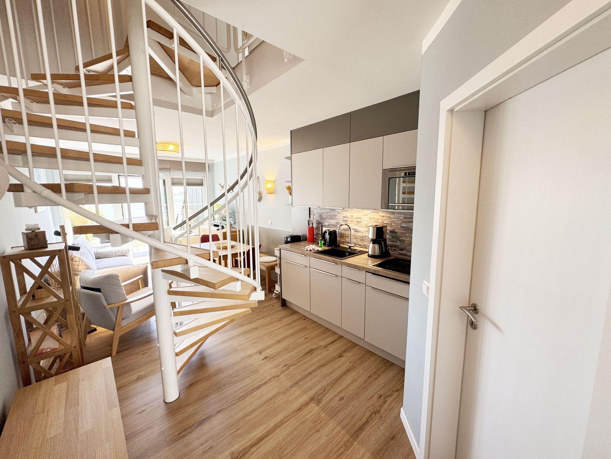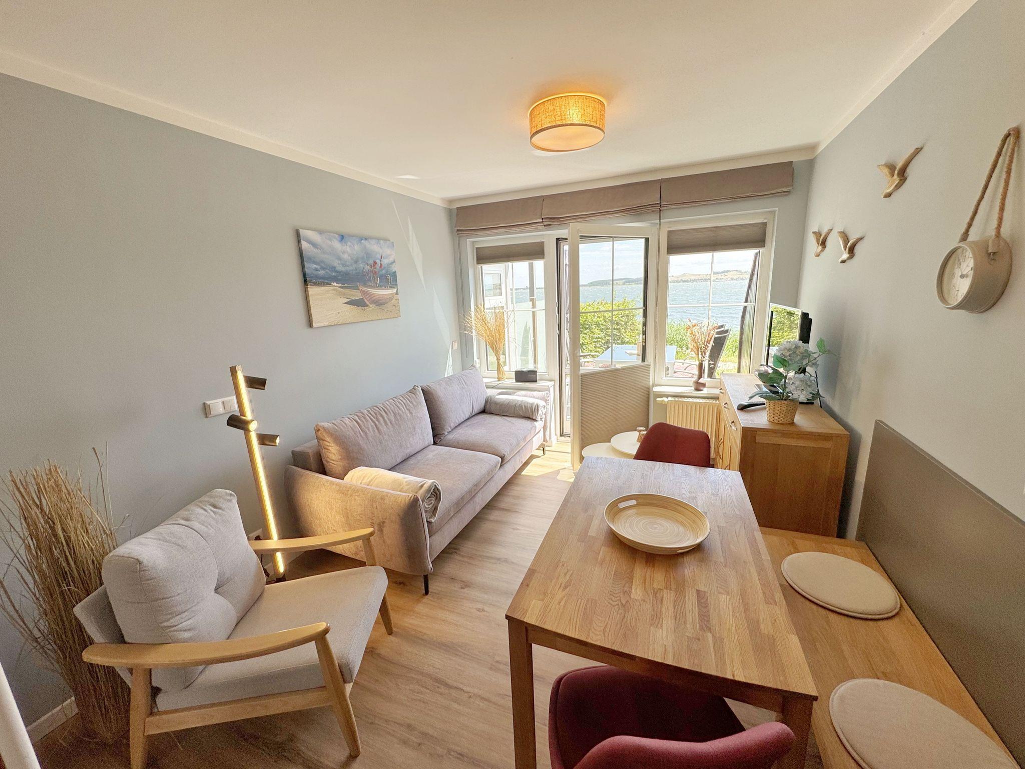 Die modern und liebevoll eingerichtete Wohnung 1 im Haus Seeblick im Maisonette-Stil verfügt über eine sonnige Terrasse mit offenem Seeblick, zwei separate Schlafbereichen im Obergeschoss, sowie einem hellen Wohnbereich mit offener Küchenzeile. Sie umfasst ca. 42qm. Genießen Sie einen unverwechselbaren Seeblick ? direkt beim Aufstehen! Der komfortable Wohnbereich mit Couch + Couchtisch, einen Sessel, einer Stehlampe, eine Kommode mit Flachbild-TV sowie ein Regal bietet Ihnen einen gemütlichen Ort zum Ausklingen der erlebnisreichen Tage auf der Halbinsel Mönchgut. Von hier aus gelangen Sie auf die sonnige und bestuhlte Terrasse (Süden) mit Sonnenschirm und einem einzigartigen Seeblick. Angrenzend befindet sich eine offene und voll ausgestattete Küchenzeile mit Spülmaschine, Kühlschrank mit Eisfach, Dunstabzugshaube, Wasserkocher, Kaffeemaschine, Nespresso Maschine,Toaster, Induktionsfeld und Mikrowelle und ein Essplatz. Im Obergeschoss befinden sich die beiden Schlafräume, die jeweils mit einem komfortablen Doppelbett (1,80m x 2,00m) und Kleiderschrank ausgestattet sind. Auf der unteren Ebene befindet sich das freundliche Tageslicht-Bad mit einer ebenerdigen Dusche, ein WC, ein Fön sowie ein Waschplatz mit dazugehörigem Spiegel. Für unsere kleinen Gäste steht ein Hochstuhl sowie ein Kinderreisebett (ohne Bett Inlett/inkl. Matratze) zur Verfügung. Auch ein 4-Beiner ist mit seinem eigenen Schlafplatz gegen eine Gebühr ein gern gesehener Gast. Eine Fahrrad-Unterstellmöglichkeit steht Ihnen und allen Gästen des Hauses zur gemeinschaftlichen Nutzung kostenfrei zur Verfügung. Ihr PKW-Stellplatz befindet sich knapp 100m vom Haus entfernt und ist für Sie inklusive. Die Erstausstattung eines Wäschepaketes (komplette Bettwäsche, 1 Duschhandtuch, 2 kleine Handtücher) können Sie bis 14 Tage vor Anreise gegen einen Aufpreis dazu buchen oder durch eigene ergänzen. Ab 2 gebuchten Paketen erhalten Sie einmalig 1 Geschirrhandtuch und 1 Duschvorleger hinzu.